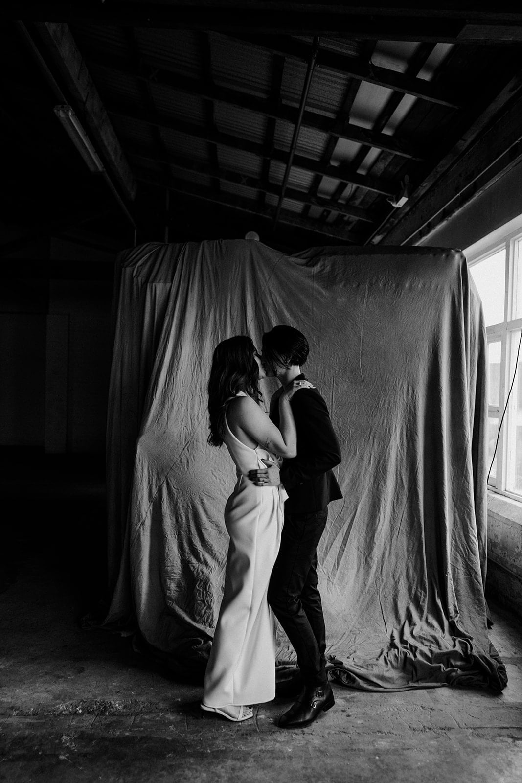 We took one glance at this industrial-style wedding complete with blood-red roses and gothic candelabras and fell into a rather deep swoon. Upon emerging, we discovered that the lovely lasses behind it were equally divine. A fashion designer by day, Amy’s bridal look is nothing short of chic central. As for Mimes, she works in theatre so that dramatic suit is on point. The result? A heckin’ masterpiece of a day. One of our fave Sydney Photographers Miko, of Tones & Harmony, was on hand snapping pics. Scroll down for. more…