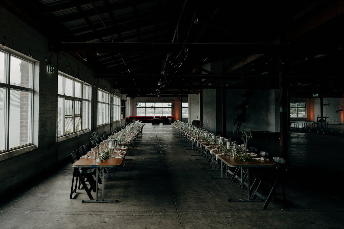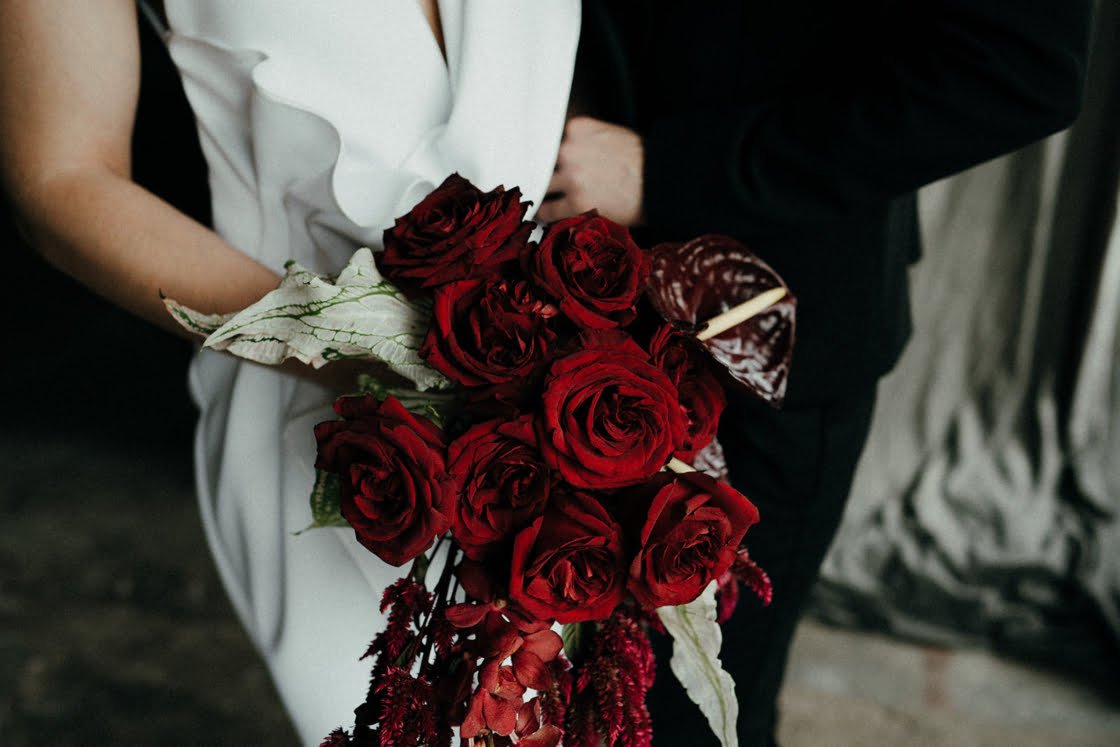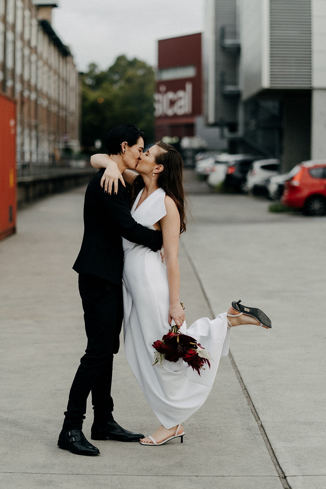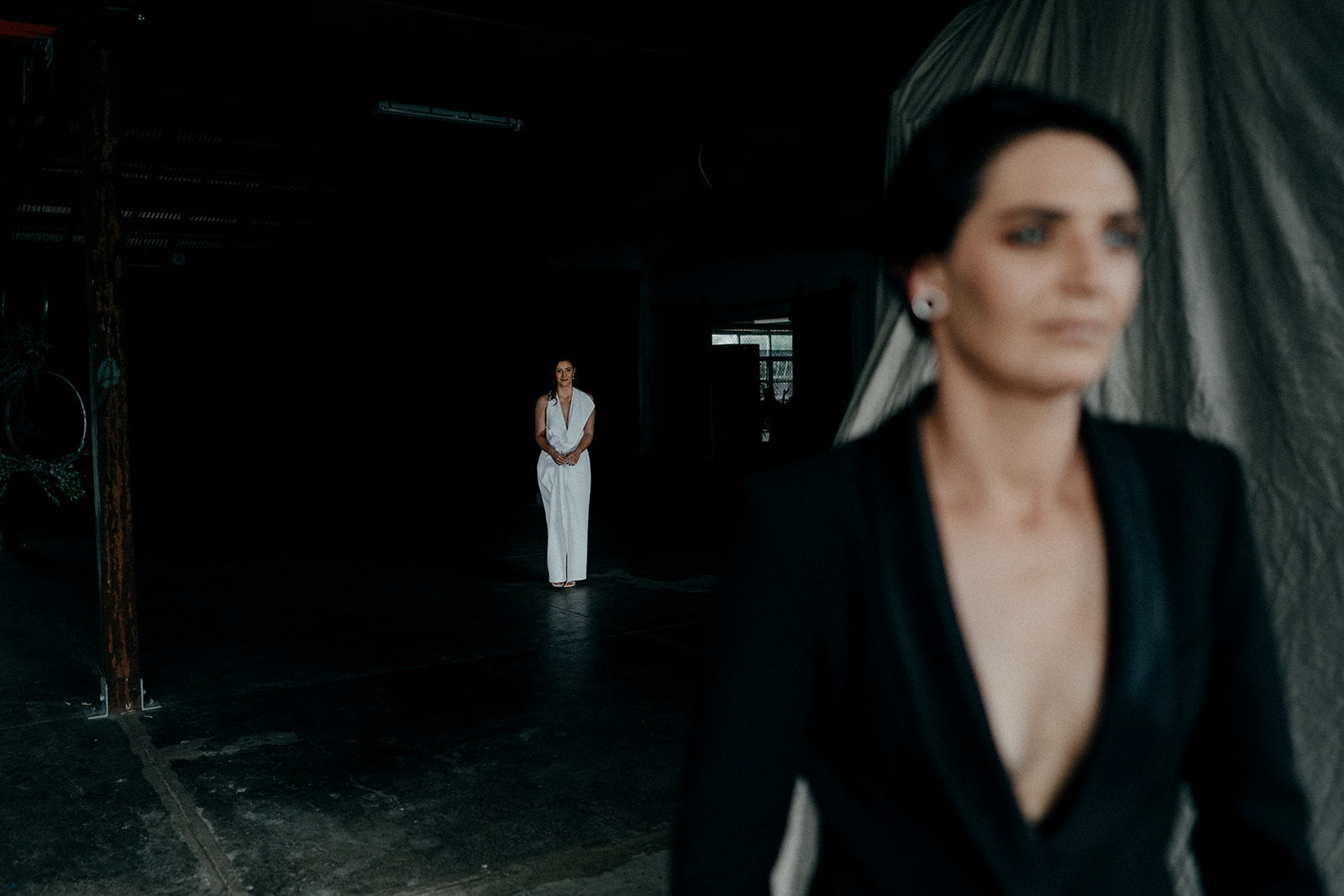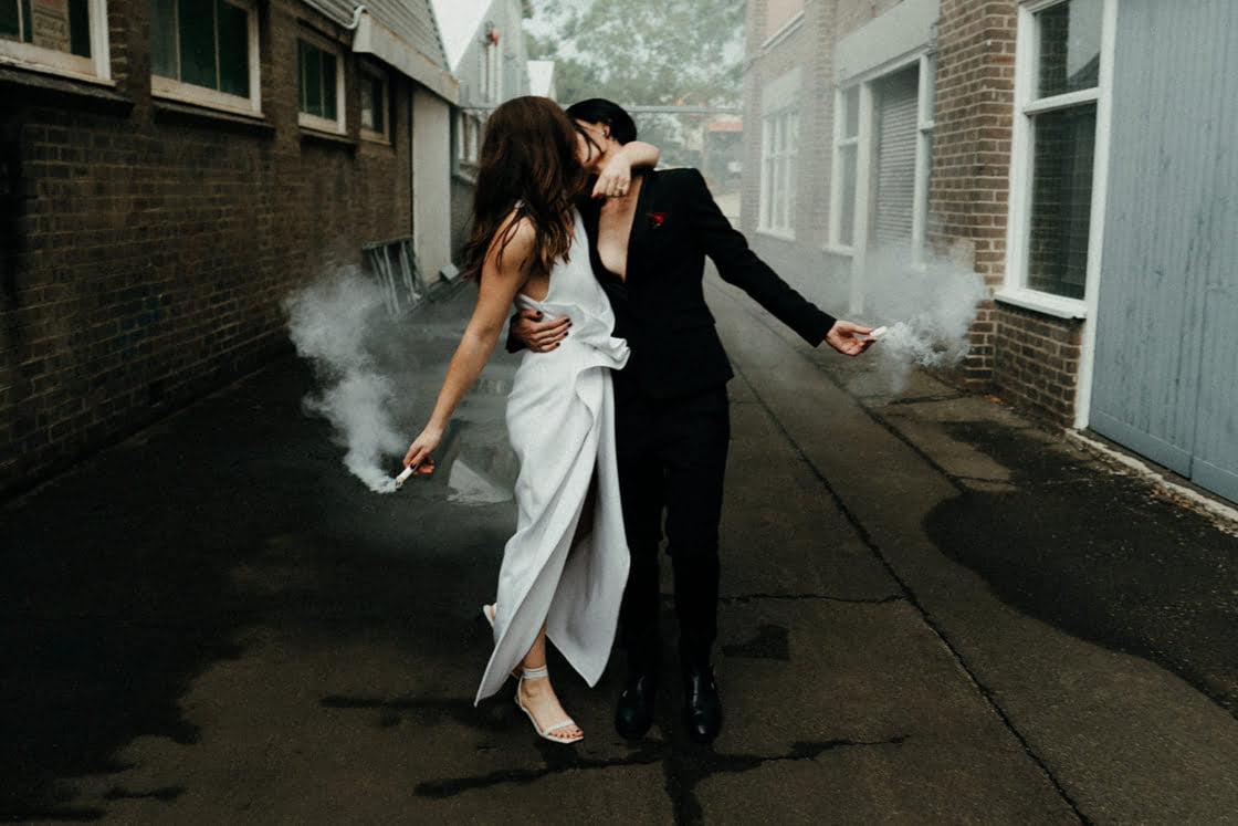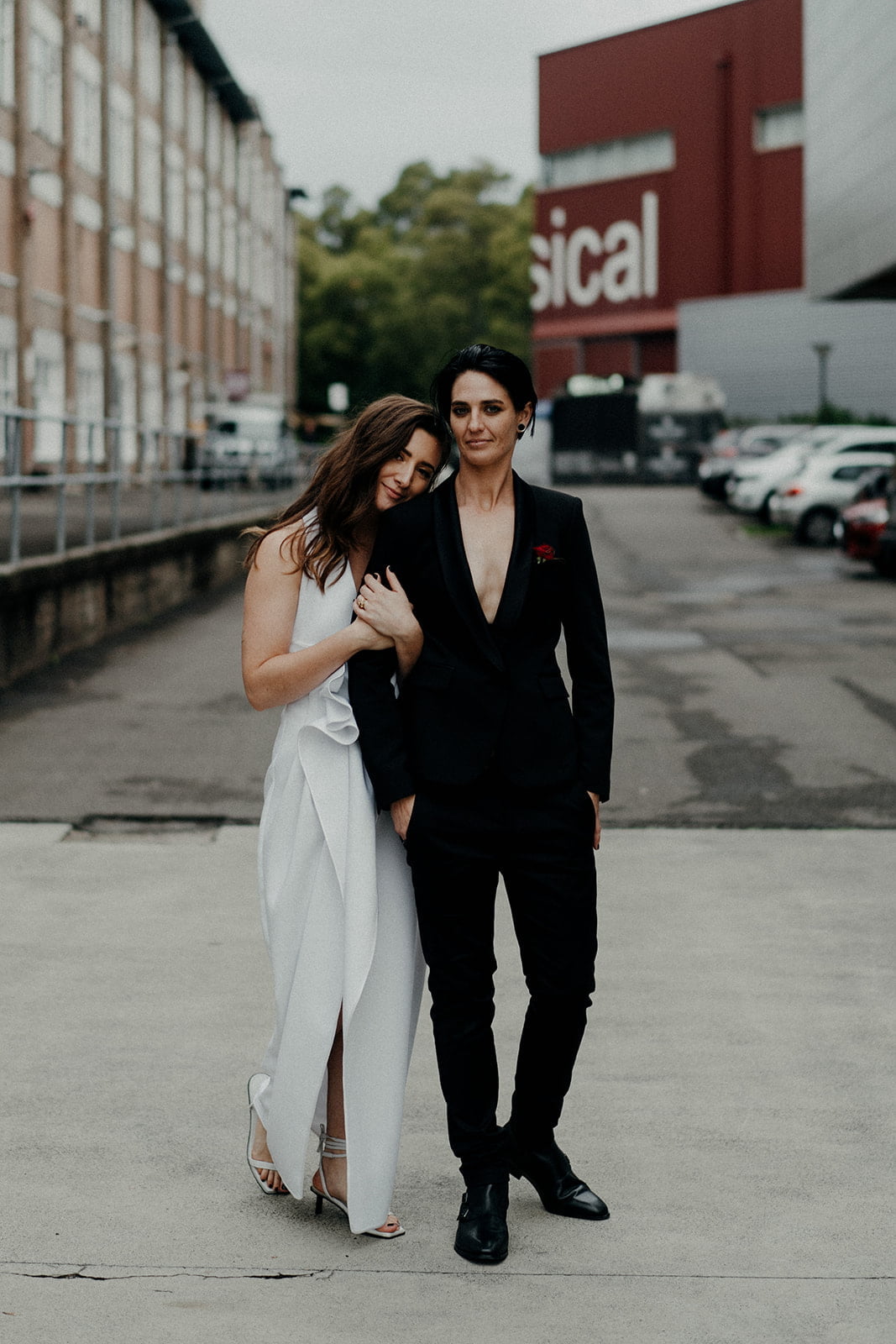 We took one glance at this industrial-style wedding complete with blood-red roses and gothic candelabras and fell into a rather deep swoon. Upon emerging, we discovered that the lovely lasses behind it were equally divine. A fashion designer by day, Amy’s bridal look is nothing short of chic central. As for Mimes, she works in theatre so that dramatic suit is on point. The result? A heckin’ masterpiece of a day. One of our fave Sydney Photographers Miko, of Tones & Harmony, was on hand snapping pics. Scroll down for. more…