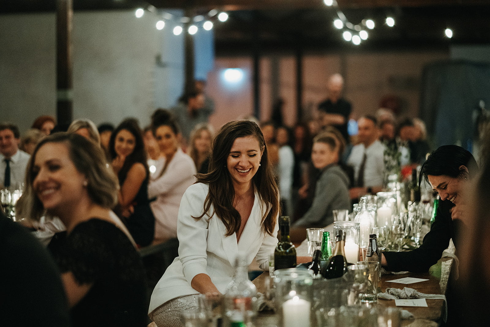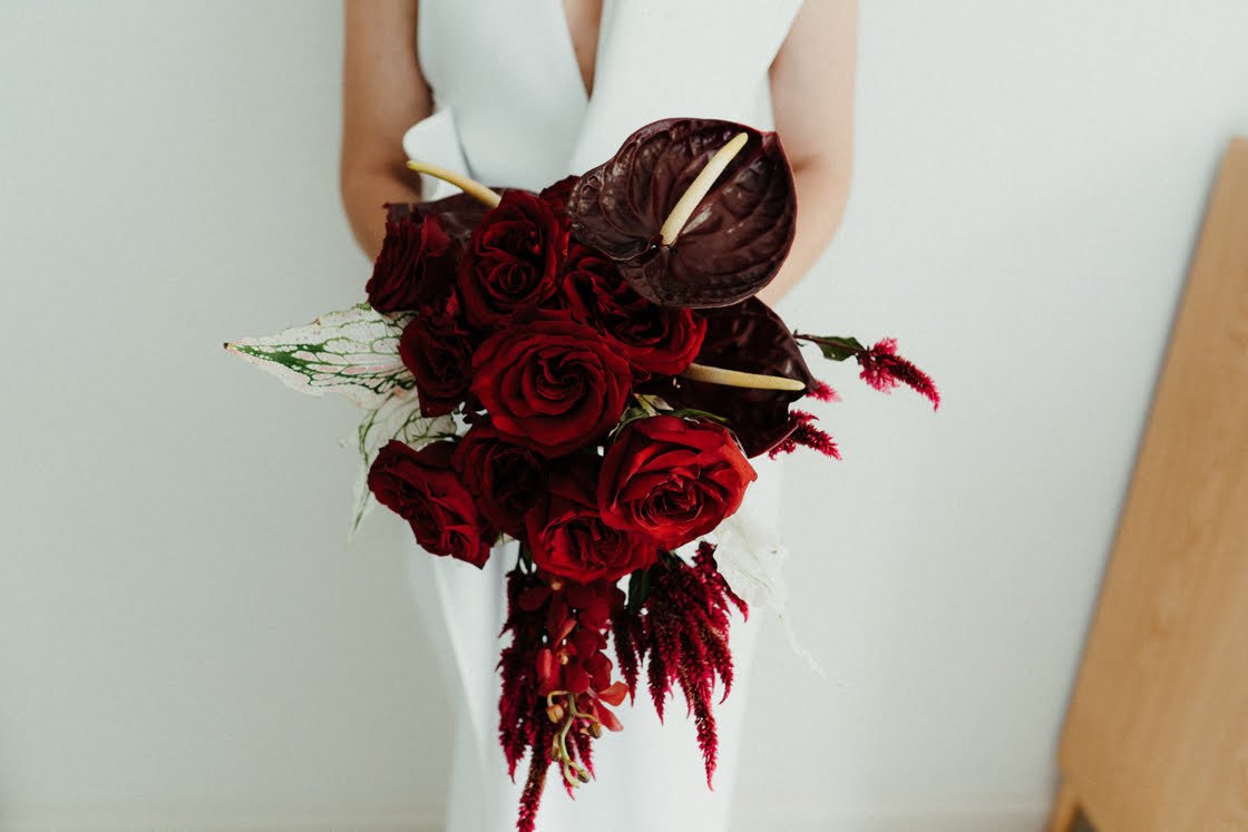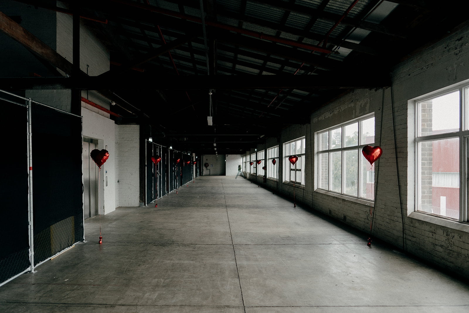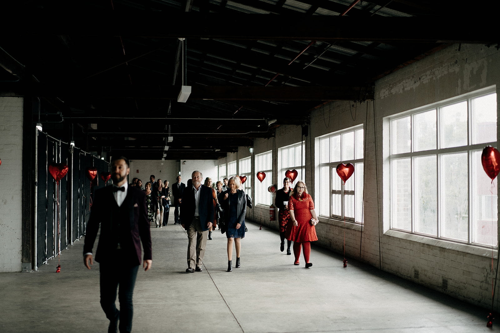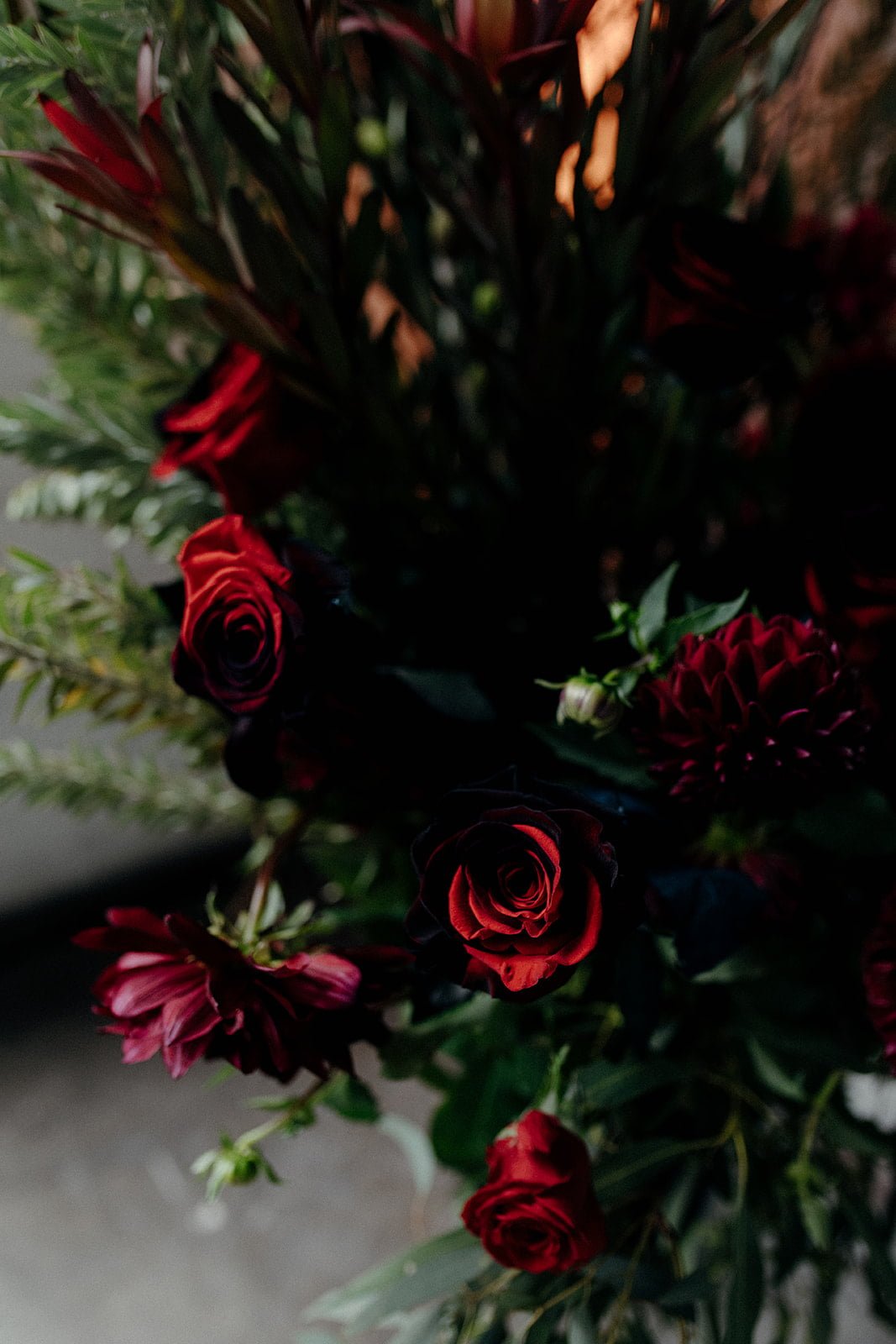 We took one glance at this industrial-style wedding complete with blood-red roses and gothic candelabras and fell into a rather deep swoon. Upon emerging, we discovered that the lovely lasses behind it were equally divine. A fashion designer by day, Amy’s bridal look is nothing short of chic central. As for Mimes, she works in theatre so that dramatic suit is on point. The result? A heckin’ masterpiece of a day. One of our fave Sydney Photographers Miko, of Tones & Harmony, was on hand snapping pics. Scroll down for. more…
