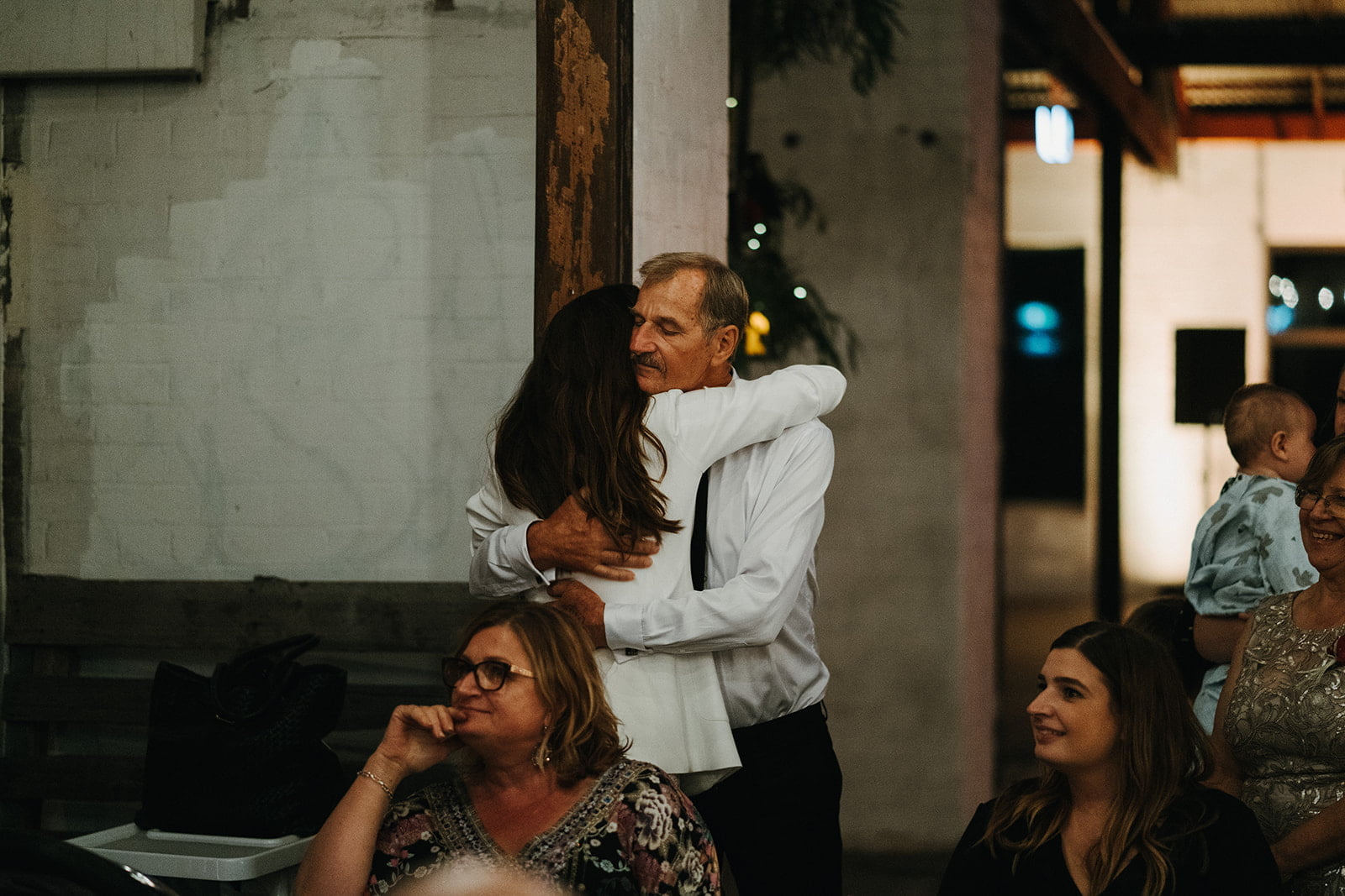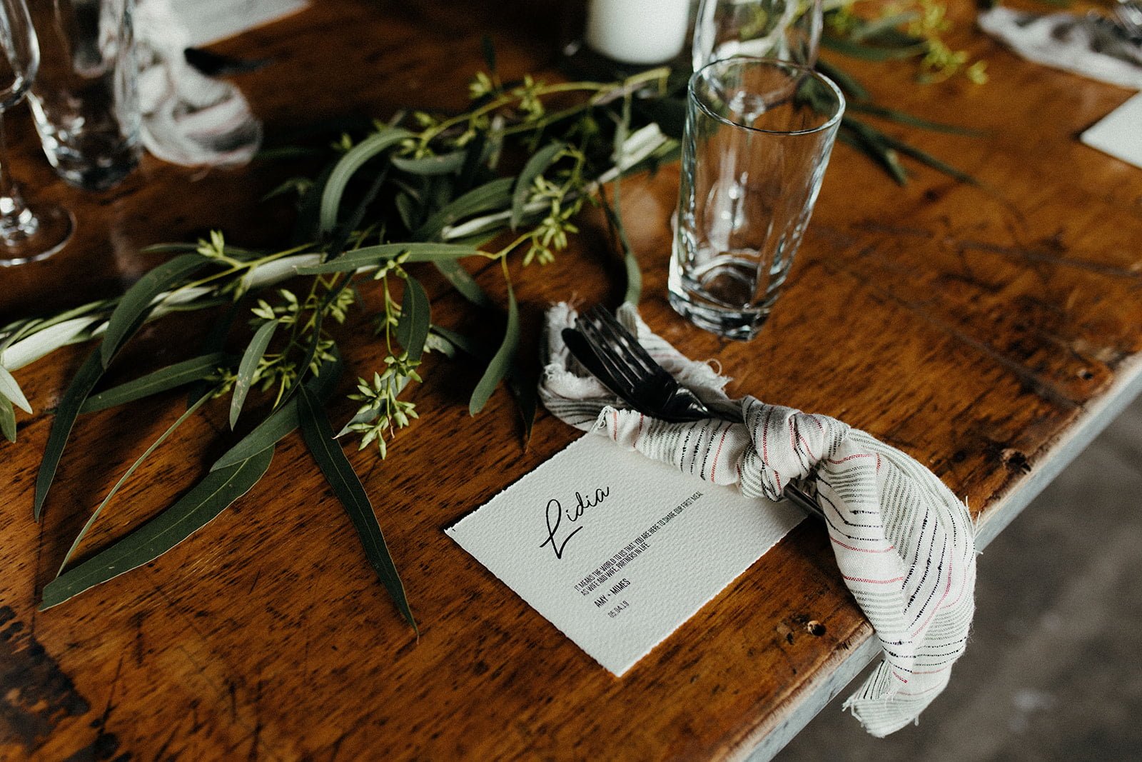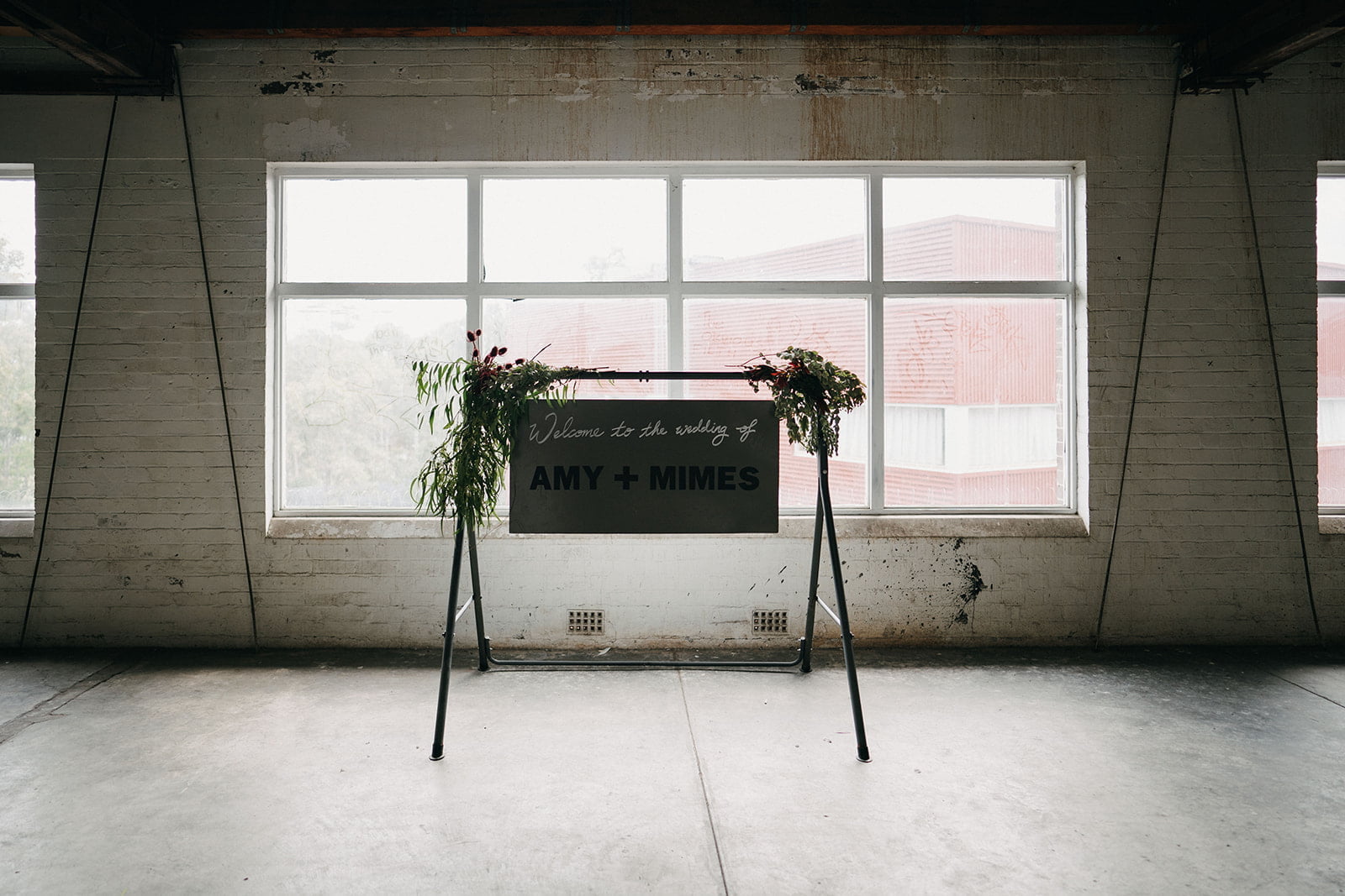 DIY “DIY is an understatement when it came to this wedding. There isn’t much we didn’t design, make from scratch or upcycle. Signs, invite website, table settings, hand-cut linen for napkins, floral arrangements, lighting … the list goes on. We borrowed from family, gumtree’d and hired the few bits and pieces we were missing. We got Mimes’ dad’s woodwork skills straight to work on a few standout pieces. Alan restored a vintage wooden fruit cart he found on gumtree for the cake stand. We sourced old mechanic oil drums from my uncle’s workshop and he turned them into bar tables to add to the industrial feel.”
