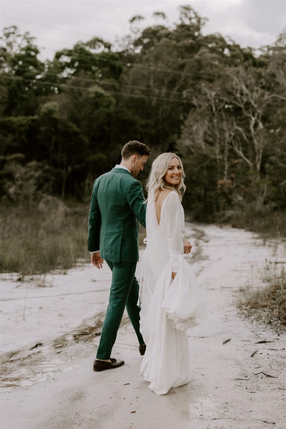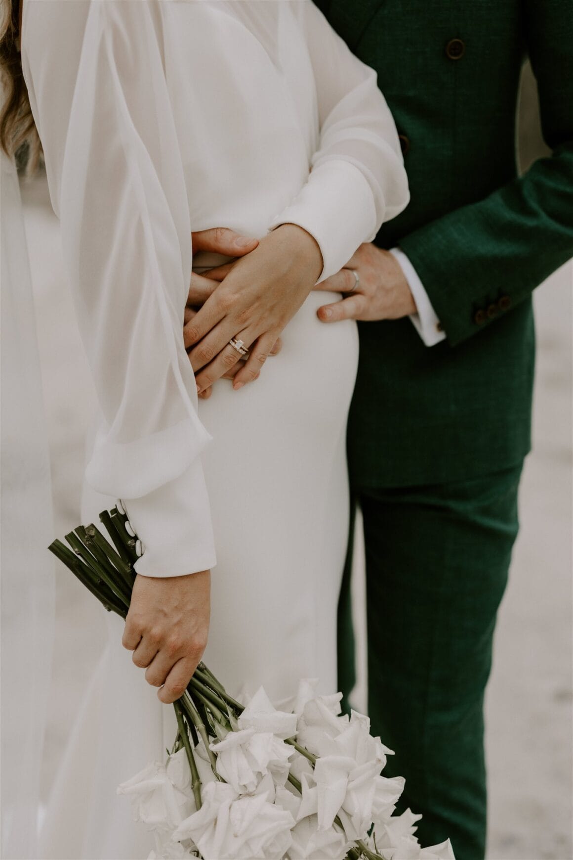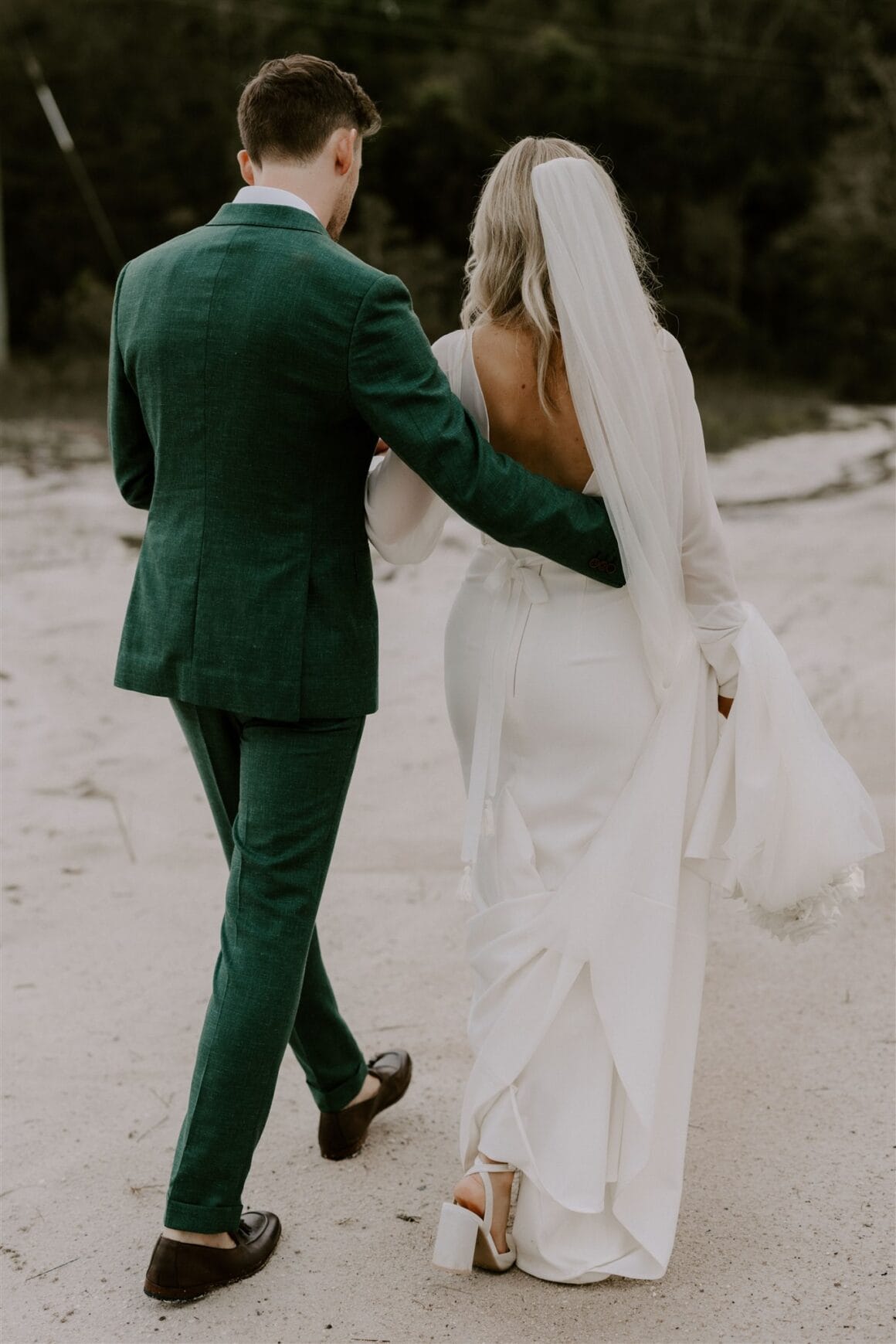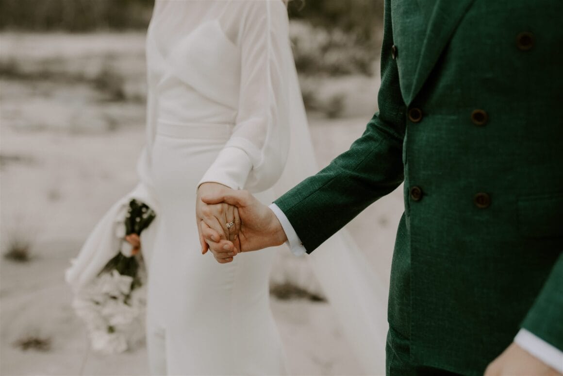 We’ve gotta say, these healthcare heroes were a sight for sore eyes. Despite it being the first she’d tried on, Amy instantly knew her Karen Willis Holmes frock was the one, and Sean sported the most epic green custom ‘fit styled with an M.J. Bale button down. It was elegant, classy, and relaxed, and the lovebirds told us that getting ready alongside family was a highlight. As was stealing some time alone while photographer Janneke Storm did her thing. “Janneke does a really good job of making you feel comfortable and natural in front of the camera.”
