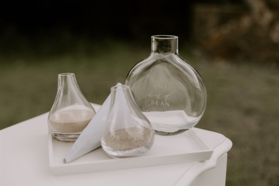 COOL CUSTOM “We had a sand ceremony, mixing sand from Ireland and South Africa, where we are both from. Amy has always had a collection of sand from places visited.”