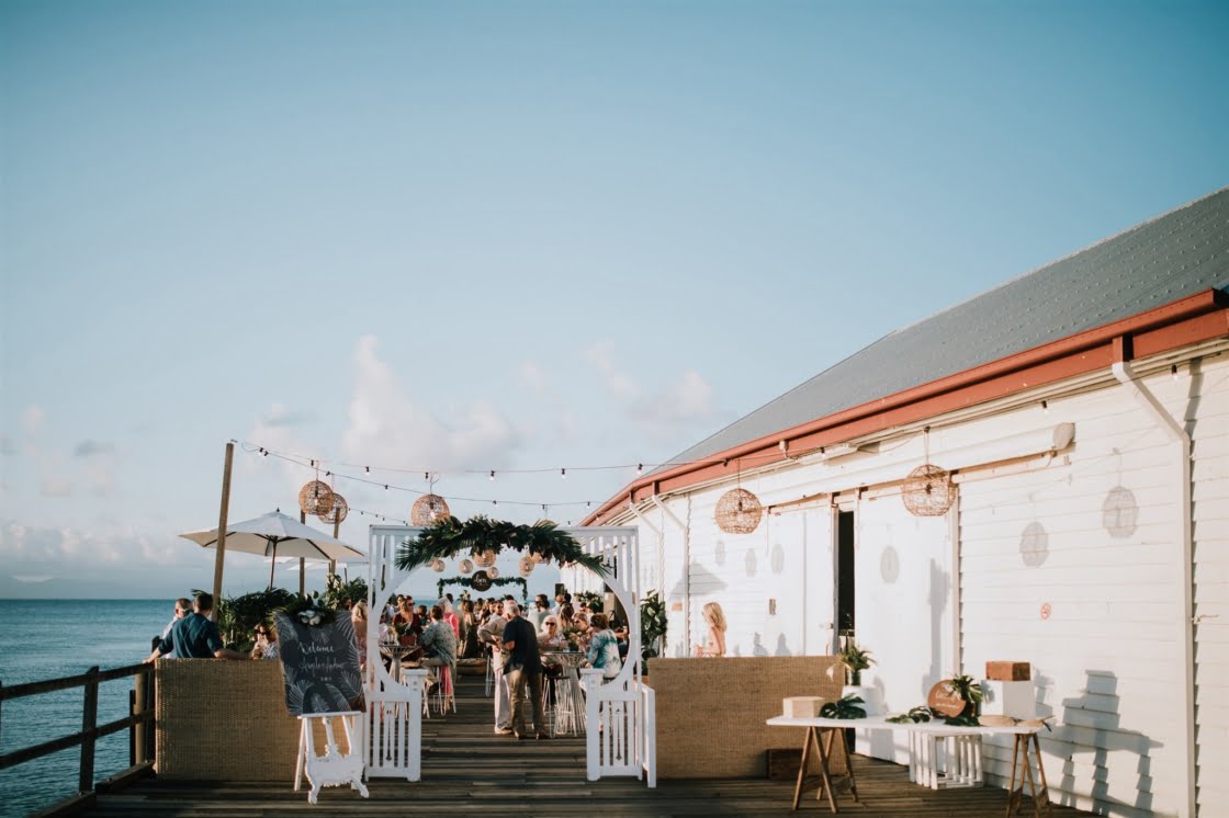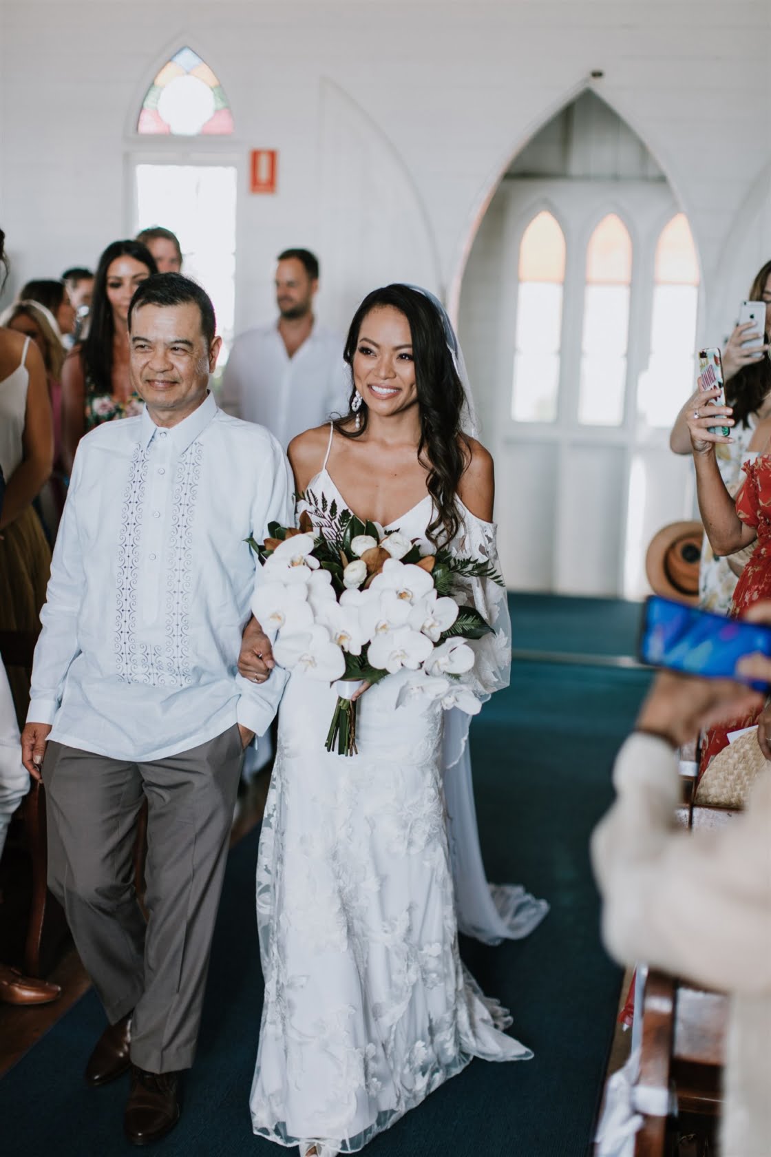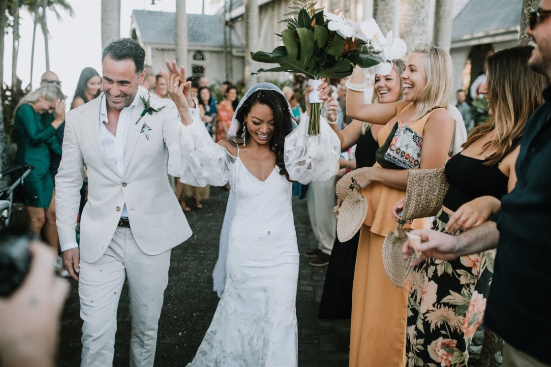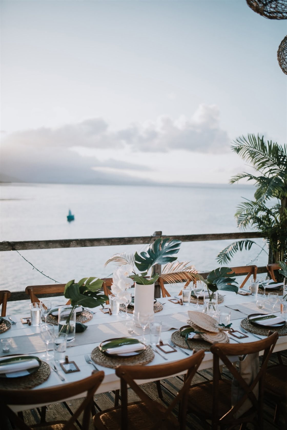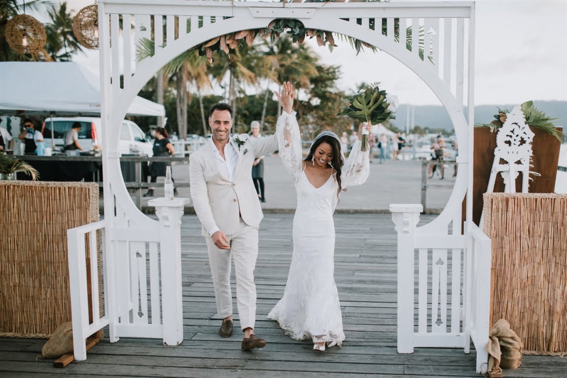 THE INSPOPort Douglas as a destination is the embodiment of tropical, laid back luxe and we just wanted to host an intimate gathering that was also one fun party with our nearest and dearest. Delicious food and a cranking dance floor were priorities along with a relaxed vibe. For our ceremony we kept things very simple with live acoustic guitar, white linen ribbons on the pews in the little white chapel underneath the palm trees. For the Sugar Wharf Port Douglas reception, we were lucky to have our planner Deb Kinsella [of Two Tribes Style via Sugar Wharf Weddings] who took our basic brief and delivered a perfect Bahamas-style dreamland of natural cane, fresh whites and lush green foliage against the backdrop of the Coral Sea.”