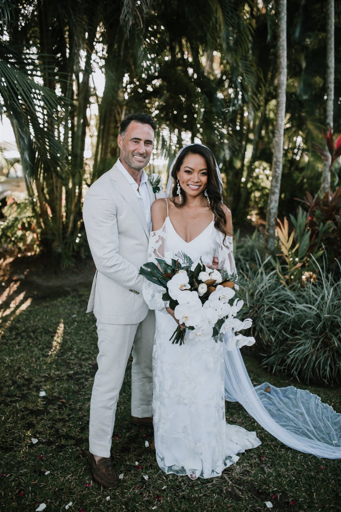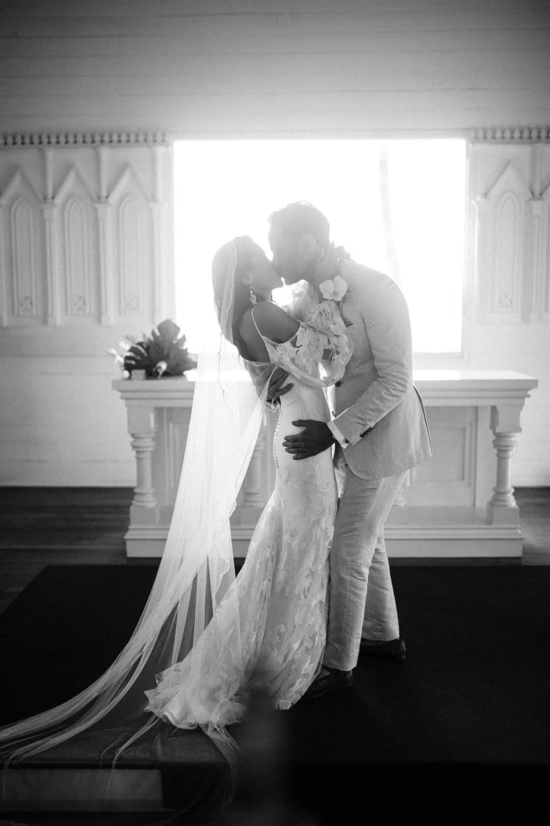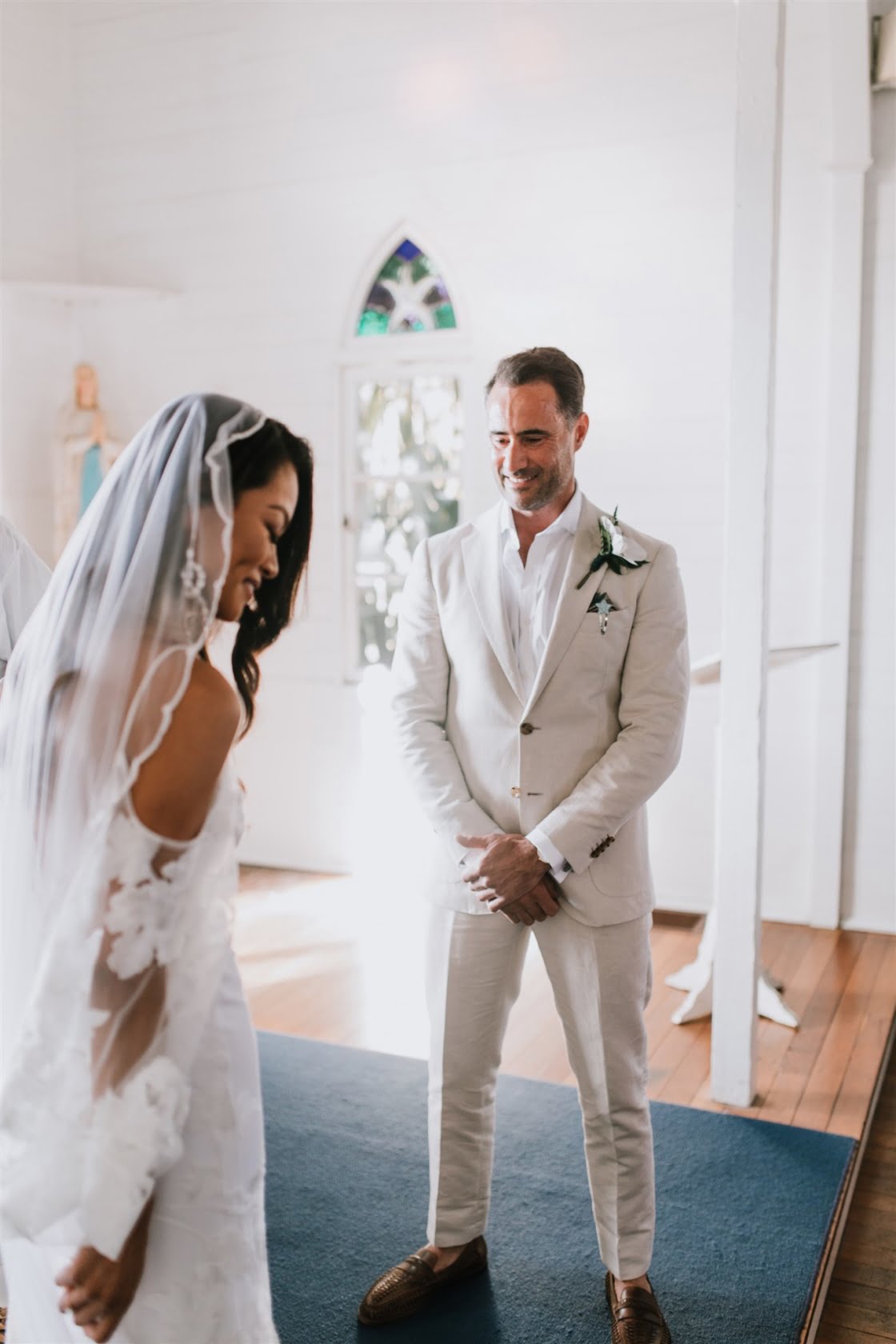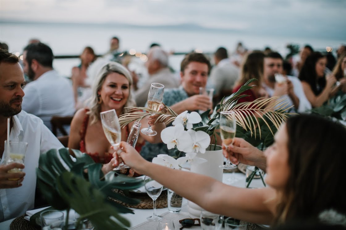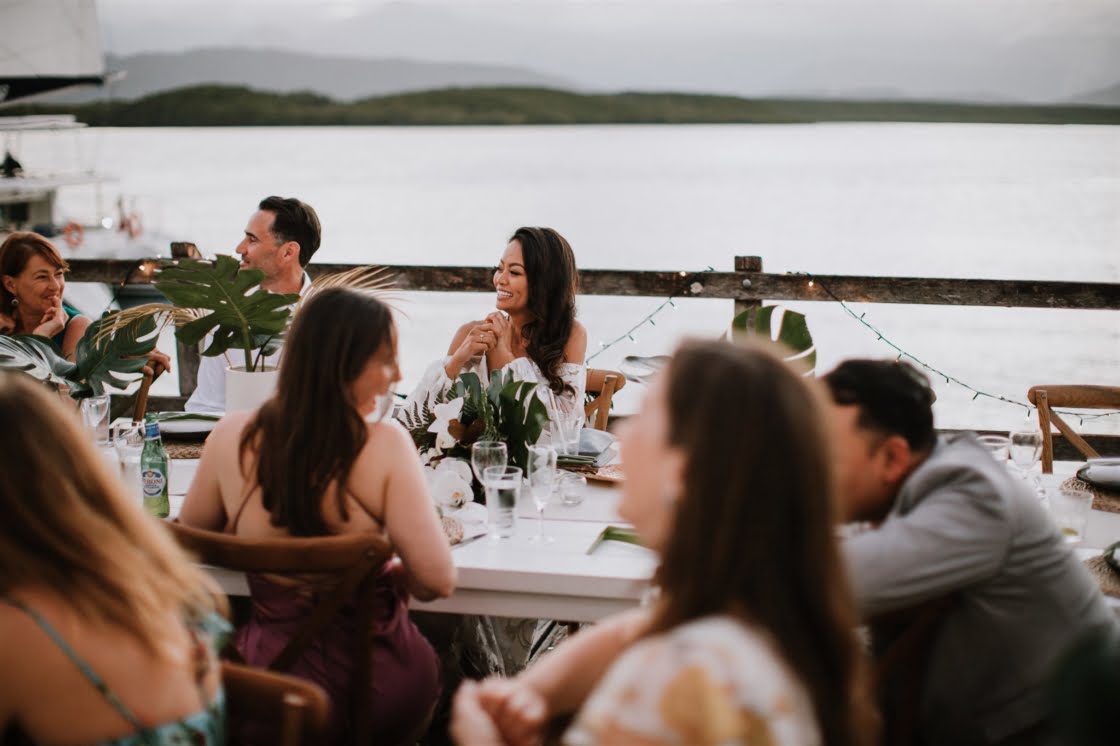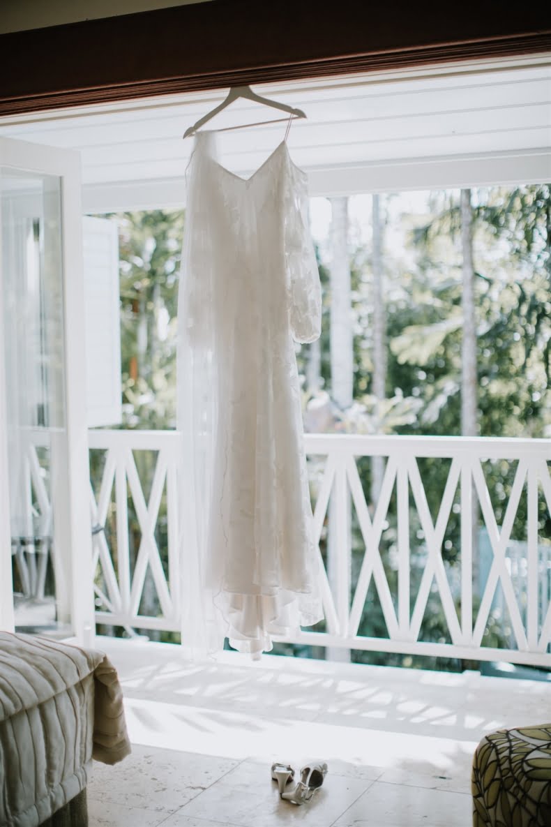 THE INSPOPort Douglas as a destination is the embodiment of tropical, laid back luxe and we just wanted to host an intimate gathering that was also one fun party with our nearest and dearest. Delicious food and a cranking dance floor were priorities along with a relaxed vibe. For our ceremony we kept things very simple with live acoustic guitar, white linen ribbons on the pews in the little white chapel underneath the palm trees. For the Sugar Wharf Port Douglas reception, we were lucky to have our planner Deb Kinsella [of Two Tribes Style via Sugar Wharf Weddings] who took our basic brief and delivered a perfect Bahamas-style dreamland of natural cane, fresh whites and lush green foliage against the backdrop of the Coral Sea.”
