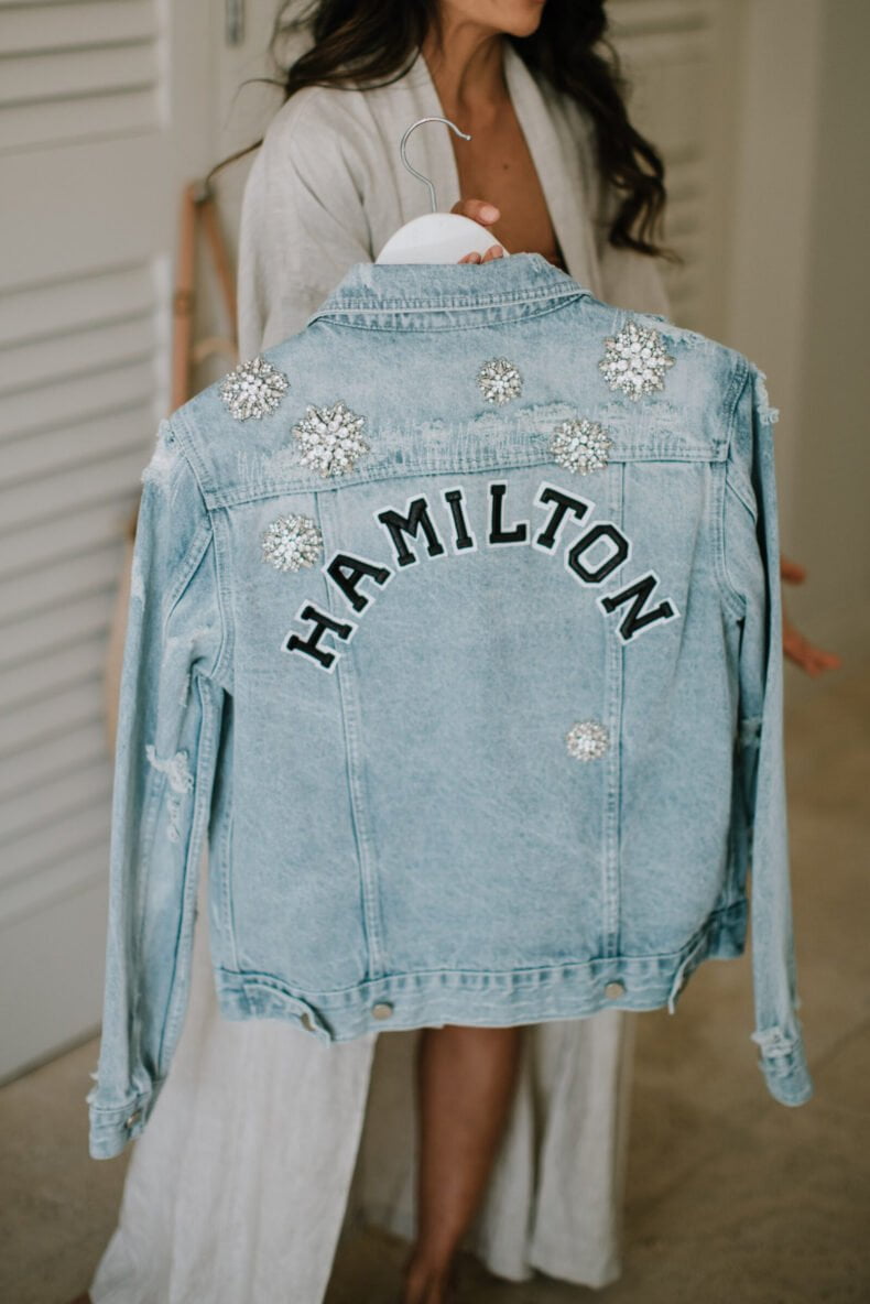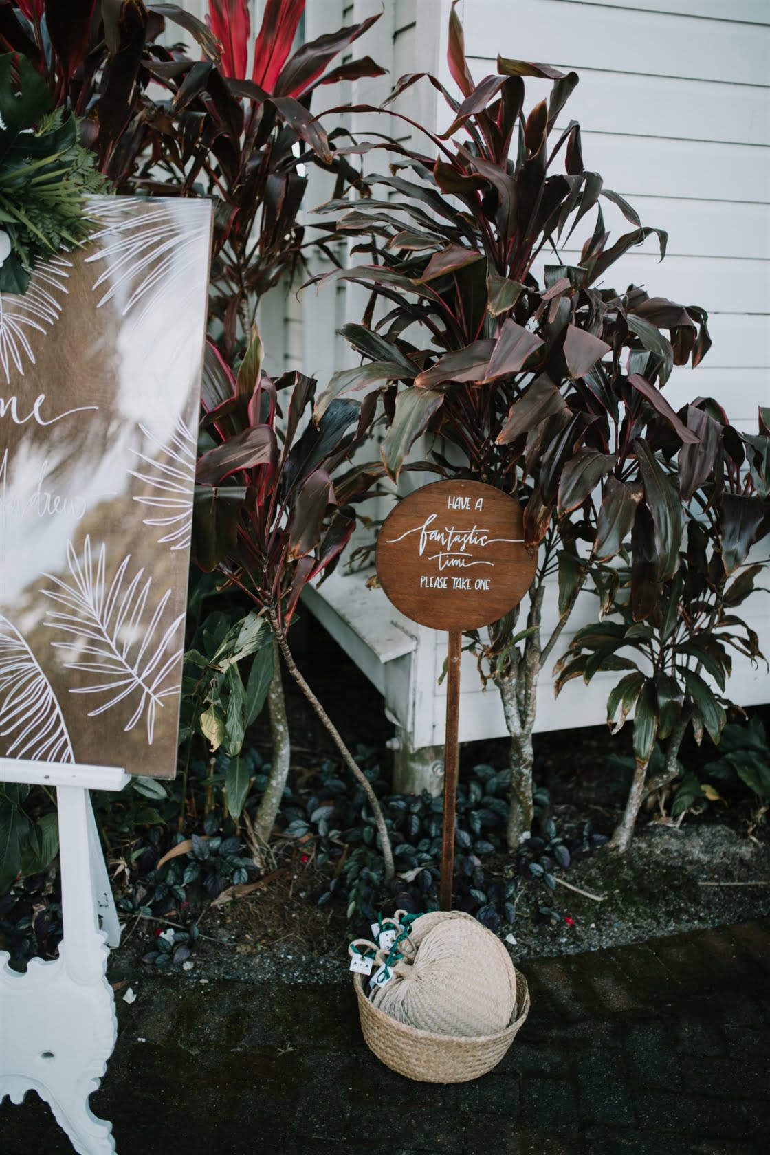 FAVE DETAILS “The woven pandan leaf fans. These were an ode to my Filipino heritage and tied in very nicely with the tropical climate. My mum and I sourced [them] from an artisan market during a trip to the Philippines. The ‘Angela + Andrew’ suspending perspex sign Deb at The Vintage Hire Co. rigged up for us. It served as an informal photobooth backdrop and we loved that you could see straight through it across the Coral Sea to the sun setting over the Daintree Mountains. Another favourite personal element was my customised denim jacket [Chosen by KYHA], which I was lucky enough to win in a Hello May competition 10 months before the wedding!”