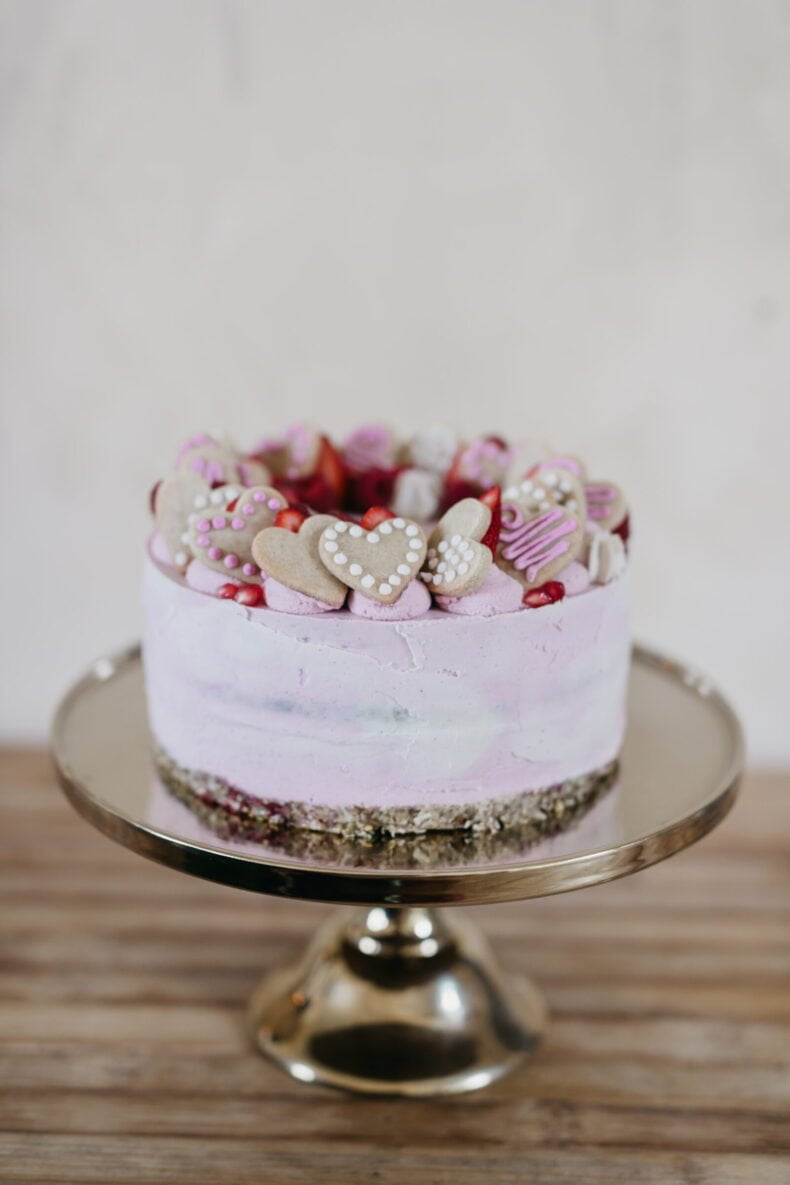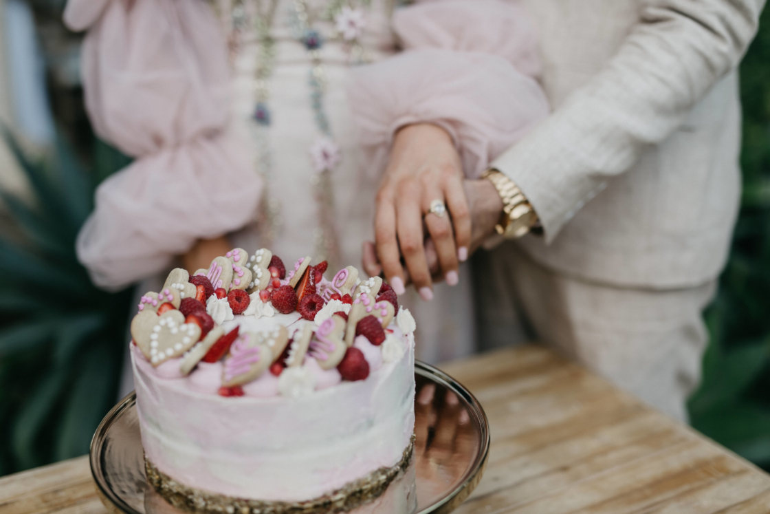FAVOURITE DETAILS “We loved our raw berry wedding cake, as it was a little different from the regular style. Of course, it had to be pink and was topped with cute little love heart biscuits. Everyone raved about how delicious it was.”