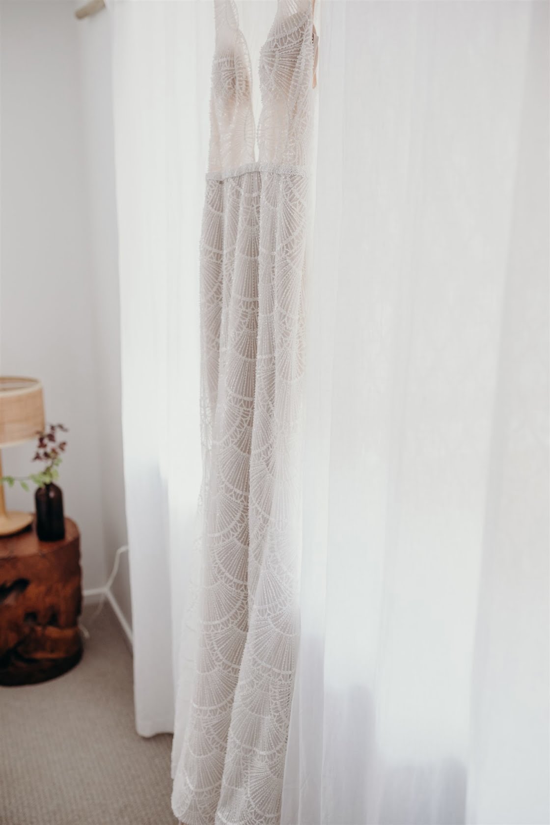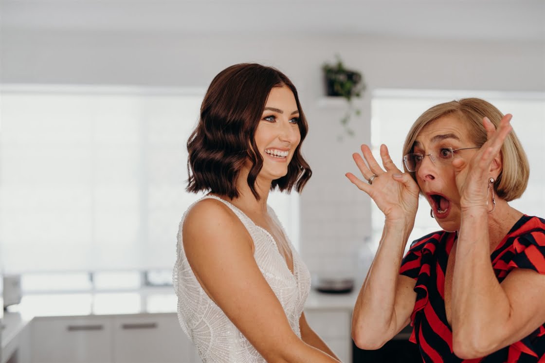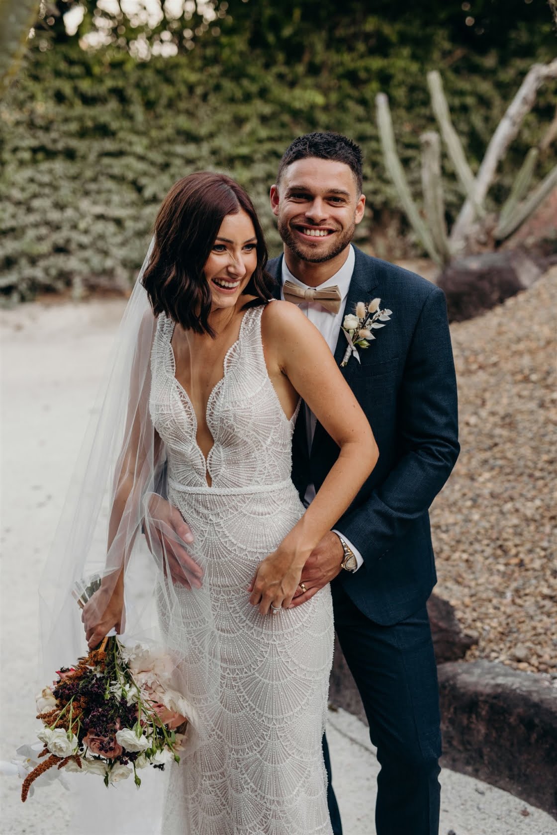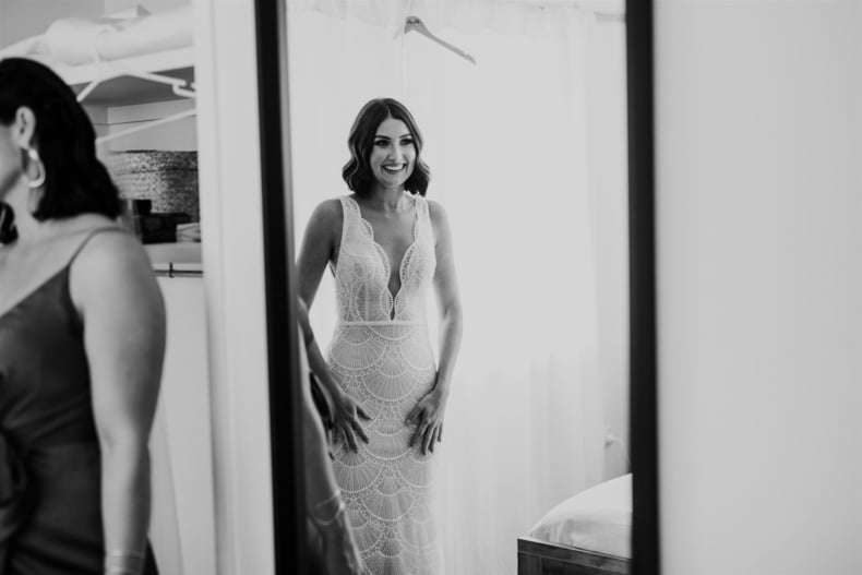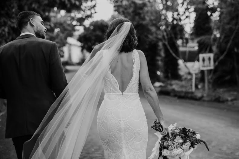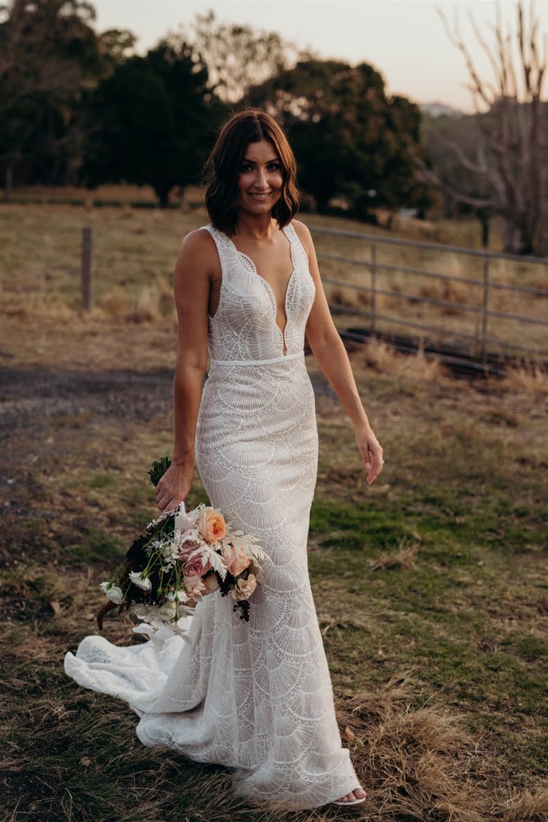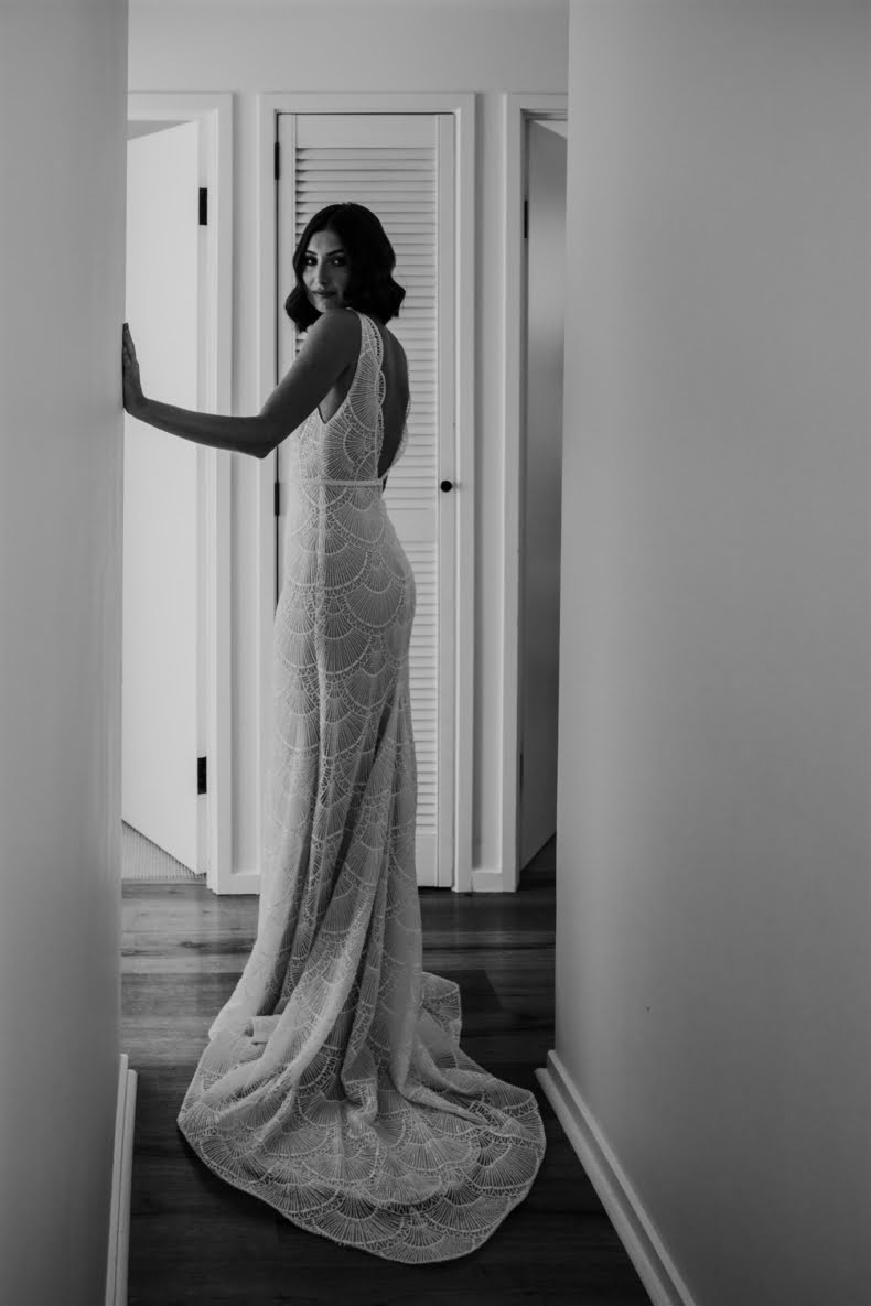 THE DRESS “I didn’t allow myself to get overwhelmed with the process, as I had plenty of time and hadn’t really got myself set on anything specific. I travelled up to Sphere Collective and first tried on a few dresses that I thought would be ‘my dress style’, however, nothing amazed me so Sarah, from Sphere Collective, suggested I come back up the following month when they had a Jane Hill Trunk Show scheduled. Sarah handed me a dress that, on the hanger, I didn’t love, however, when I slipped into it and looked in the mirror, I imagined Jarrod looking back at me walking down the aisle and I said to my best friend ‘this is it’. If you had told me a year ago that I’d end up wearing a low neckline, sequin gown with a veil I would have laughed at the idea but here we are.”