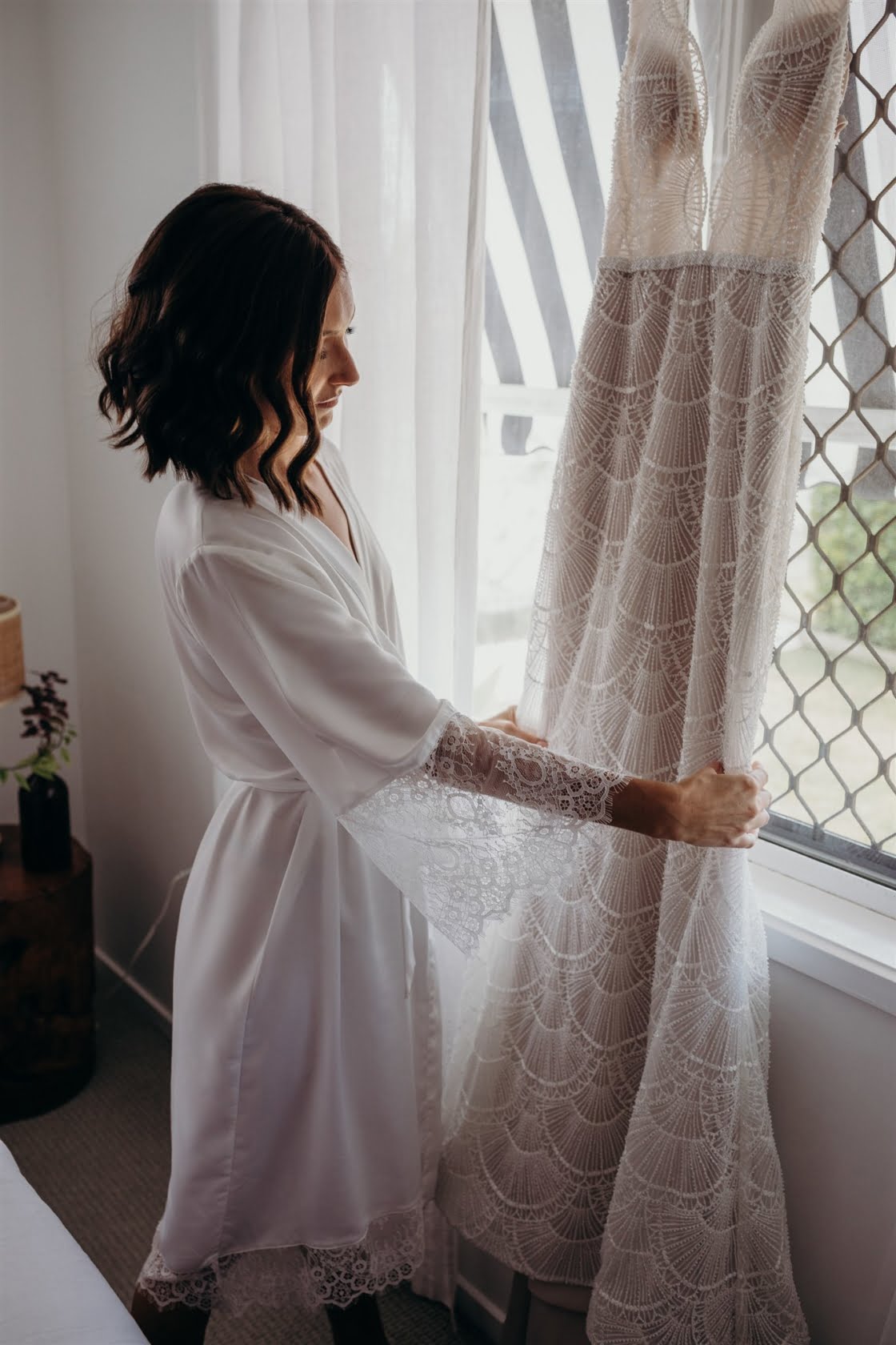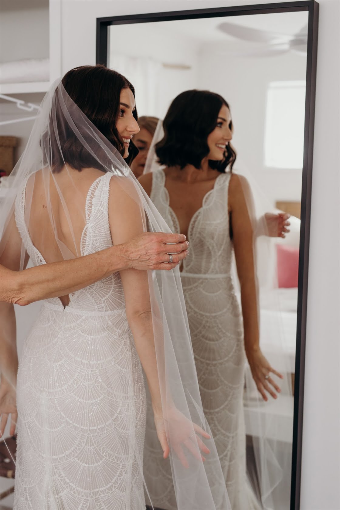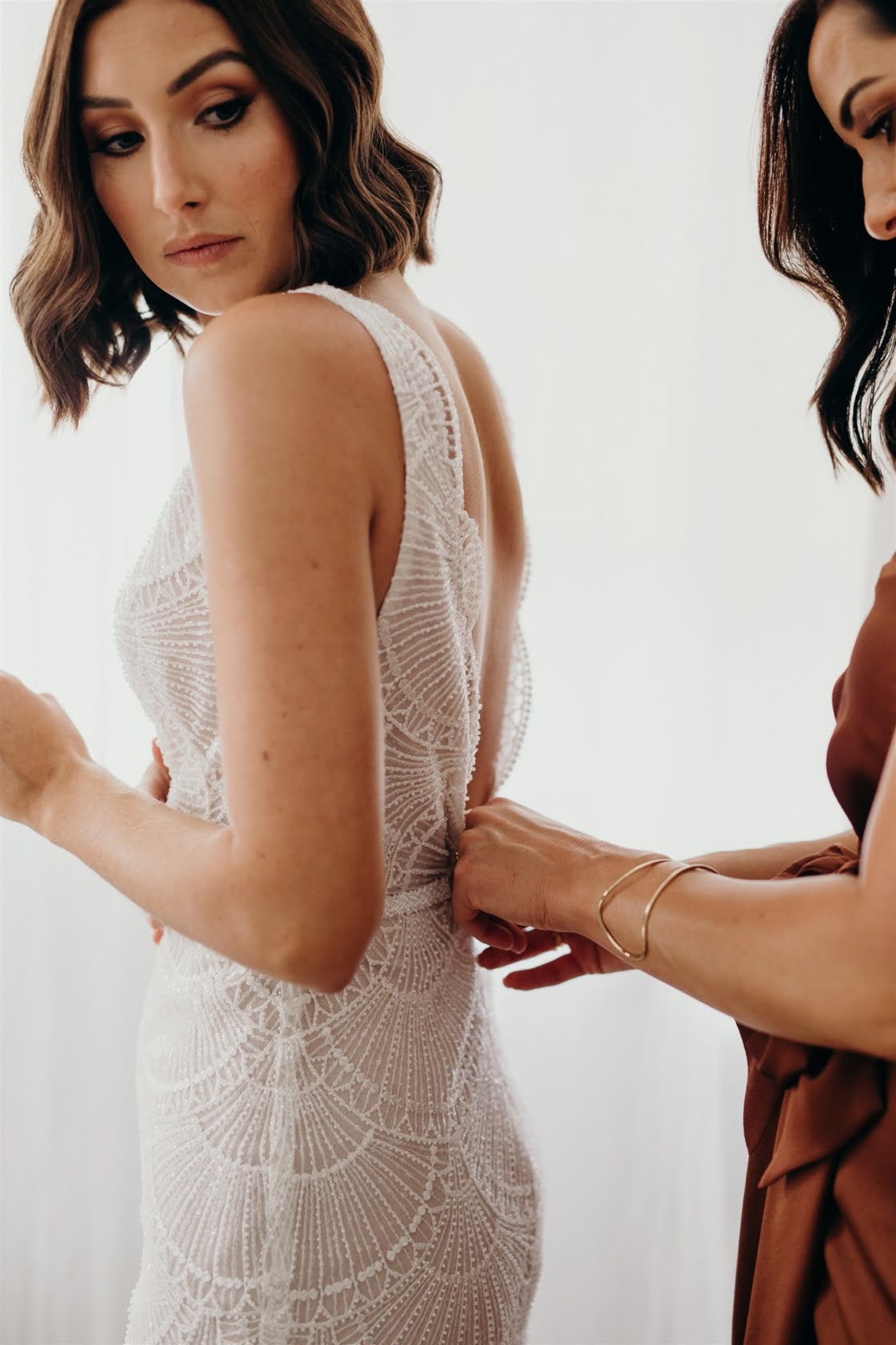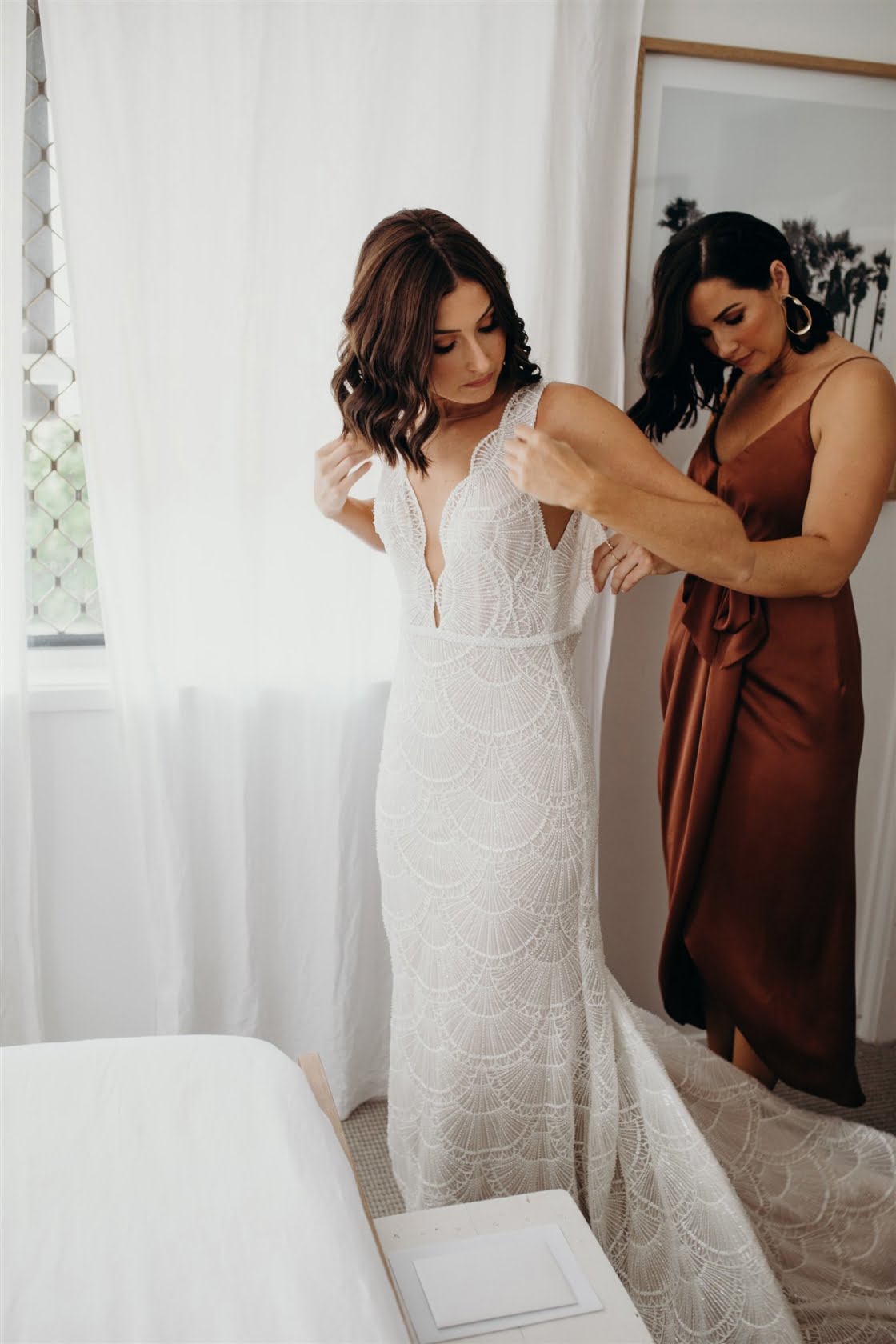 THE DRESS “I didn’t allow myself to get overwhelmed with the process, as I had plenty of time and hadn’t really got myself set on anything specific. I travelled up to Sphere Collective and first tried on a few dresses that I thought would be ‘my dress style’, however, nothing amazed me so Sarah, from Sphere Collective, suggested I come back up the following month when they had a Jane Hill Trunk Show scheduled. Sarah handed me a dress that, on the hanger, I didn’t love, however, when I slipped into it and looked in the mirror, I imagined Jarrod looking back at me walking down the aisle and I said to my best friend ‘this is it’. If you had told me a year ago that I’d end up wearing a low neckline, sequin gown with a veil I would have laughed at the idea but here we are.”