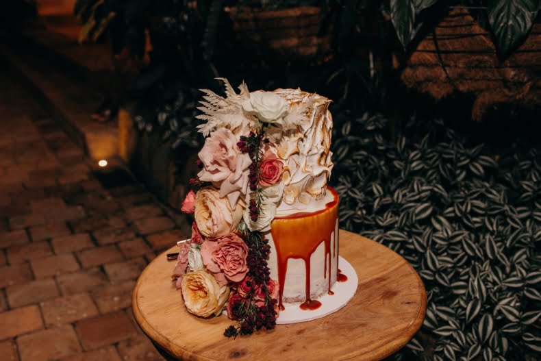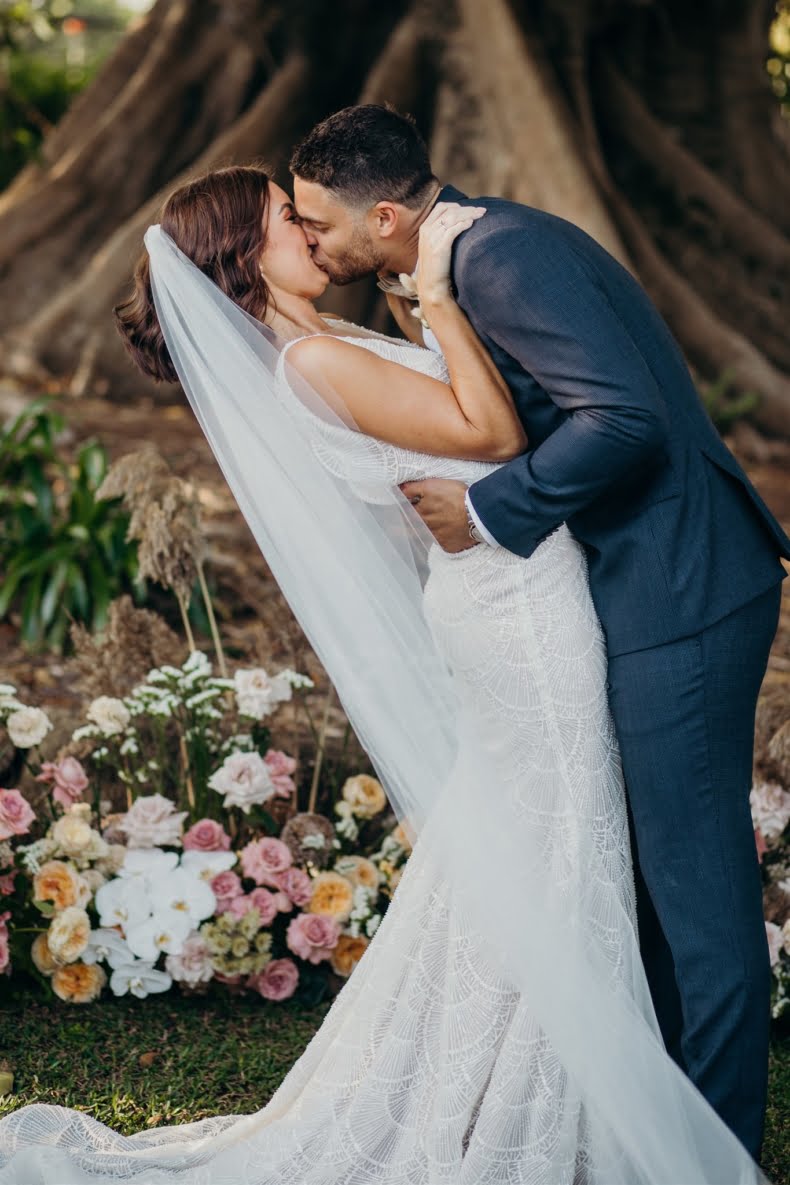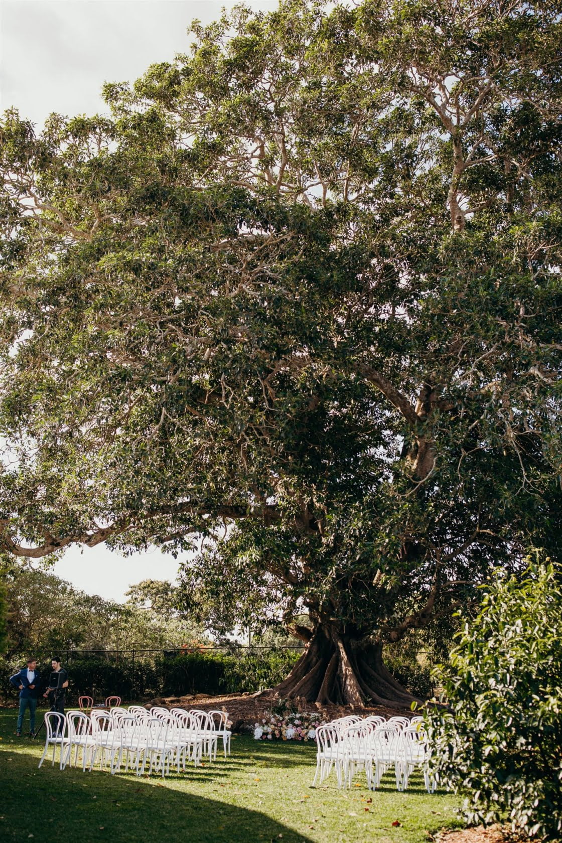 FAVOURITE DETAILS “Our ceremony set up has left a special imprint on both of us. We wanted to keep the styling minimal to allow the giant fig tree to shine and I left it open for Mikarla [Wilderness Flowers] to work her magic. She created the most perfect cascading installation along the rock base of the tree that curled and circled us. I still remember the moment the white gate opened, and that magical little space was filled with our closest family and friends and my very teary, soon to be, husband.”