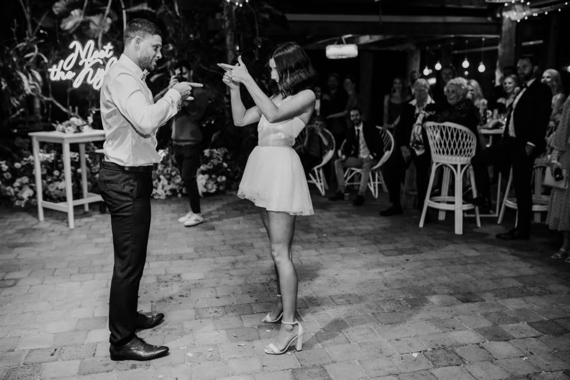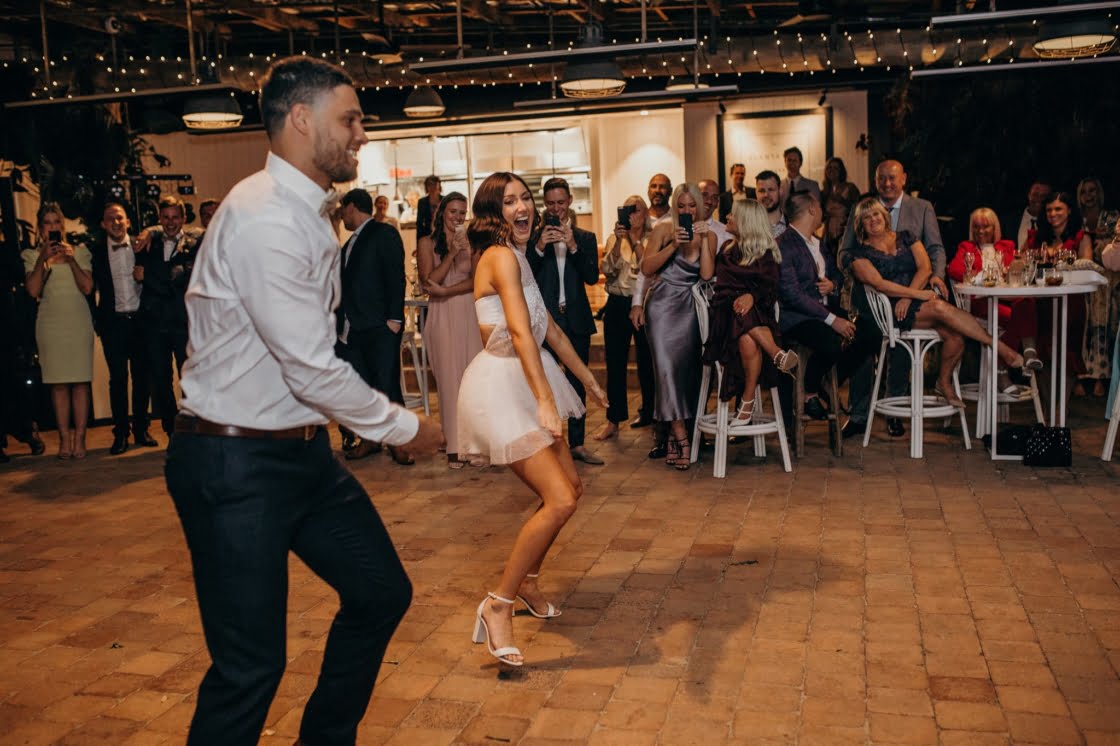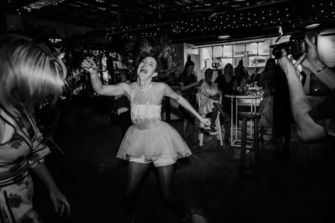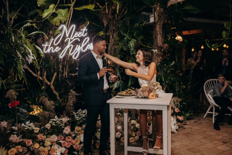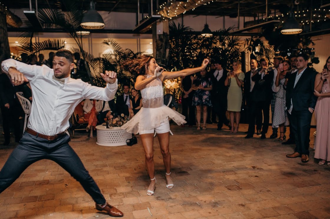 FAVOURITE MOMENT “We snuck away whilst everyone was enjoying dinner and I got changed into a little party outfit before our first dance. The only spare space the venue had was their furniture storage room, in the pitch black, so we found ourselves in there having a little make-out session in the quiet whilst I was peeling off my Spanx and Jarrod was force-feeding me a stick of halloumi as I hadn’t eaten anything all day.”