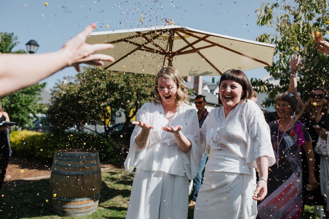 DIY “I (Bridget), really wanted confetti, but I didn’t want it to have a negative impact on the environment. So we started hand punching gum leaves with a little beach punch about six months before the wedding.”