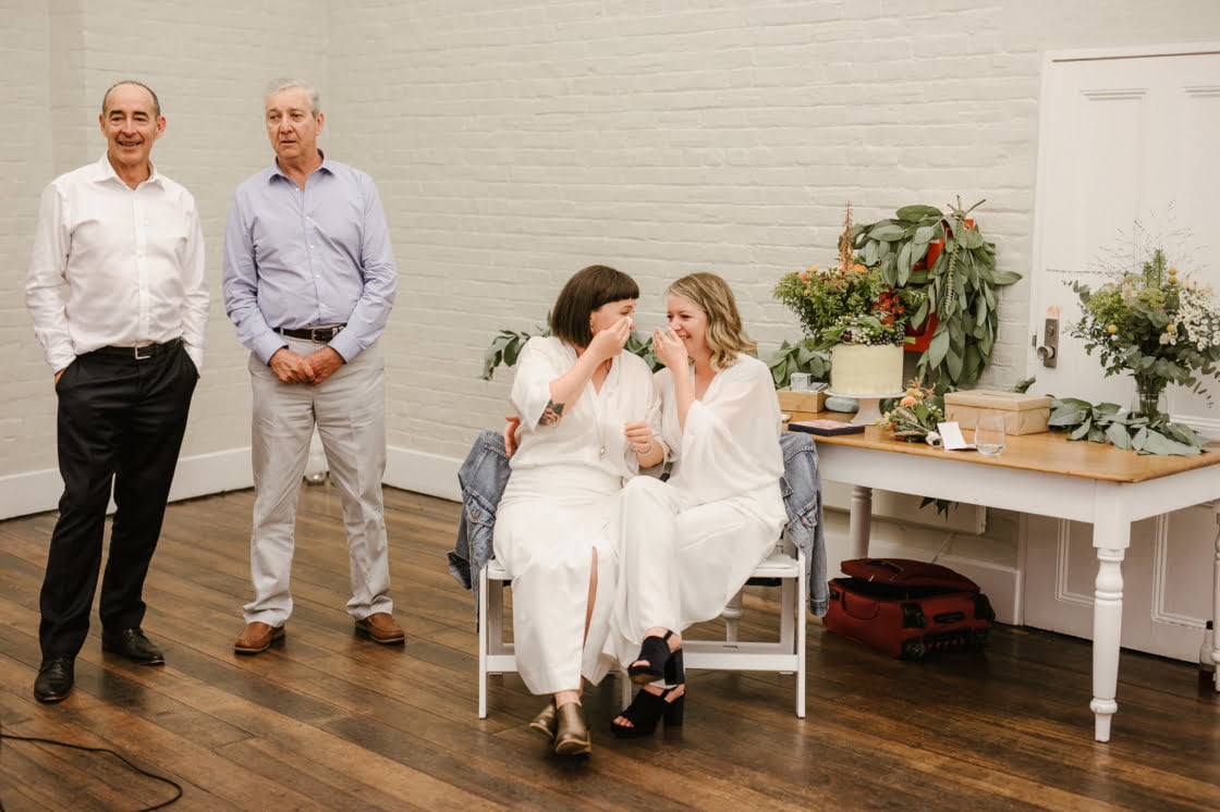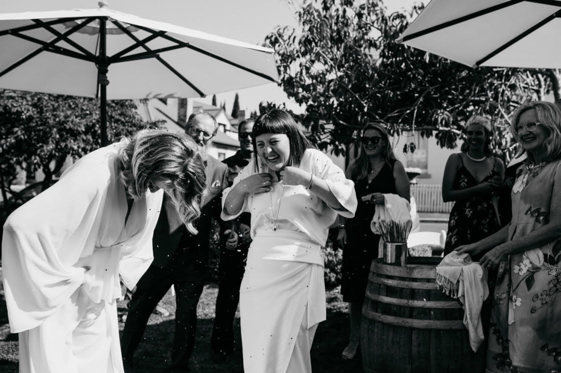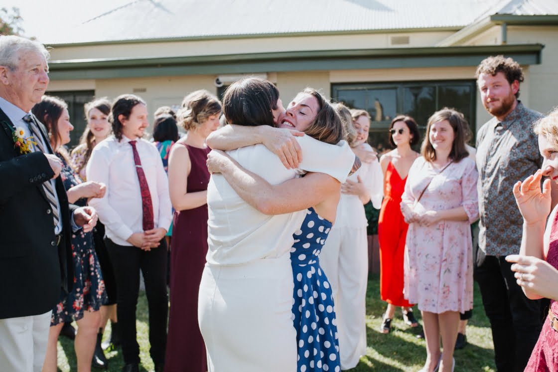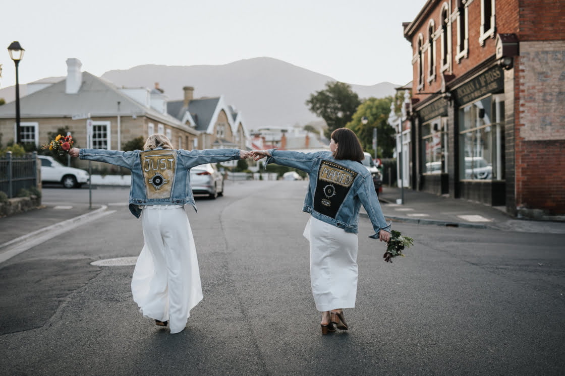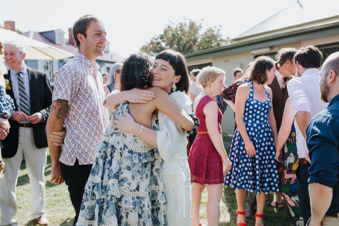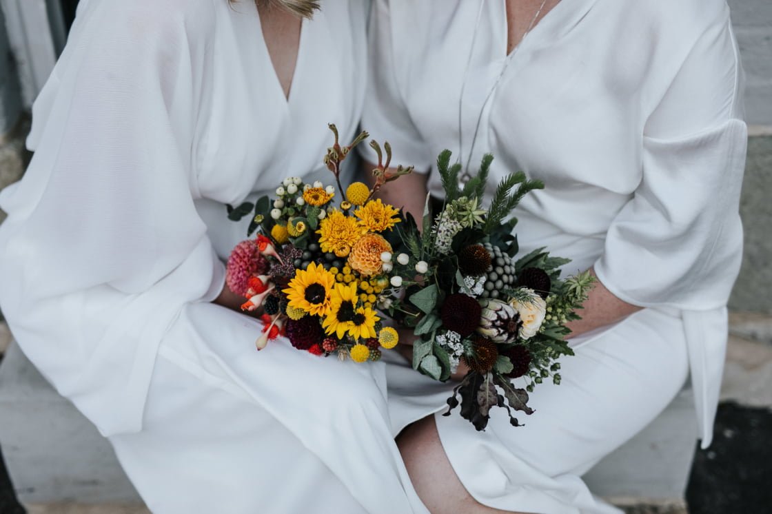 STANDOUT VENDORS “Our Photographer, Nina Hamilton – her pictures are just beyond. They are so professional and beautiful, and she really captured who we are as a couple. Merren Wilkinson (of Cinta Celebrate Love) was gorgeous. She has this glowing energy and was so personable and warm in her manner. Lisa Kingston Flowers was incredible. At Lisa’s encouragement, we went down early to Salamanca markets on the Saturday and picked our flowers from Lisa’s stall. She has amazing posies (two of which became our bride bouquets), and bunches of dahlia’s and eucalyptus greenery.”