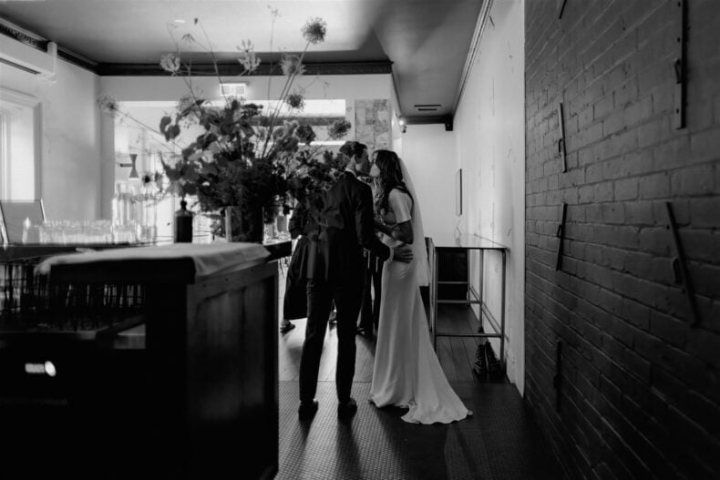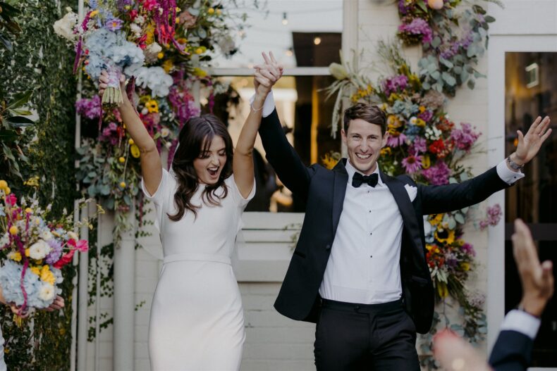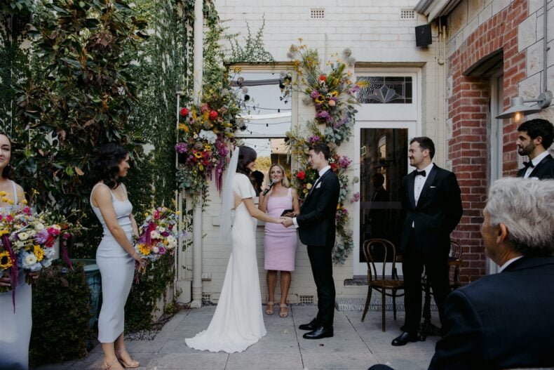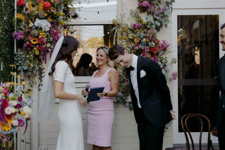 WE’RE GLAD WE… “We both put a lot of effort into our vows, proofread our celebrant Meg’s introduction, and practised our first kiss. To me, this moment was the most ‘wedding’ part of the day, so it calmed my nerves a lot [knowing] how it would proceed (excluding knowing Bryce’s vows). We also danced a lot and spent the majority of the night walking around together to talk to our friends and family.”