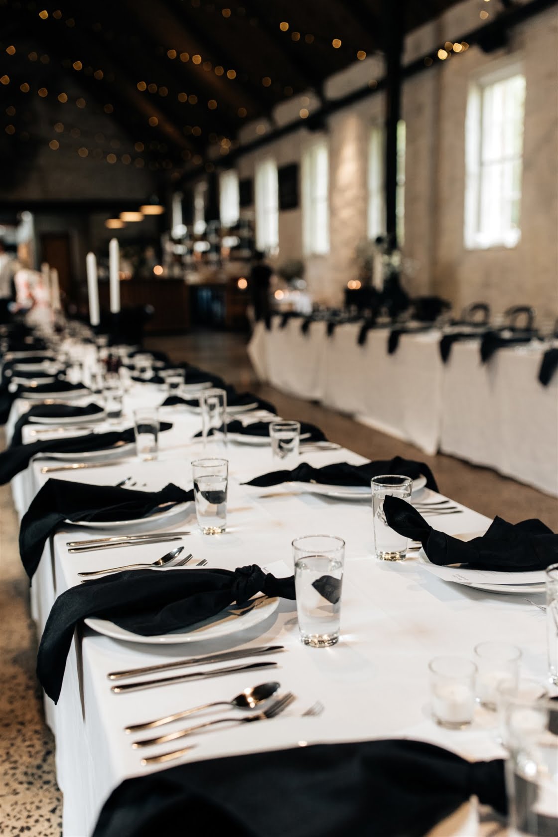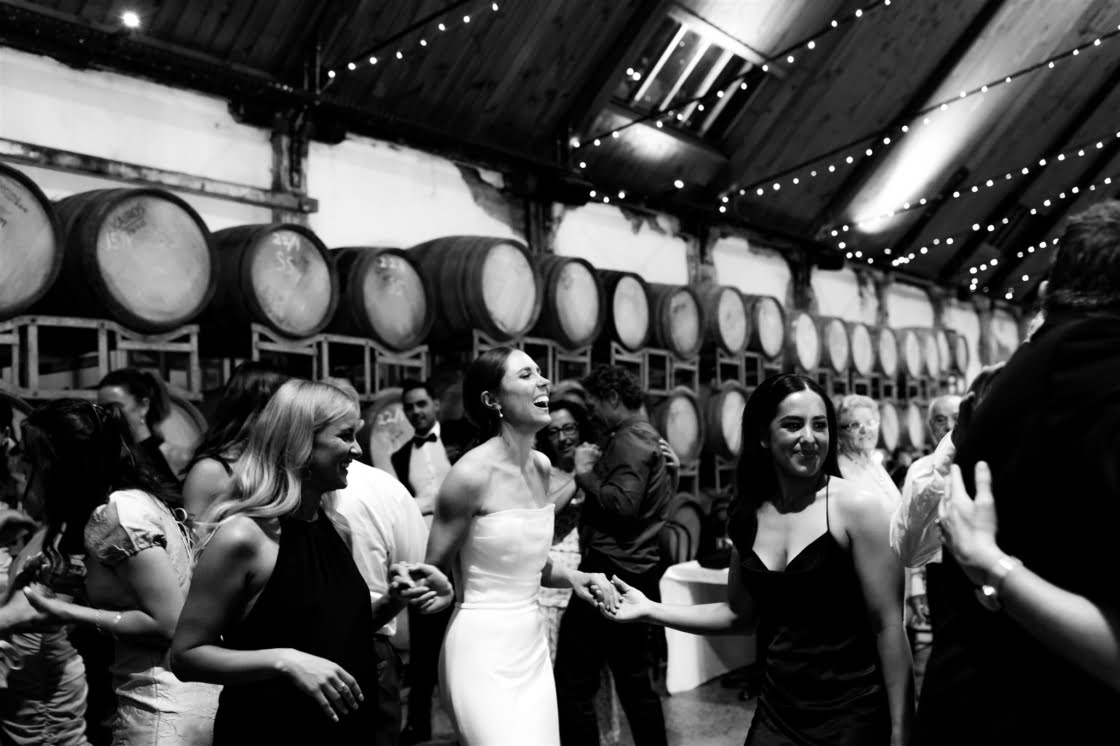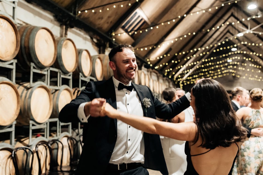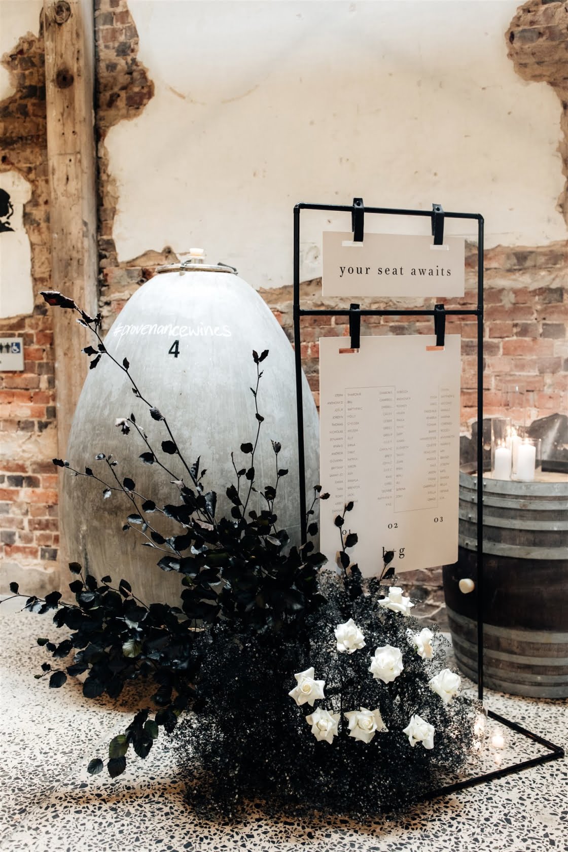 FAVE DETAILS “Getting married under the draping clouds of black gyp was my favourite visual element. I also loved the contrast of scattered white, including our bouquets and mine with added hints of lunaria. Looking around when the dance floor came alive really gave me time to appreciate just how amazing Provenance Wines looks at night – all lit up with fairy lights and candles.”