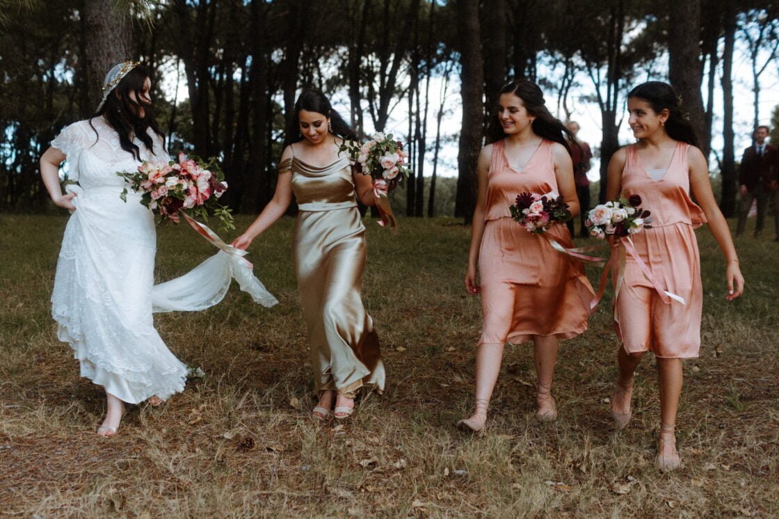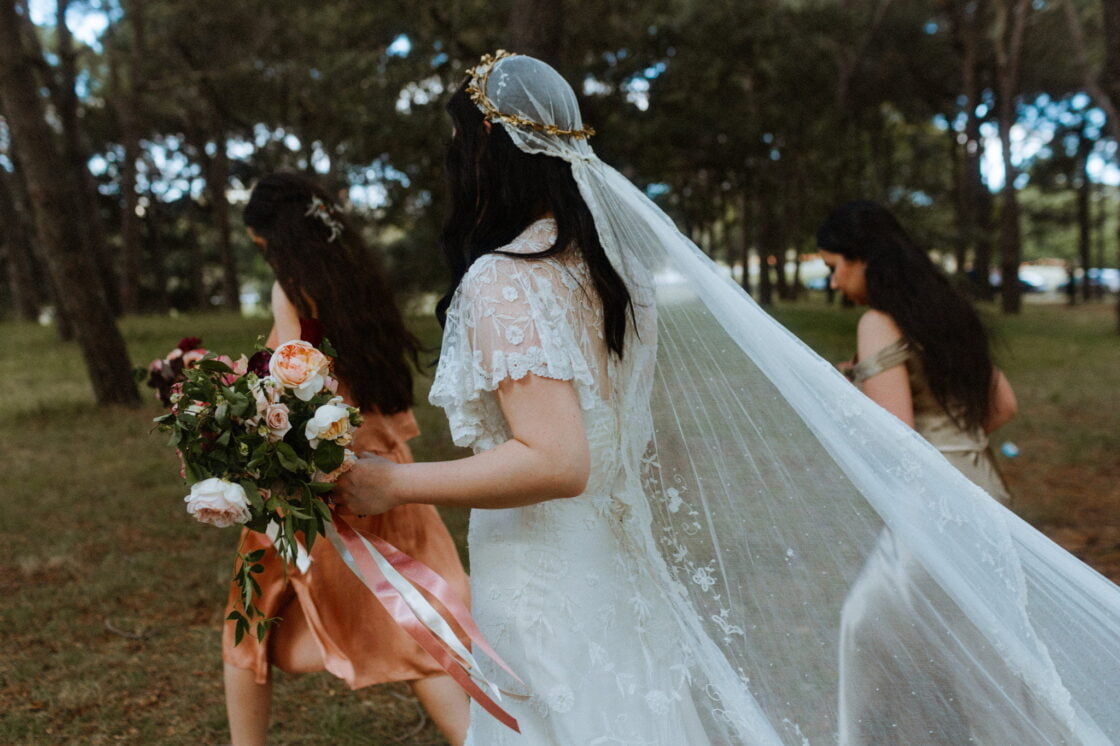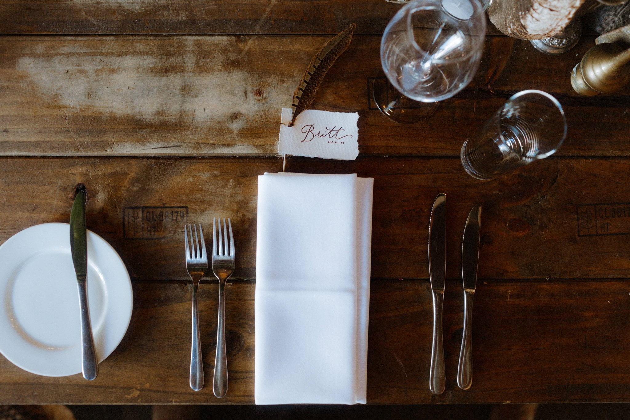 DIY “I taught myself calligraphy and did the place cards myself. I learnt so much about the process of paper making, gradients and techniques. I sourced pheasant feathers from America to put through them. I did the bombonieres, the pocket squares (made out of reclaimed vintage fabric), signage, florals around the signage, dessert table, the earrings for the maid of honour (from a vintage bracelet), and I customised the flower girls’ dresses with hand-dyed ribbon.”