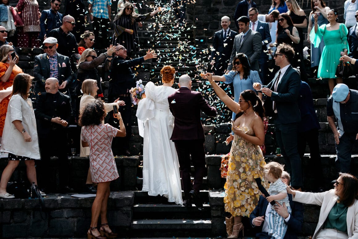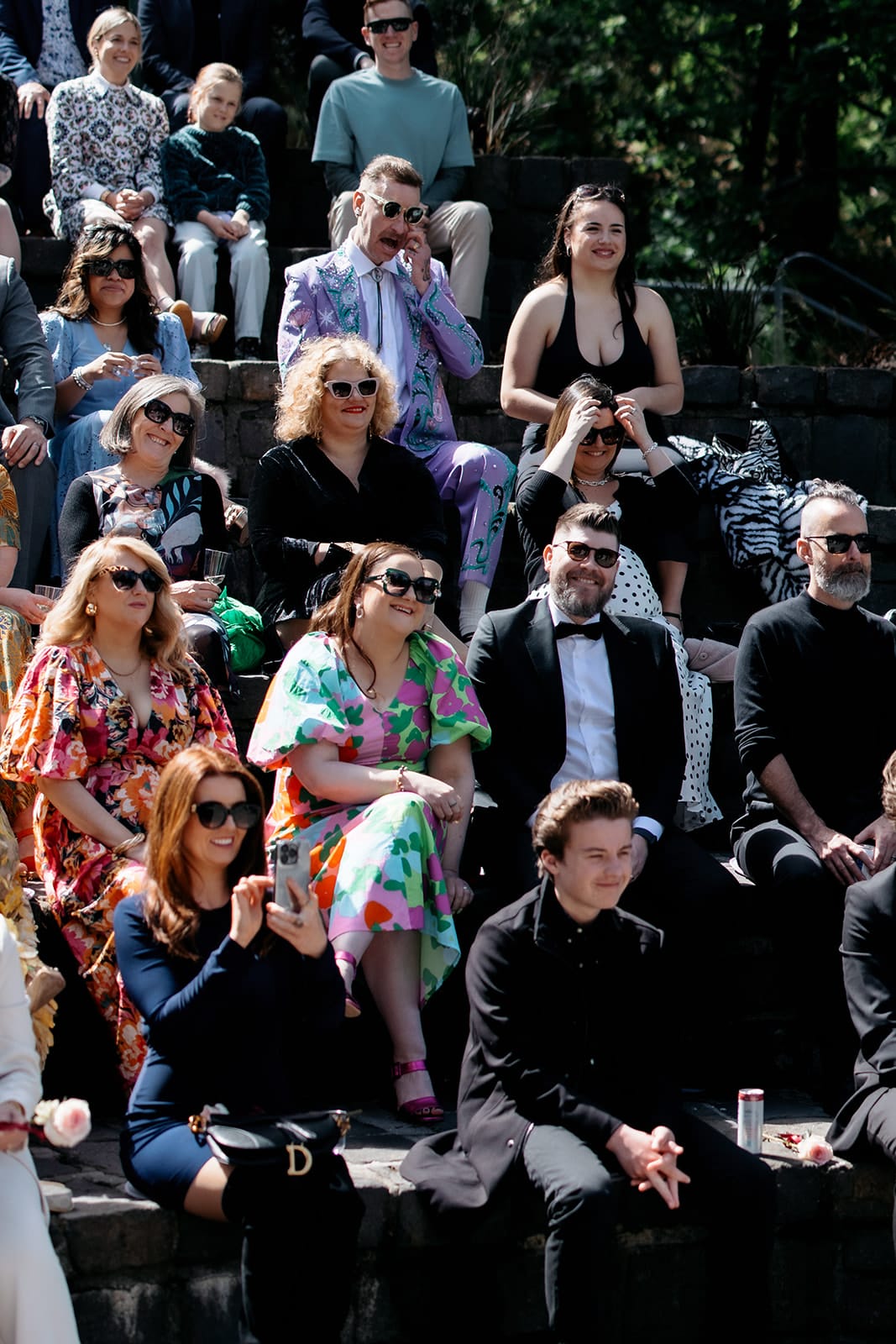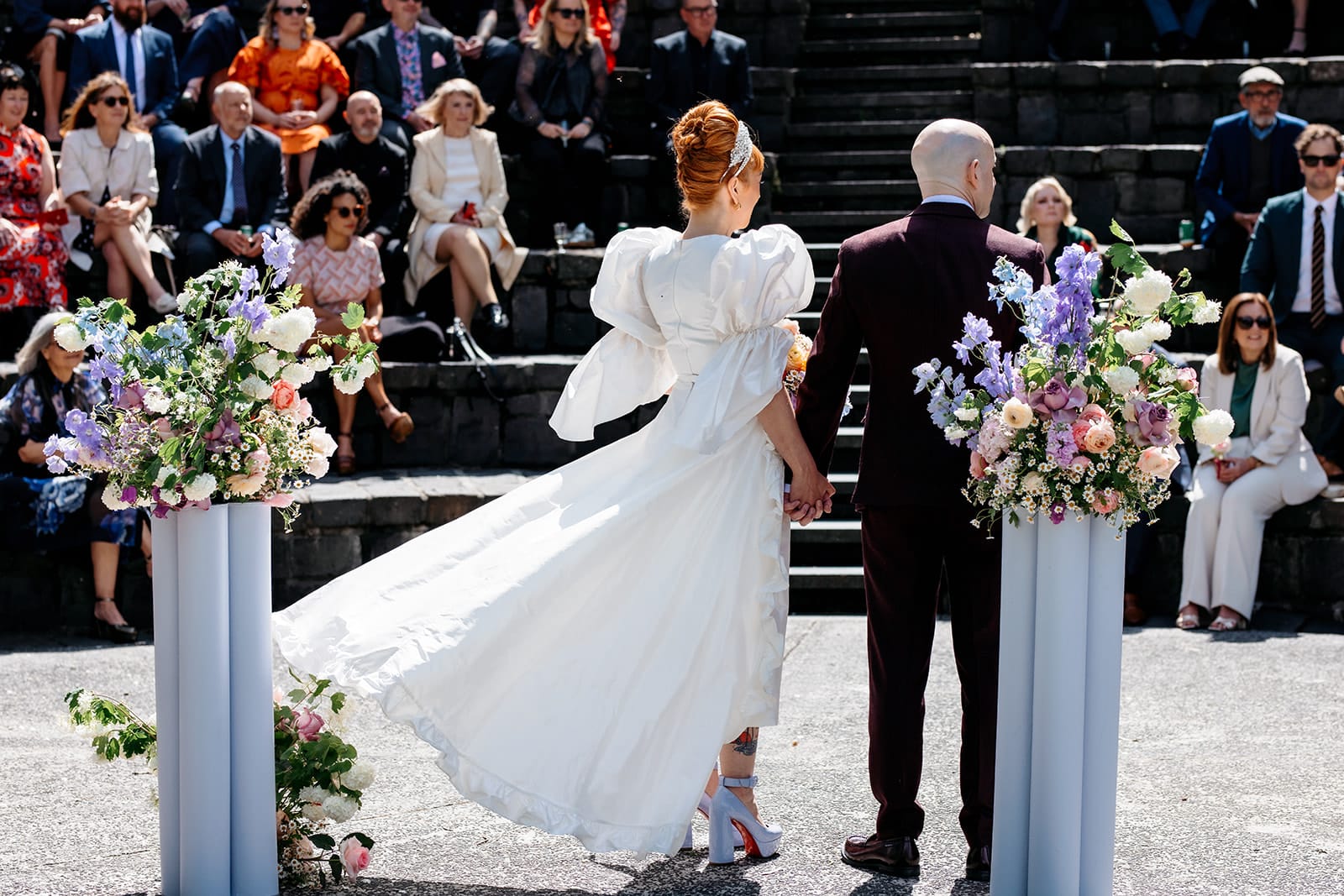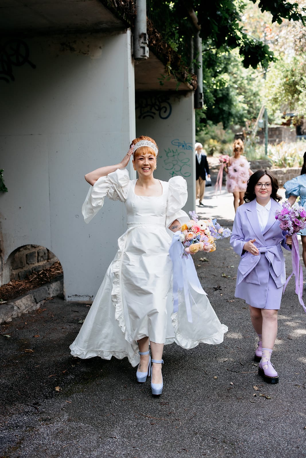 Photographer Kinship by Kristy Stylist Jenna Clarke (Friend) Florist Susi Matovski (Friend) Wedding Website With Joy Ceremony Venue Fairfield Amphitheatre Reception Venue, Catering & Other Desserts Free to Feed Cake Mali Bakes Cake Topper Weddingstar Hire Items The Hire Co. Lighting & Sound Hire Bounce Audio Signage Custom Neon Celebrant Clare Alice Celebrant Rings Kim Victoria Transport London Taxi Weddings THE BRIDE Bridal Gown Designer Van Der Kooij Getting Ready Outfit Adidas Hair Piece Aura Bridalwear Ireland Shoes Christian Louboutin via MyTheresa, Crocs via ASOS Accessories Cleopatra’s Bling, Lucy Folk Hair Danni Solier – LNDN Hair Makeup Jordan Hallewell Fragrance Byredo Bridesmaid Dresses Cynthia Rowley, Madeleine Simon Studio, Club L London Bridesmaid Shoes Steve Madden, Alias Mae, Dr. Martins THE GROOM Suit Suitably Shirt Trenery Tie Otaa Shoes Ben Sherman Socks Fred Perry Groomsmen Suits M.J. Bale Groomsmen Gifts Discogs