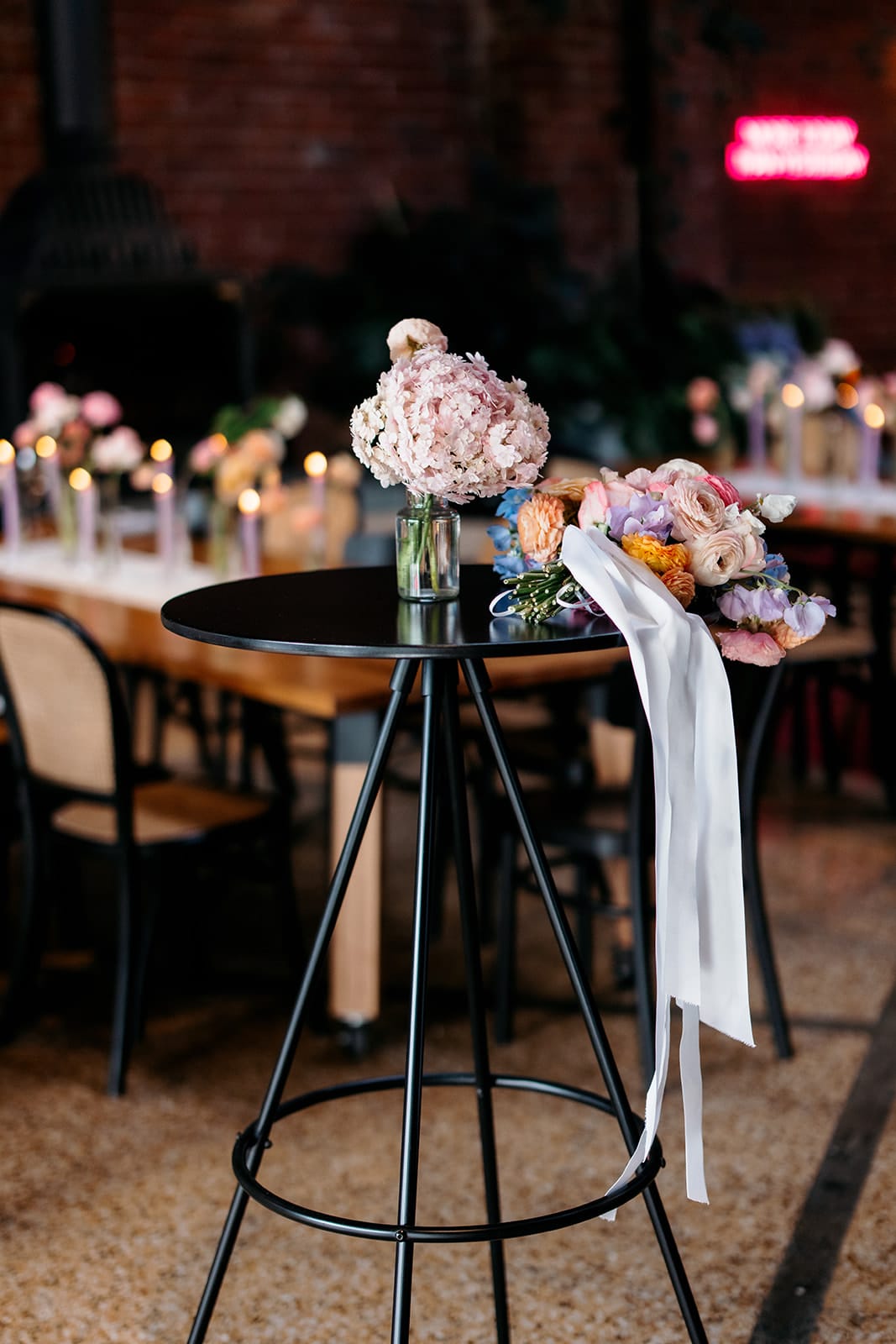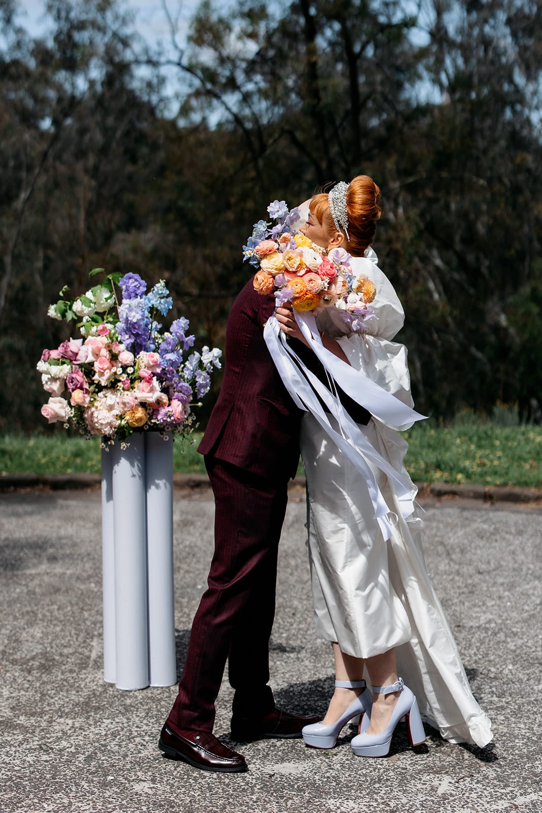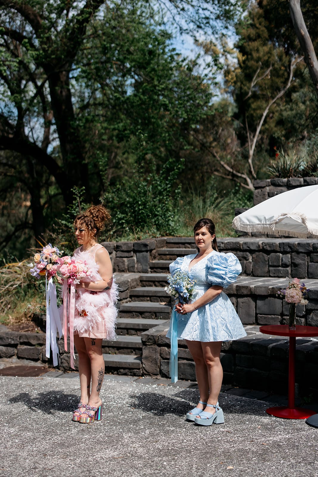 The big day (immortalised thanks to Kinship by Kristy) was a story of retro pastels, “bedazzled delights”, and nods to Joel’s Liverpool heritage. But ultimately, for these two, it was about putting on a damn good party! Brittany’s custom Van Der Kooij frock was “the perfect balance of frou frou glamour and party casual”. Joel also went the custom route, collab-ing with Suitably. Meanwhile, B’s maids rocked a parade of pretty pastels and the groomsmen coordinated in classy M.J. Bale.