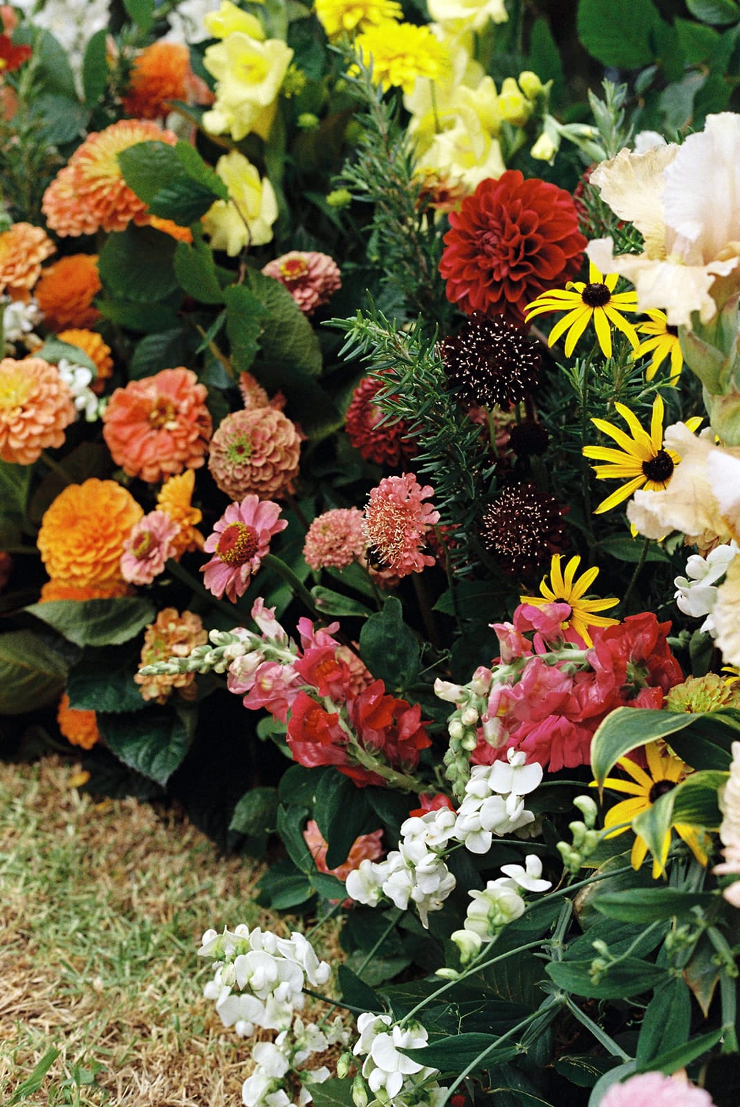 FAVE DETAILS “I am absolutely still obsessed with my cake! I originally planned to get my wedding cake from The Caker, but the bakery shut down the week I went to order! So I enlisted two good friends to make the cake of my dreams using The Caker Cake Kits. It was three 3 layers with matcha, raspberry and poppyseed iced and covered with fresh flowers and fruit. My flowers were also absolutely dreamy. Renee from Roam Studio was able to source from one of our Kiwi friends, who grows a bunch of zinnias and dahlias. During our ceremony, the flowers were covered in bumble bees, which was kind of terrifying but also very cute.”