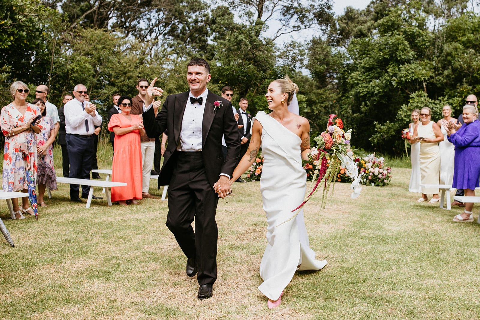 CONTRIBUTING VENDORS Photographer Juliette Murray – Love by Colour Captured Cinematographer Cousin of the Groom (Family) Florist Roam Studio Stationery & Signage Brooke Oke (Bride) Ceremony Venue Pohutukawa Park, Waihi Beach Reception Venue Waihi Beach Tennis Club Catering Cream Eatery Platters The Platter Board Wine Fruit Cru Cake Maker Amy & Laura (Friends) & The Caker Hire Items Lucy’s Hire, Tauranga Party Hire & TBLE Linen Marquee / Teepee & Lighting Hire Lucy’s Hire Sound Hire Triac Light and Sound Entertainment Eric Roy DJ (Friend) Celebrant Paige McCoy Rings Lott Studio (Bride) & Cort Jewellery (Groom) Bridal Party Accommodation Amongst the Nikaus THE BRIDE Bridal Gown Designer Toni Maticevski (Ceremony) & Natalie Rolt (Reception) Bridal Boutique Bluebell Bridal Veil Amelie Gordon Robes / Getting Ready Tees Homebodi Shoes By Far Accessories Jasmin Sparrow Hair Chandra – Good Hood Makeup Daisy – Whole Beauty Fragrance/Perfume Ode to Self Bridesmaid Dresses Bec + Bridge Bridesmaid Shoes Therapy Bridesmaid Gifts YCL Jewels & Mecca THE GROOM Suit, Jacket, Shirt, Pants, Cufflinks & Bow Tie Tailored – Josh Davies Shoes Sebago Barber / Grooming The Mane Barber Groomsmen Suits M.J. Bale Groomsmen Gifts Yeti