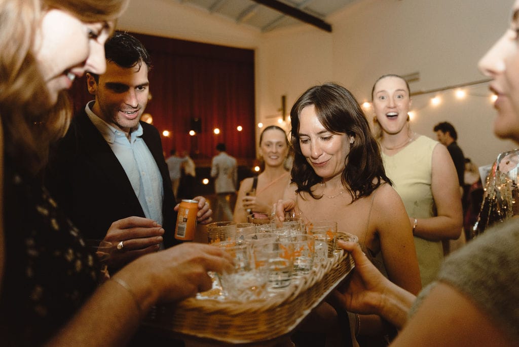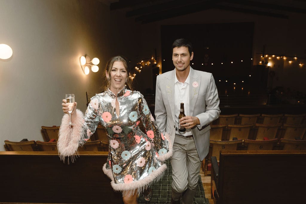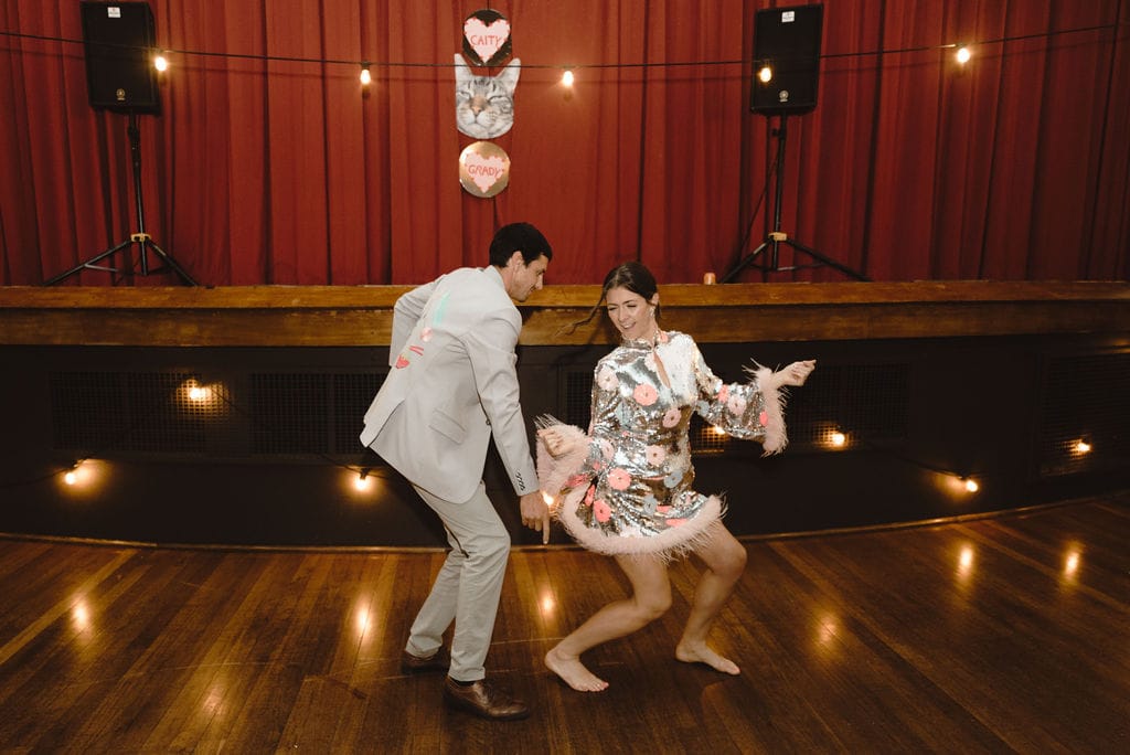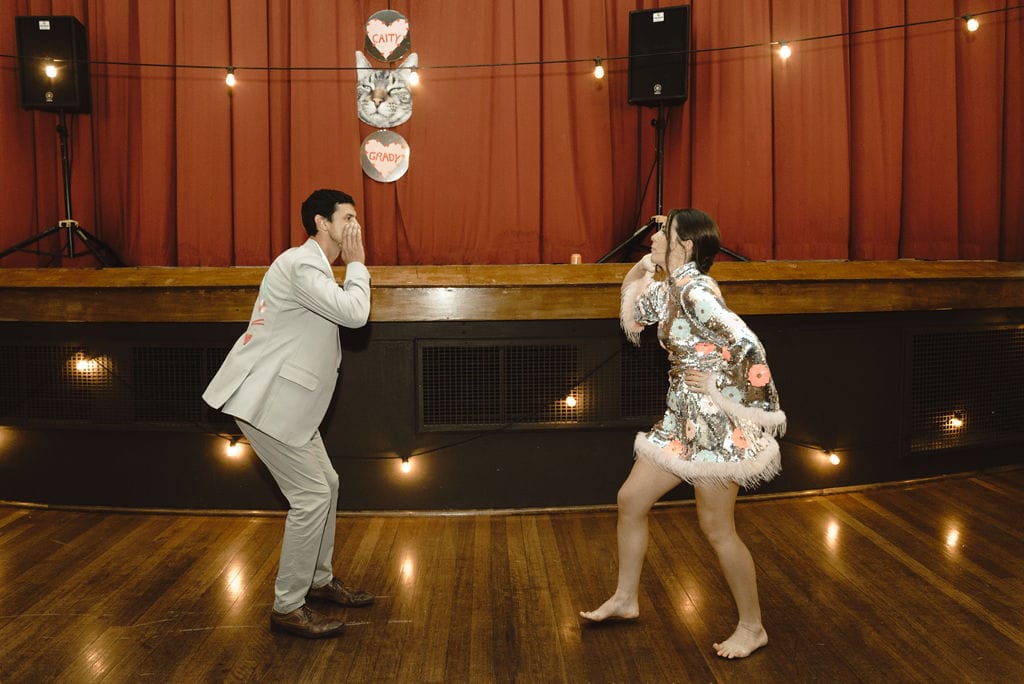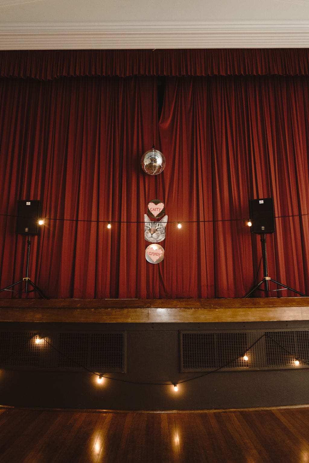 If you can believe it, they spent only seven months pulling this party together, which was hosted at country Victoria’s Koroit Theatre. But that was “plenty of time”, thanks to the help of friends and family (legends!) As for the theme? Well, Grady and Caity just wanted to be surrounded by things that bring them joy! Think cup’o’noodles, Japanese snacks, sake, retro decor, a disco ball and a life-like cutout of the couple’s cat. We love it. We love it. WE LOVE IT!