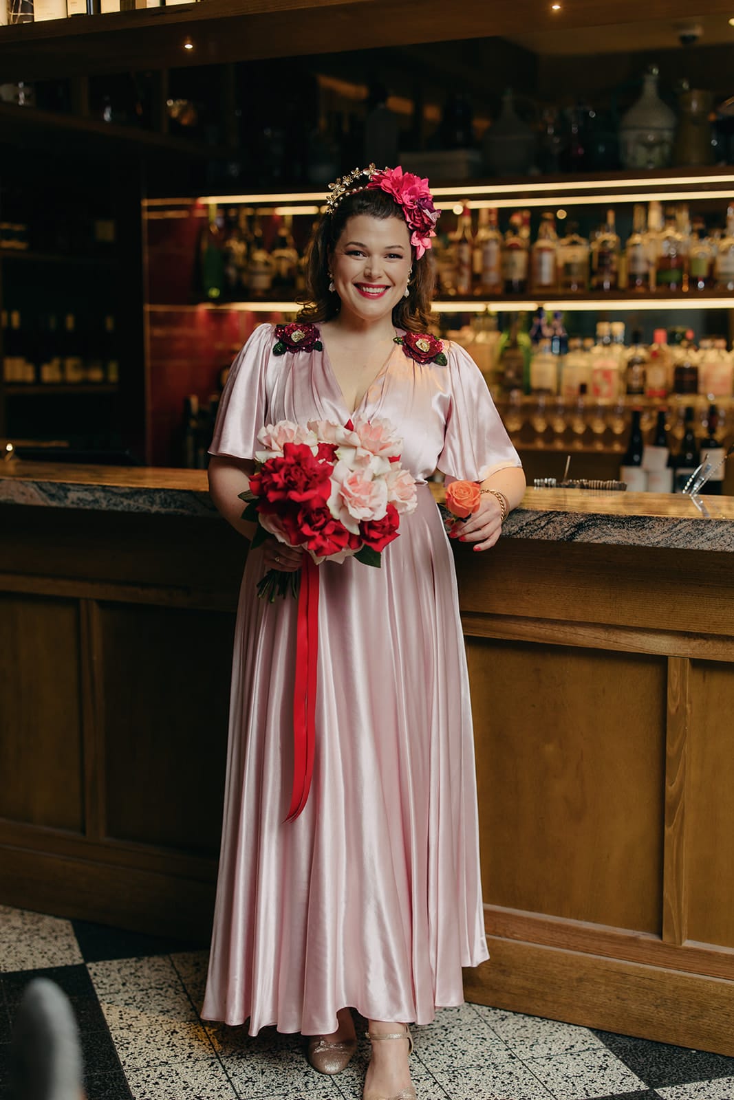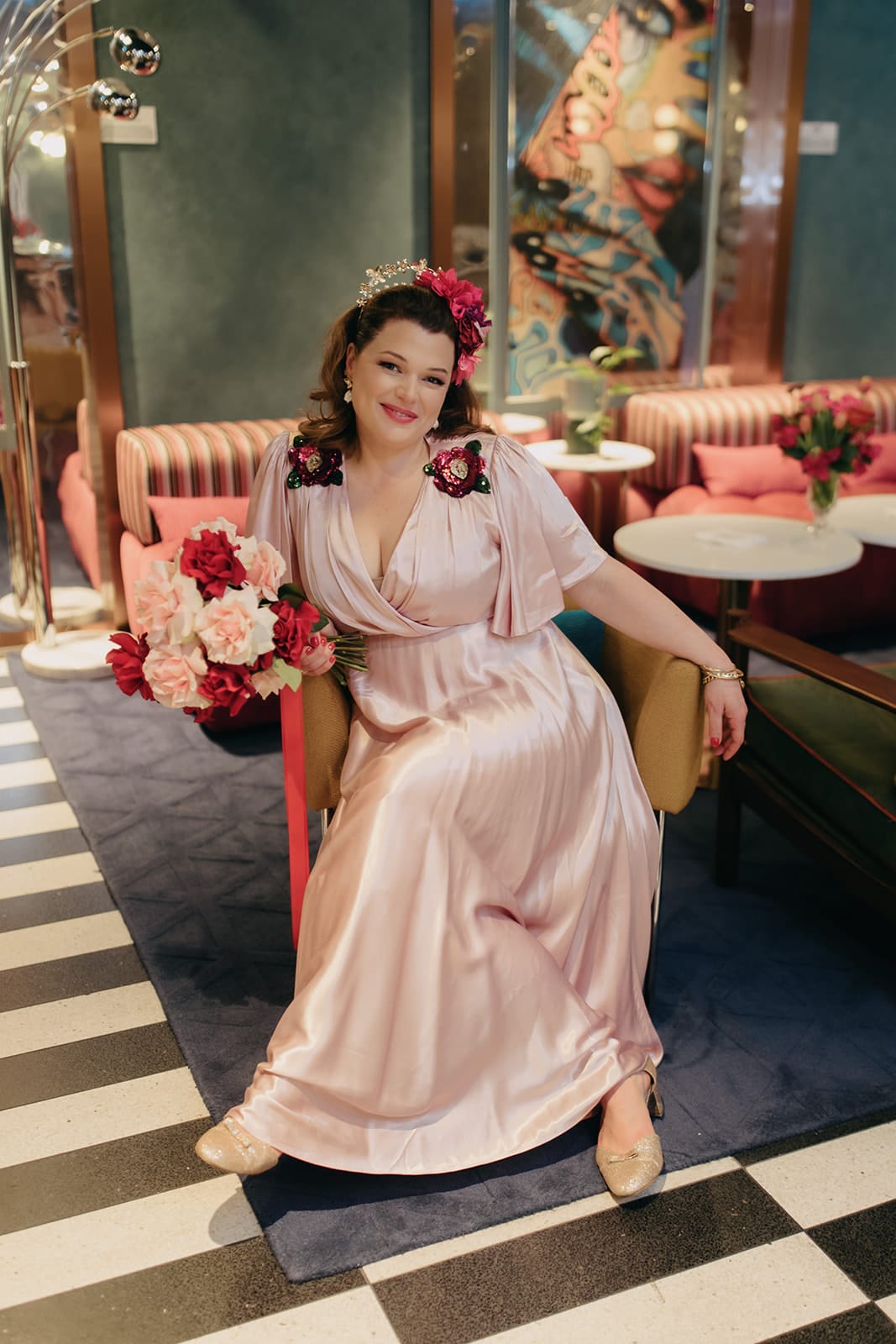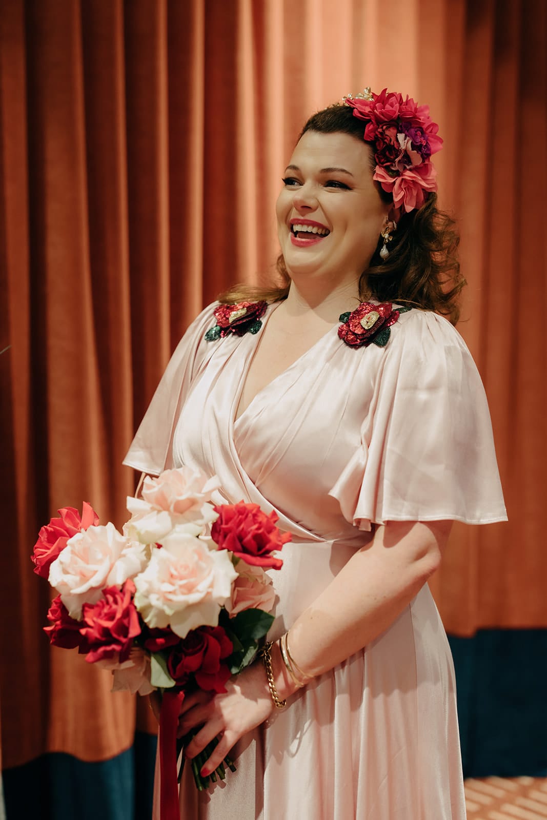 THE DRESS “I tried on quite a few non-traditional, retro wedding dresses and was quite keen on a floral design. I was strolling through Myer one day and unexpectedly found my dress. I then slightly embellished it by adding sparkly flowers to the lapels.”