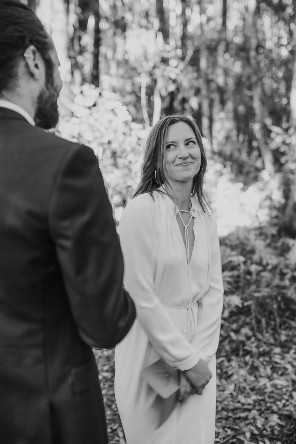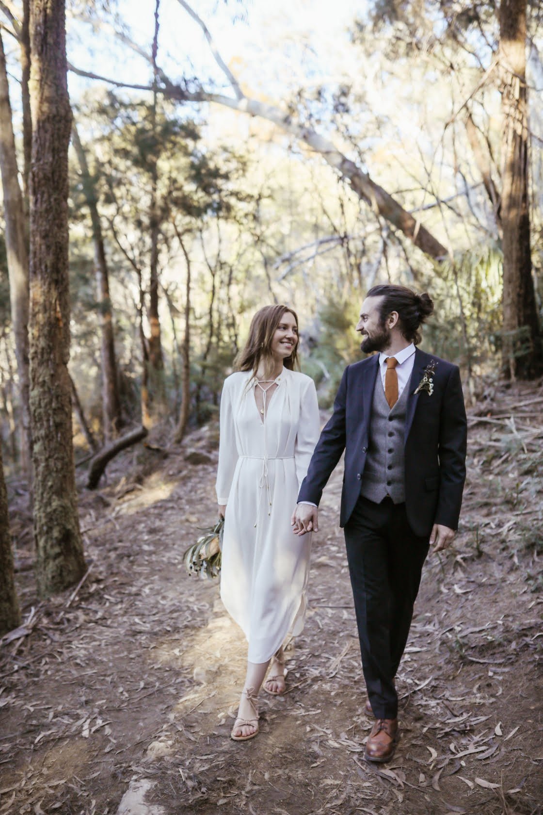 THE VENUE “We had just moved into our own home and decided that it would be nice to have the reception at home so we could just be ourselves. It had everything we needed and we only wanted a small wedding of 25 people. So that was easy. We did want the ceremony to be amongst the trees though. So we went on a few walks around our area and found a nice secluded forest that was easily accessible and had a rogue ceremony with no styling or set-up, just the big trees surrounding us.”