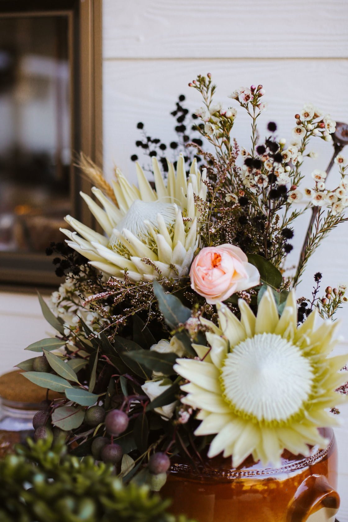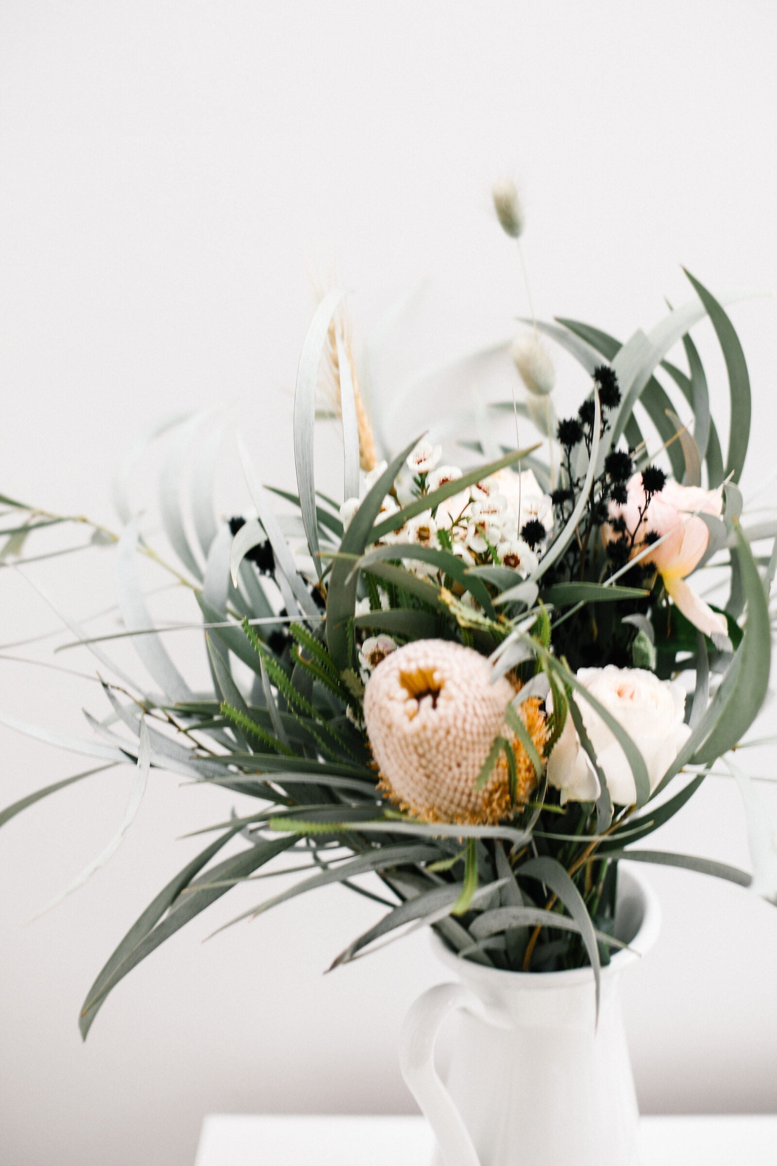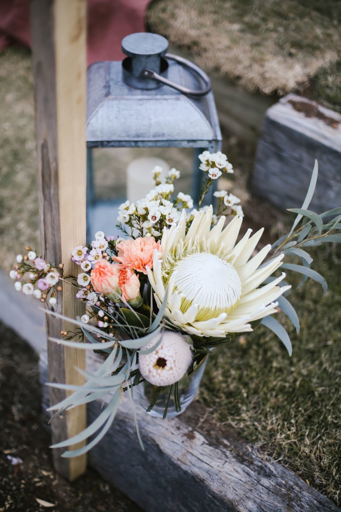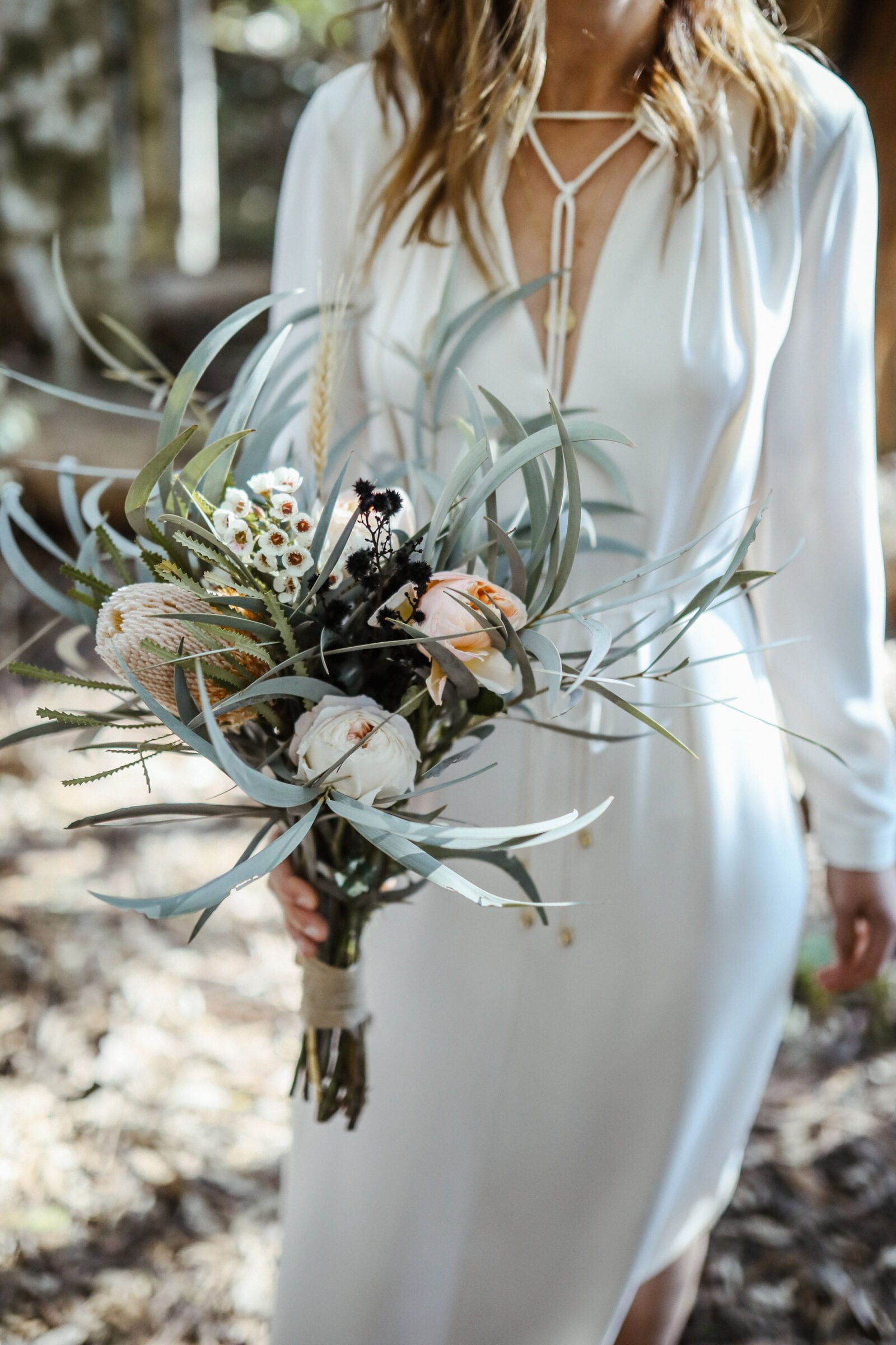 FAVOURITE DETAILS “I love that Levi did a small drawing for our invites and my sister, Kym and I had a flower frenzy the day before the wedding. We had a nice morning at the Roacklea Flower Markets and put everything together that afternoon. I didn’t have a plan for flowers or styling. We just knew that you can’t go wrong with a few native flowers and gum leaves.”
