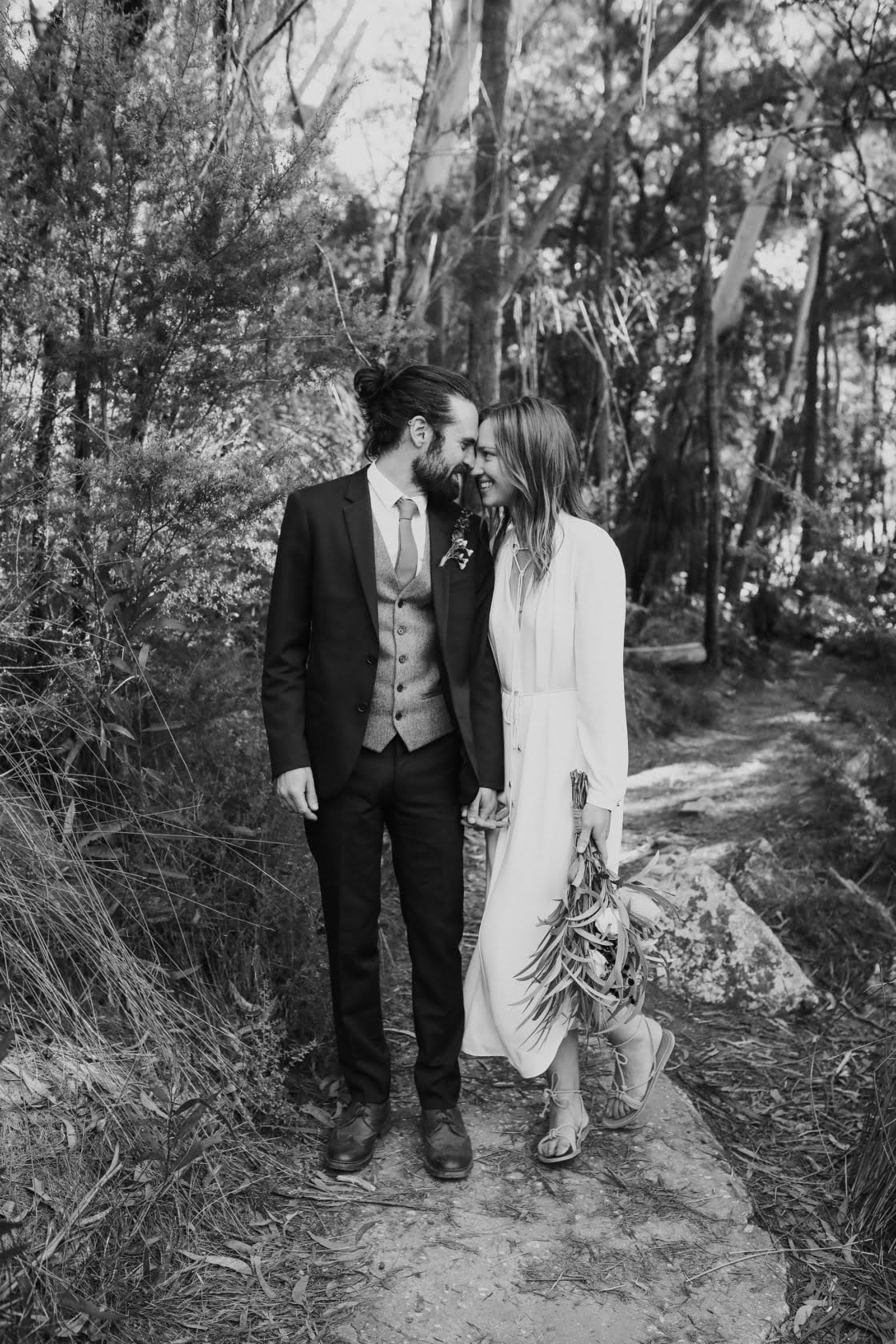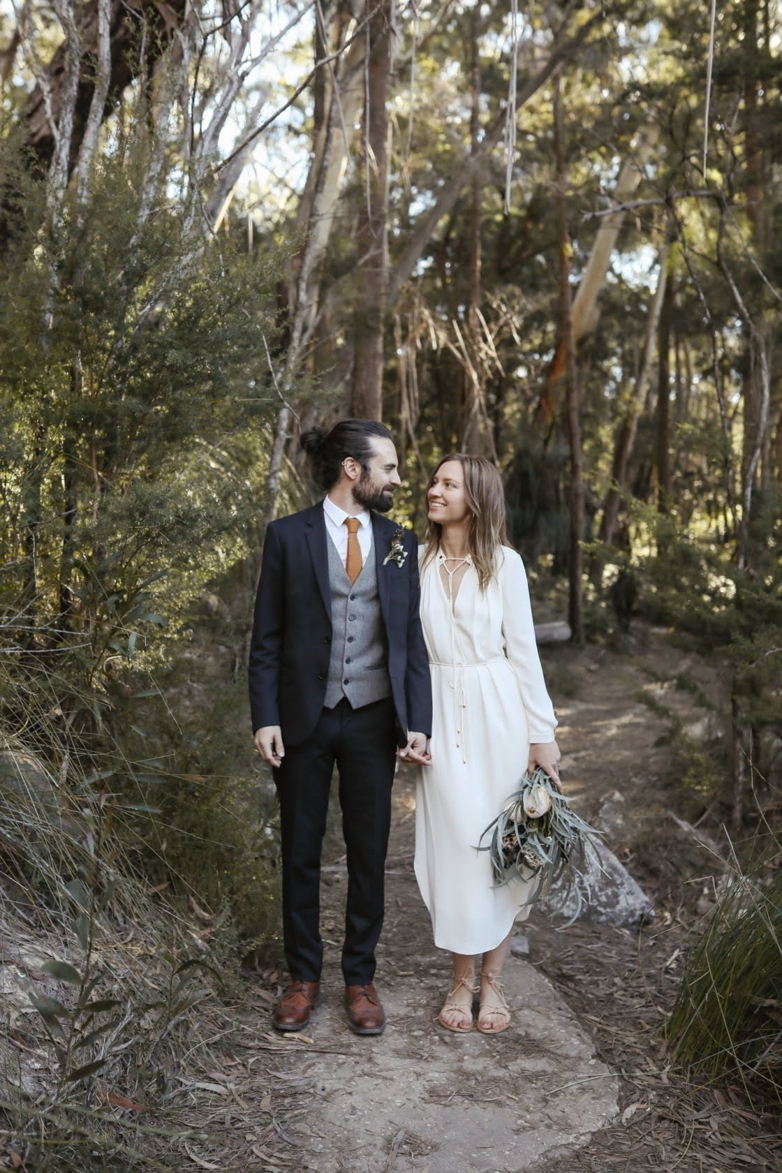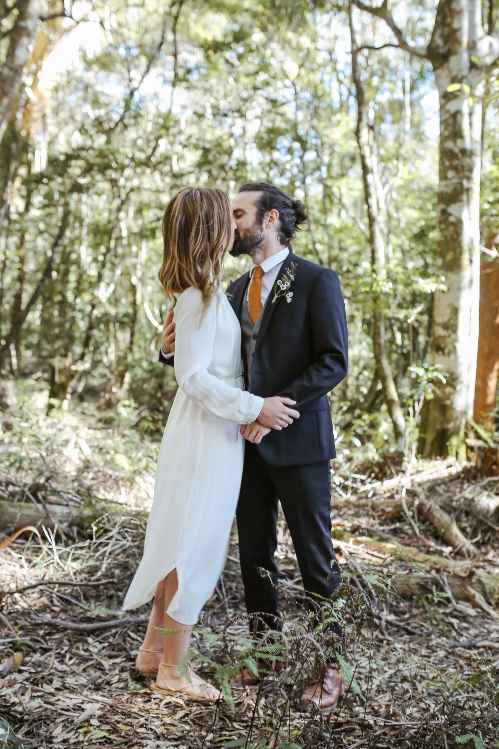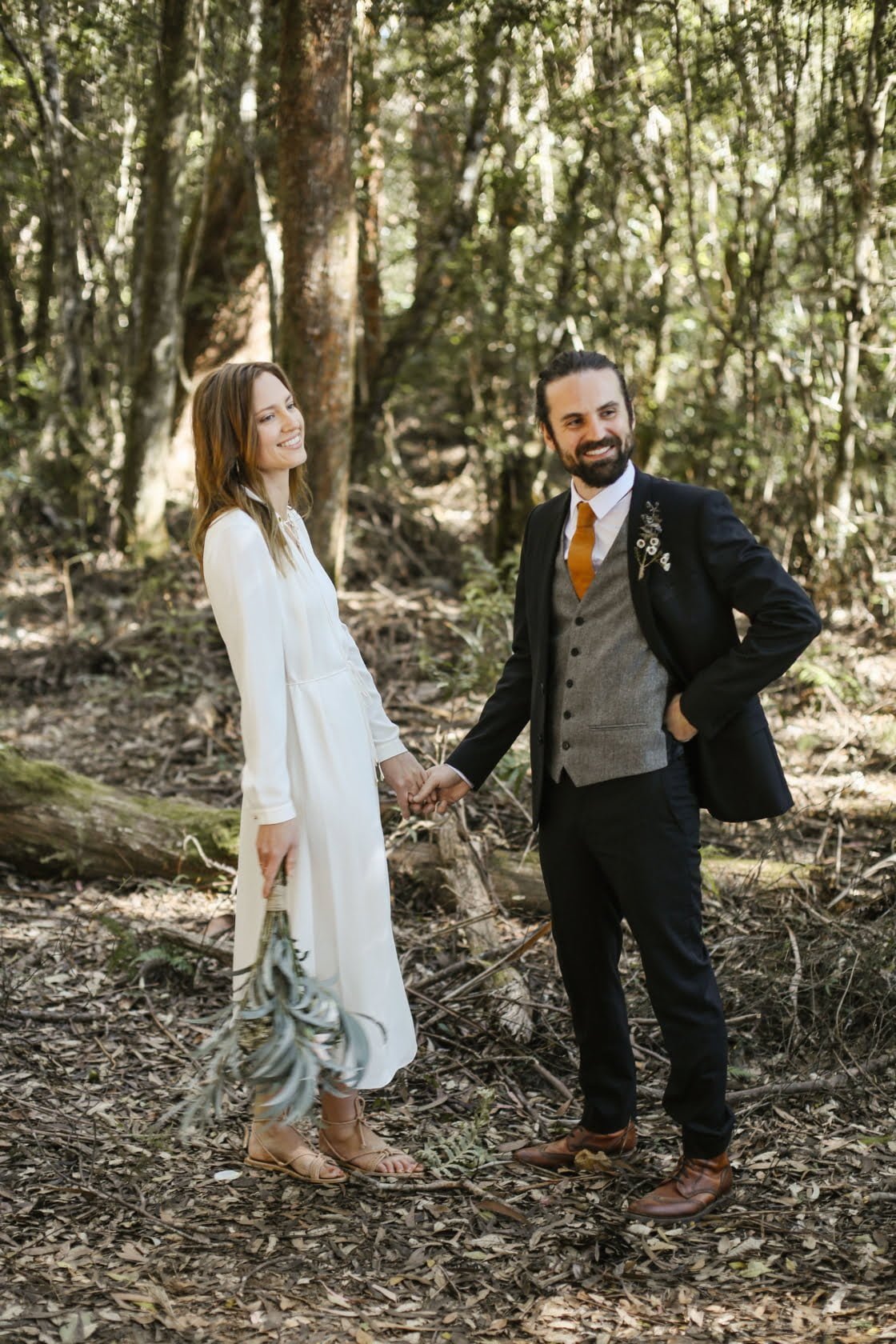 THE VENUE “We had just moved into our own home and decided that it would be nice to have the reception at home so we could just be ourselves. It had everything we needed and we only wanted a small wedding of 25 people. So that was easy. We did want the ceremony to be amongst the trees though. So we went on a few walks around our area and found a nice secluded forest that was easily accessible and had a rogue ceremony with no styling or set-up, just the big trees surrounding us.”