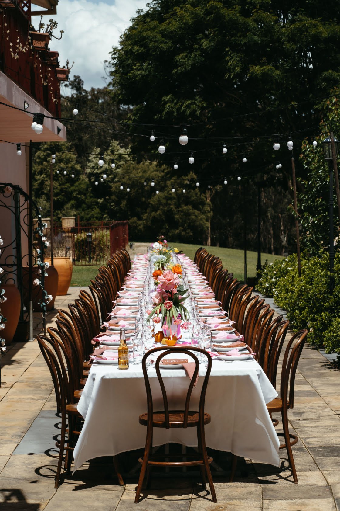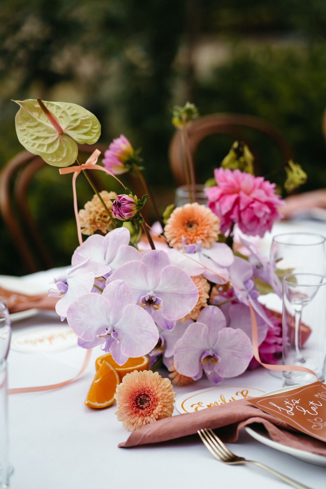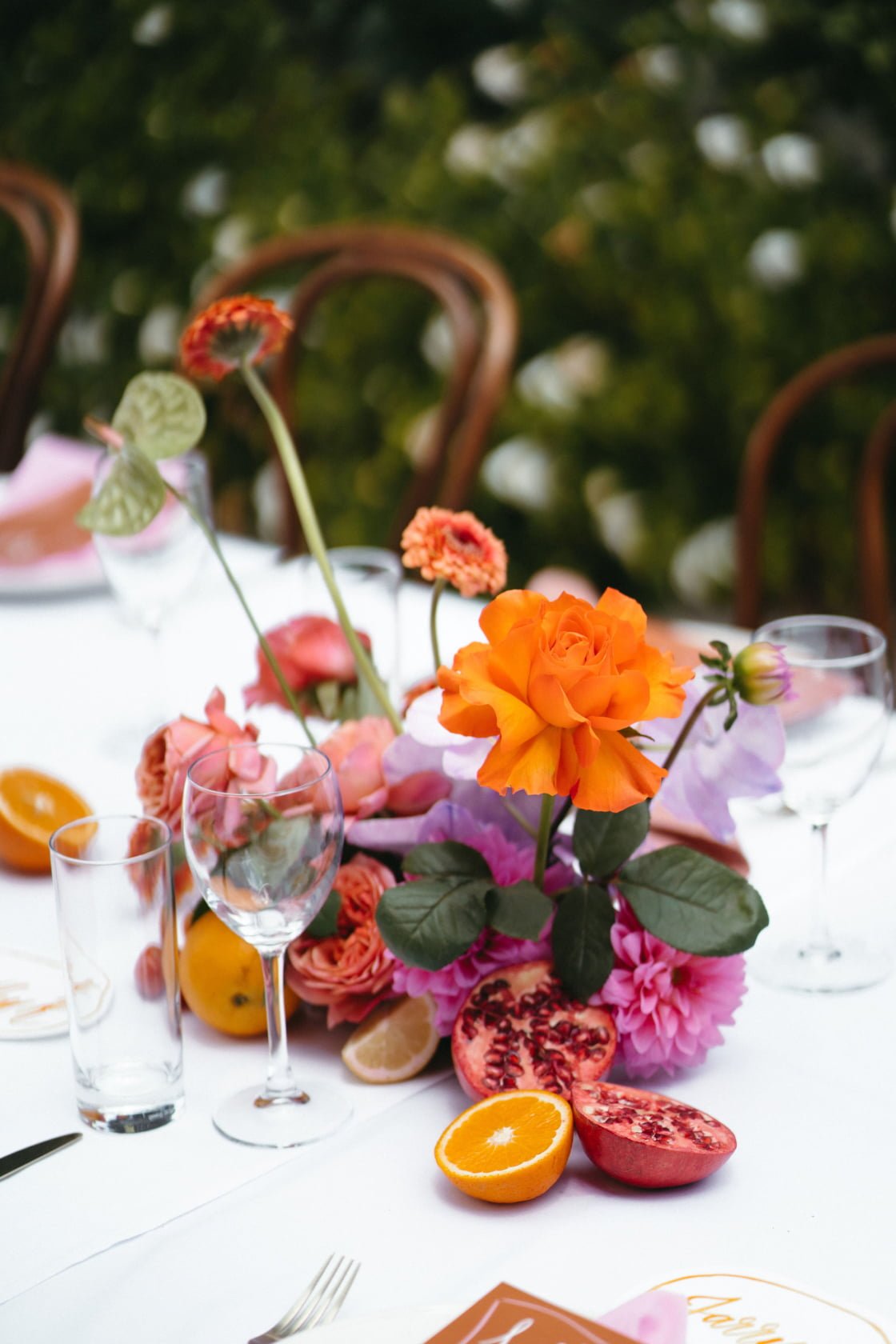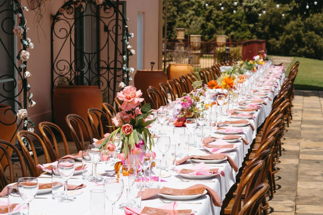 Inspiration for the day, says the bride, came from “Nadia Fairfax’s garden wedding. We had incredible colourful orchids, roses, gerberas and tulips in vases all across the table, decorated with oranges, lemons, pomegranates and tomatoes on the vine. Napkins, hand dyed, in alternating soft pink and caramel brown with terracotta-coloured menus on each plate and handwritten watercolour name tags.” What. A Dream.
