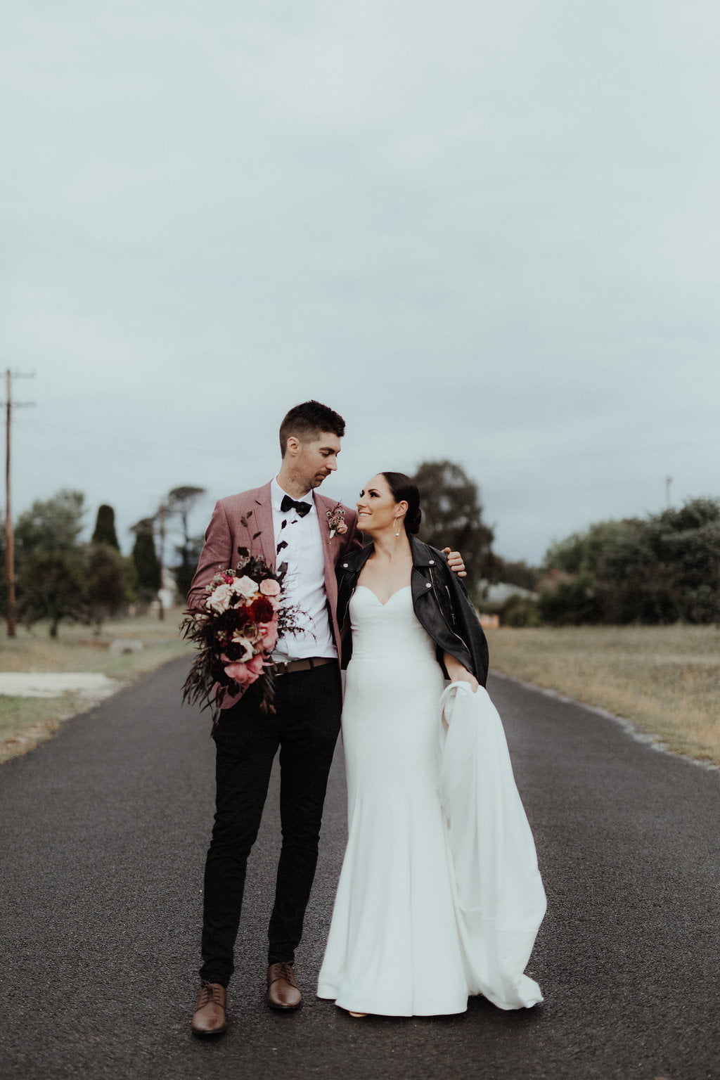 CONTRIBUTING VENDORS Photographer Corrina & Dylan Stylist Willowhouse Weddings & Events Florist Lilygrace Flowers Invitations Butters Creative Place Cards Design Fusion Studio Ceremony & Reception Grazing Cake La Ombre Creations Linen Napkins Table Art Hire Items Showpony Events Photo Booth Mugshots Photo Booths Neons MK Neon Signage MP Signs Entertainment DJ Lipgloss & Ruby Kentwell Celebrant A Girl Meets a Boy Transport Deane Transport BRIDE Bridal Gown Custom-Made Veil Kathryn Lemin Designs Leather Jacket Just Jeans Pyjamas Homebodii Rings Creations Jewellers Shoes Pied a Terre Earrings Dinosaur Designs Hair Kate Lily Dressing Hair Makeup Jacklyne Leigh Bridesmaid Dresses Cue, Kookai, C/MEO Collective, Esther Bridesmaid Gifts The Daily Edited GROOM Suit Jacket West End by Simon Carter Shirt InStitchu Pants yd. Bow Tie & Shoes Connor Ring Michael Hill
