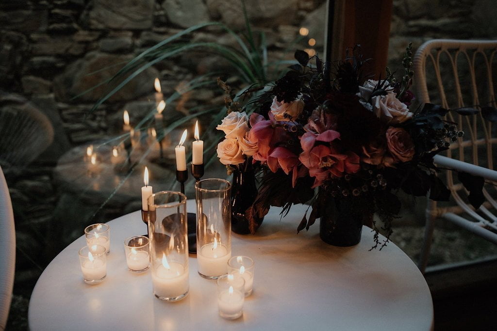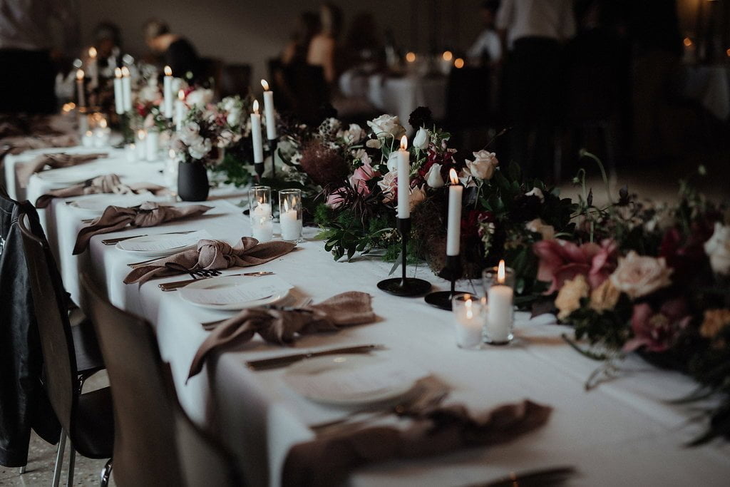THE THEME “After changing my mind a thousand times about the style of our wedding, I looked to my everyday life, my wardrobe and our home. I found a recurring theme of black, white and pink and it was decided. We wanted the flowers to be our main styling item, so I kept everything else simple with a modern monochrome look and added touches of colour with the napkins and Lanky’s suit jacket to tie it all together. I used the flowers and candlelight to add warmth and mood to an otherwise stark white room and we were thrilled with the result!”