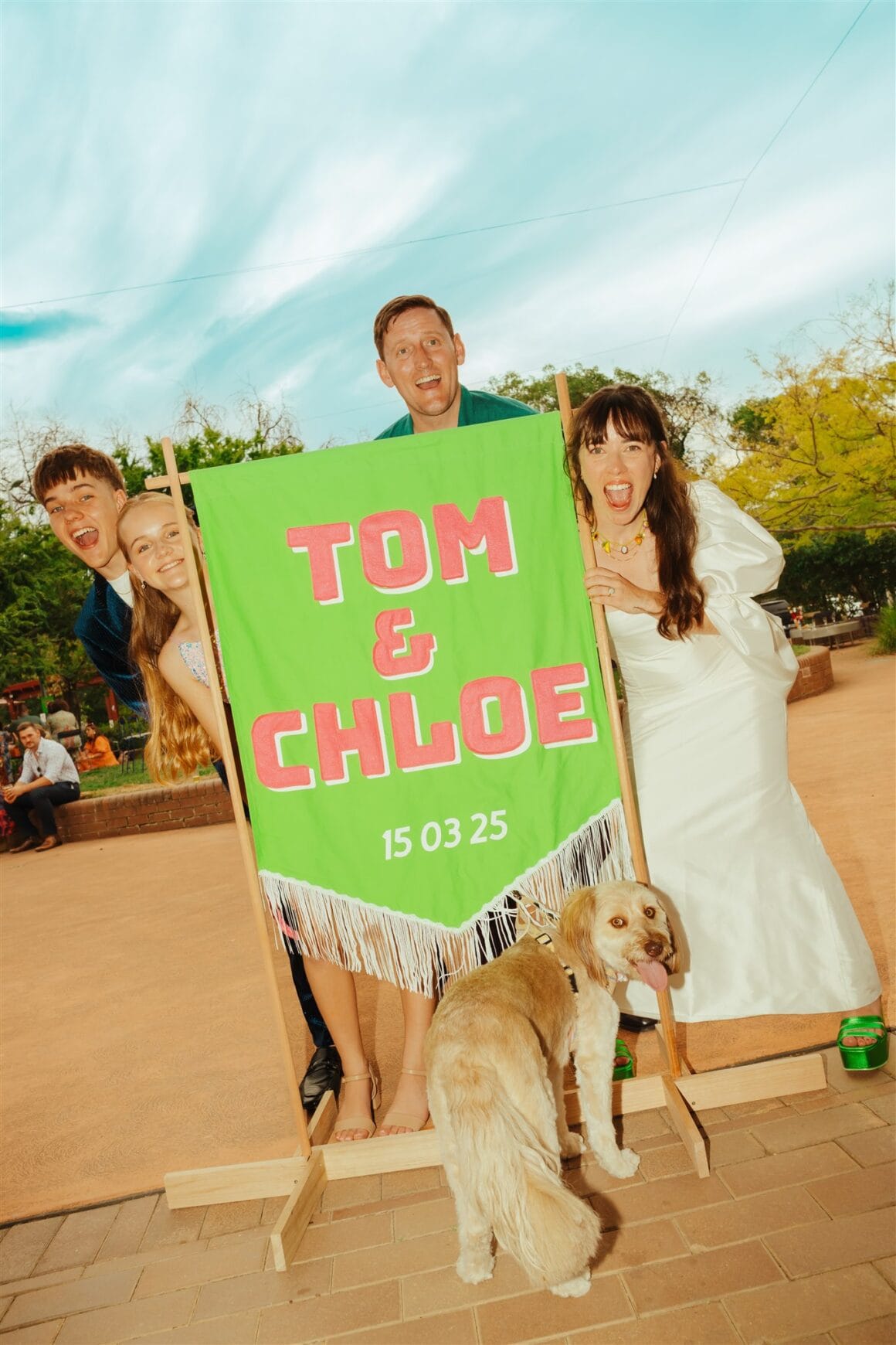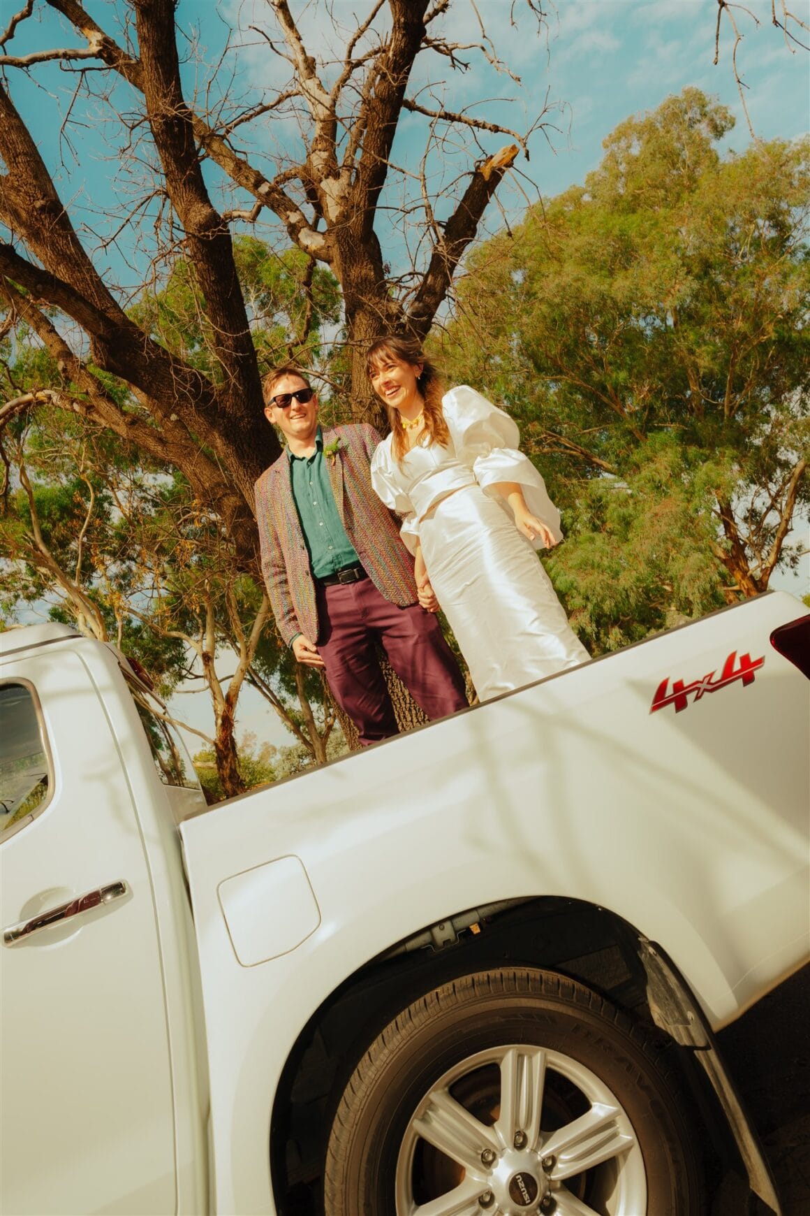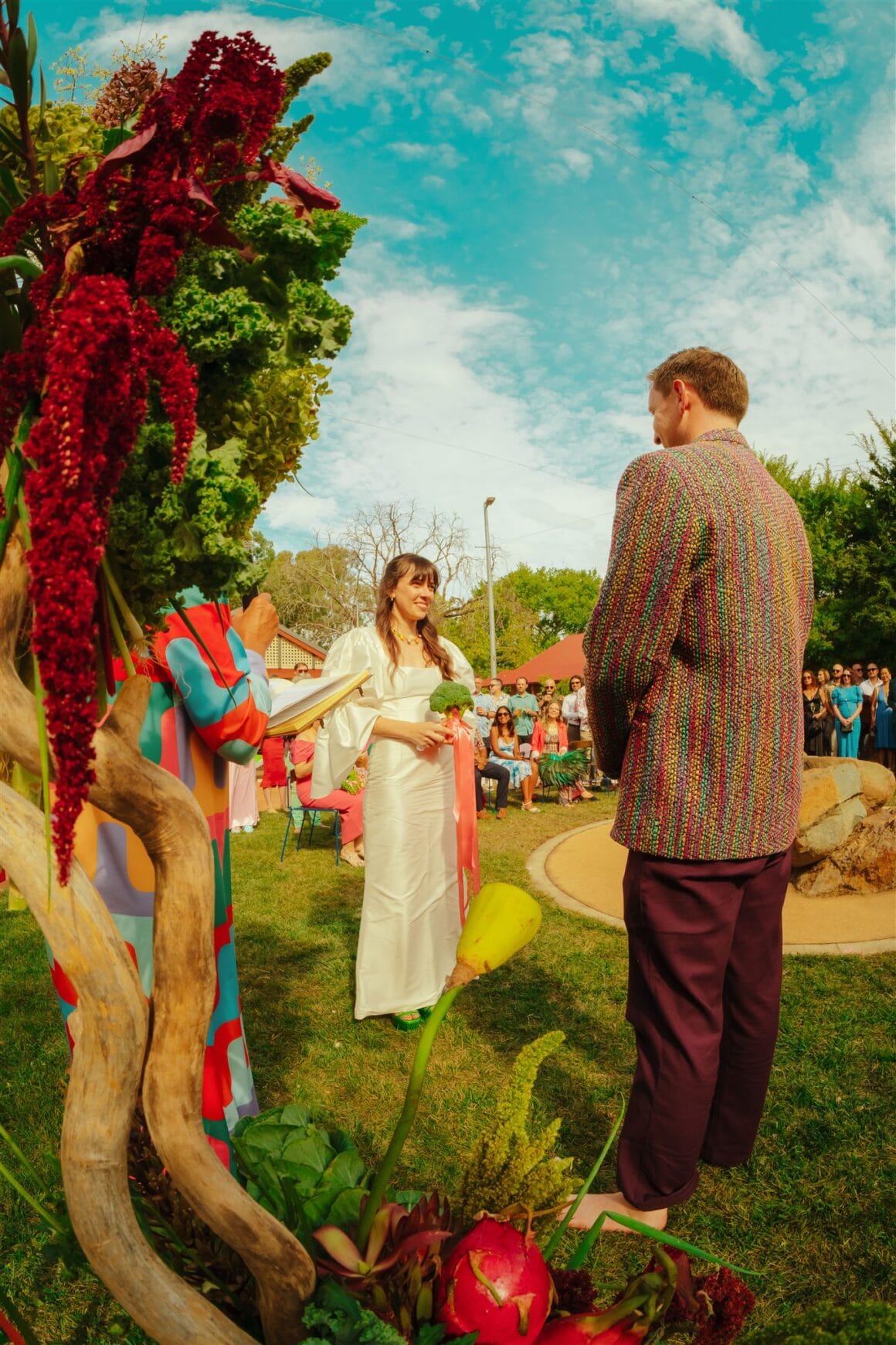 Chloe and Tom, who first locked eyes in a Sydney karaoke room, really know how to think outside the box. It’s why we’re OBSESSED with their quirky Canberra nuptials. Guests dressed in their finest ‘fresh and juicy’ attire to see their union at Bicentennial Square. The groom had always dreamt of wearing something from Joe Bananas, and his own wedding seemed “like a good time to splash out”. Meanwhile, our bride wore Van Der Kooij for the formalities before switching into a fun party frock that she actually made herself using an “eclectic collection” of secondhand textiles.