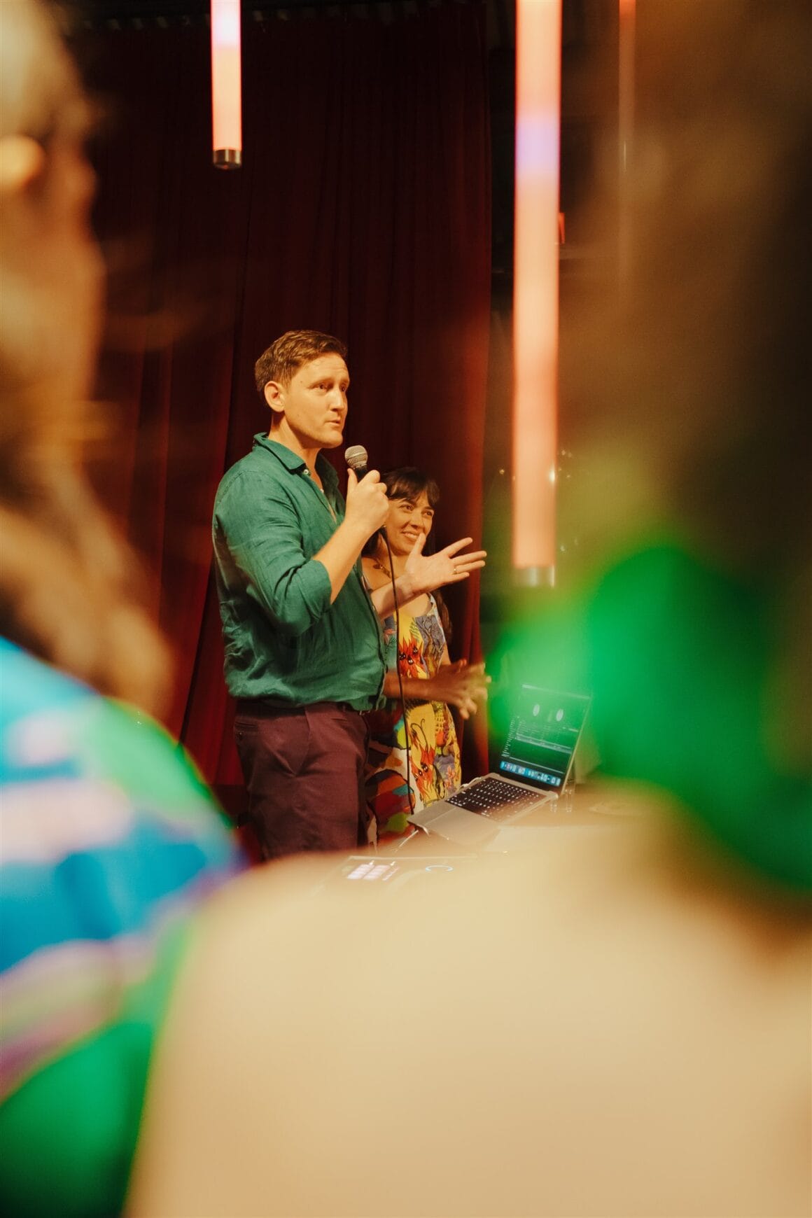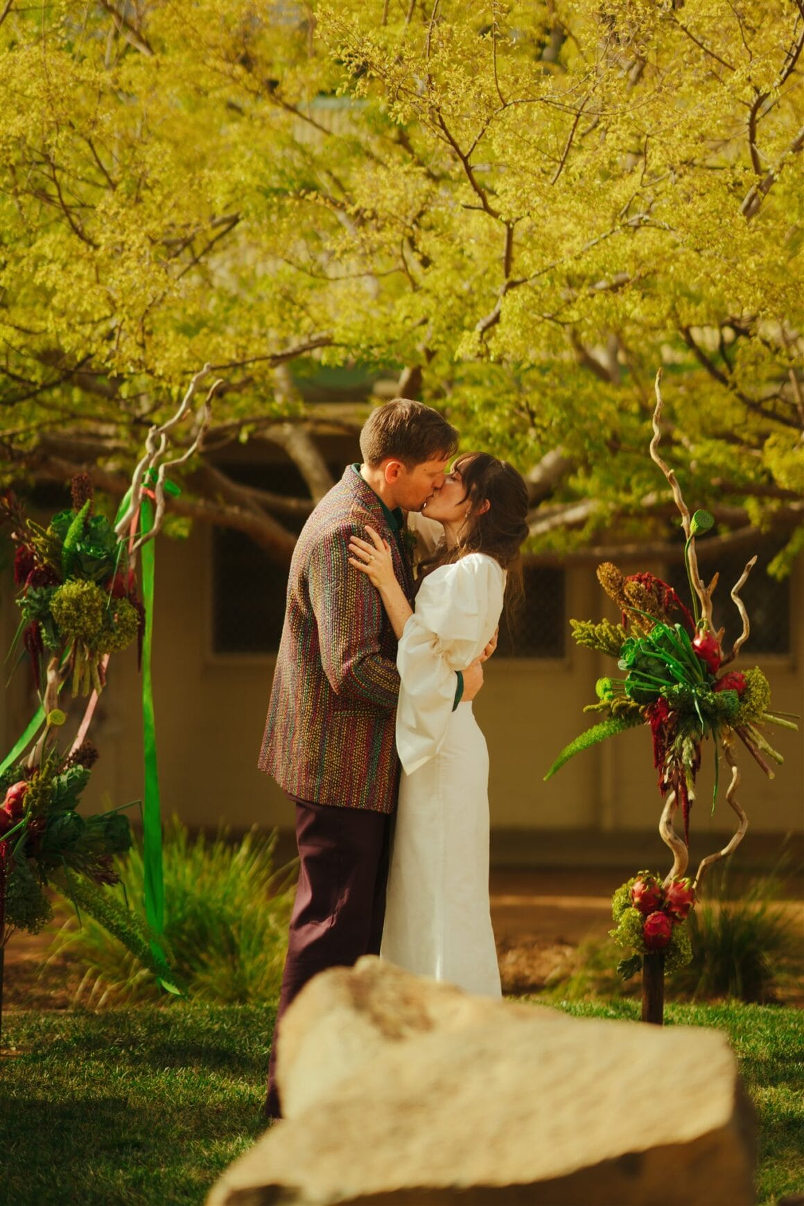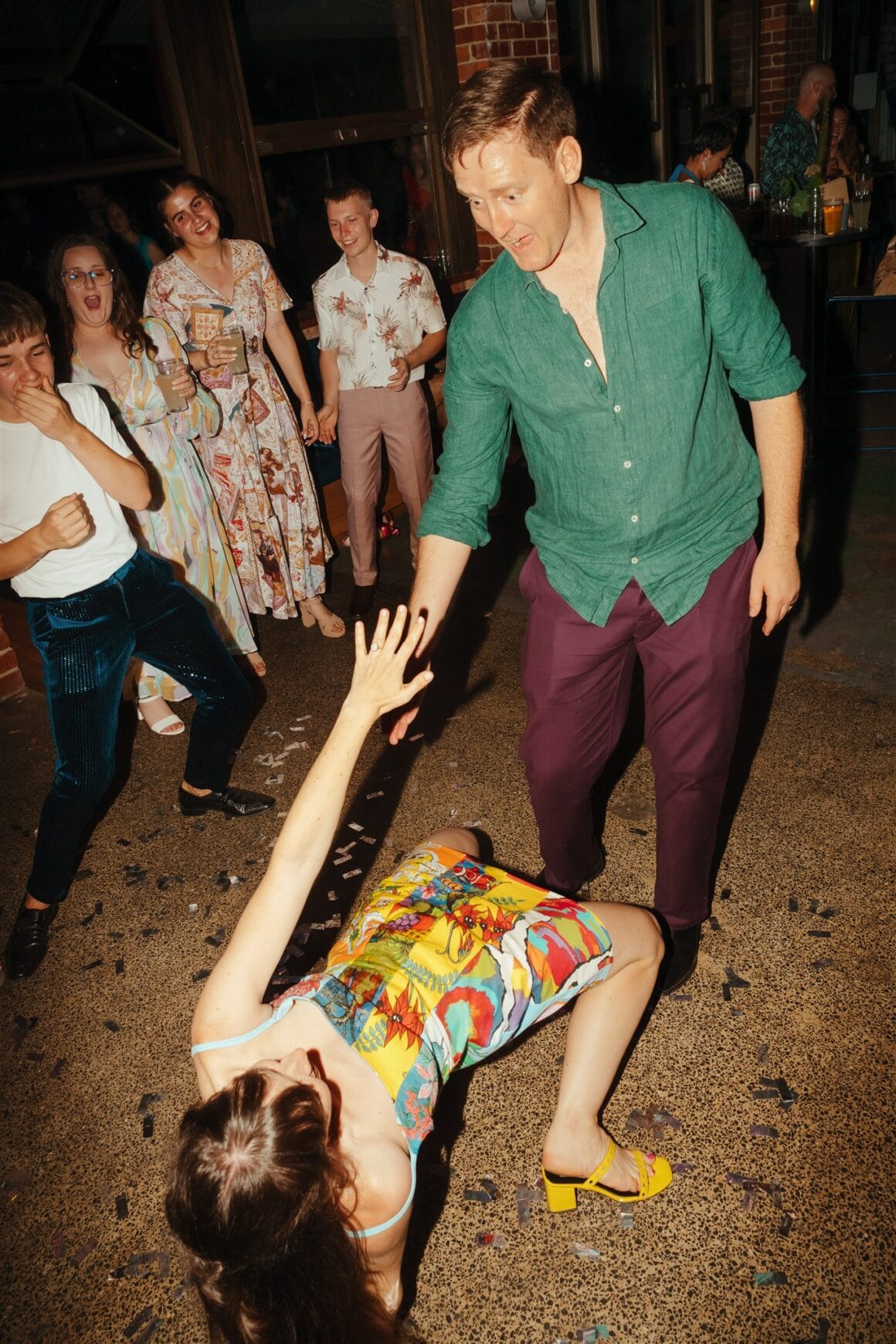 Chloe and Tom, who first locked eyes in a Sydney karaoke room, really know how to think outside the box. It’s why we’re OBSESSED with their quirky Canberra nuptials. Guests dressed in their finest ‘fresh and juicy’ attire to see their union at Bicentennial Square. The groom had always dreamt of wearing something from Joe Bananas, and his own wedding seemed “like a good time to splash out”. Meanwhile, our bride wore Van Der Kooij for the formalities before switching into a fun party frock that she actually made herself using an “eclectic collection” of secondhand textiles.