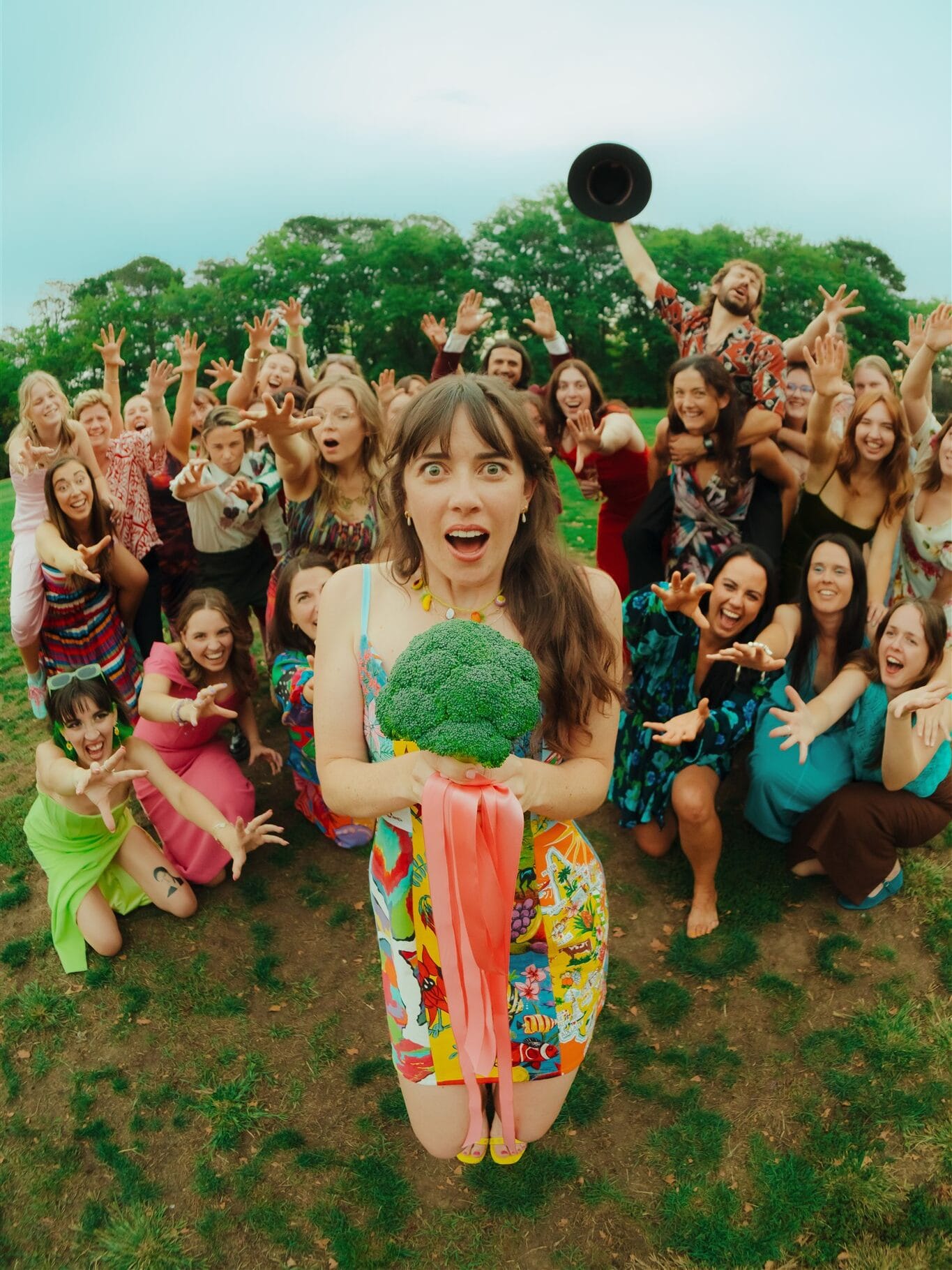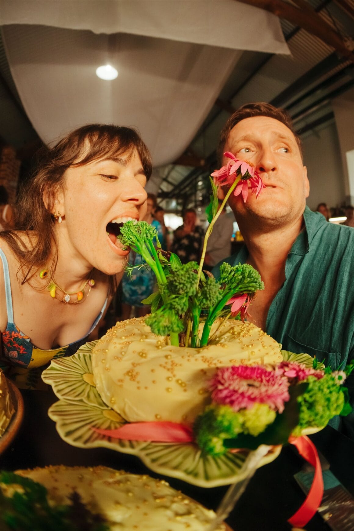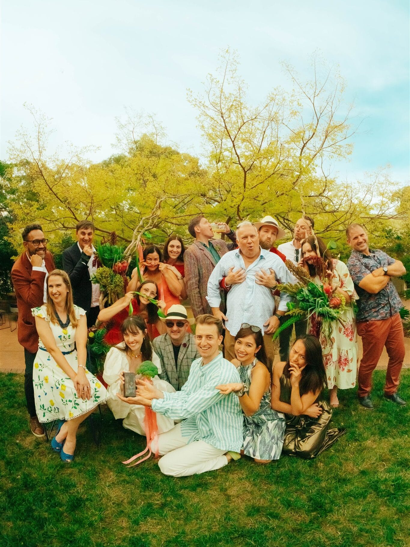 “The first night that we met in Sydney, the karaoke crew, including Chloe, came back to my house for a nightcap and a chat. It was there that I showed Chloe the odd assortment of vegetables growing in the small courtyard. I proudly displayed herbs, chillies, some carrots grown in a toaster, and a solitary broccoli named Peter Broc. We devoured poor Peter raw and, from that day, fresh fruits and vegetables became a theme of our relationship. When the topic of a dress code or theme came around, we weren’t happy with the idea of just “black tie” or “cocktail”; it all felt too restrictive. So we came upon a more artistic concept – a theme that would allow everyone to wear what they wanted, express themselves, be unfettered, and bring the colour and vibrancy that we wanted to see on the day. ‘Fresh and juicy!’ (The crowd sure did not disappoint on the day, and we loved how it was interpreted.”