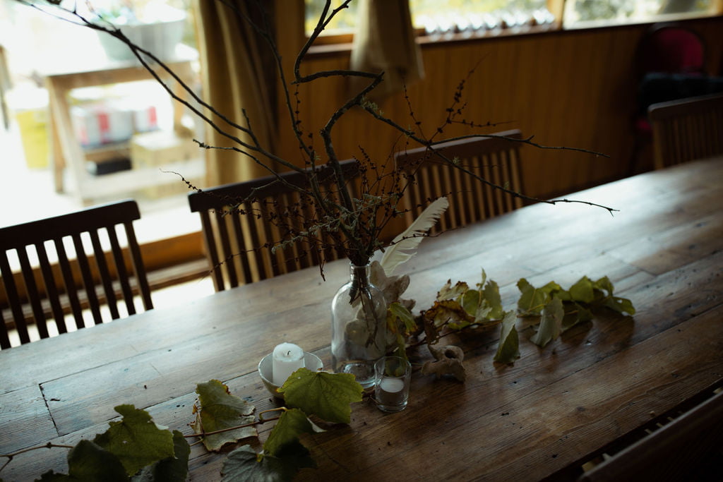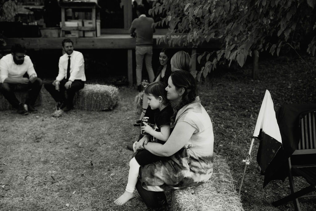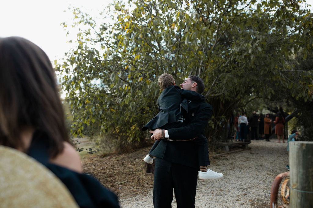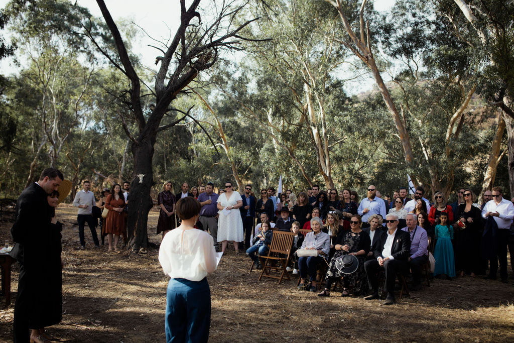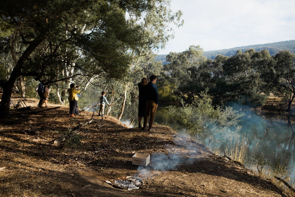 A TOUCH OF TRADITION “We hated the idea of Claire’s Dad ‘giving her away’. It felt really dated and disempowering. Instead, we waited by the river together. Our guests were invited to find us in the forest using a path marked by hand painted flags. Our guests were asked to take their time, absorb the environment and write down an intention. Along the way, we had two musicians hidden in trees playing call and response to each other. Forest, our 5-year-old, and my niece and nephews lead the way waving their own flags. It was about a fifteen-minute walk. Dave and I greeted everyone at the ceremony site and the children collected a written intention for the day from each person which we had asked our guests to create. It was a lovely way to begin the ceremony as it meant that we got to greet each one of our guests and welcome them individually. As part of our ceremony, we had our mothers bind our hands. Then with our hands bound, we worked together to light the intentions on fire, to send them away. We never read them, but it felt like a powerful way to focus everyone’s energy for the day.”