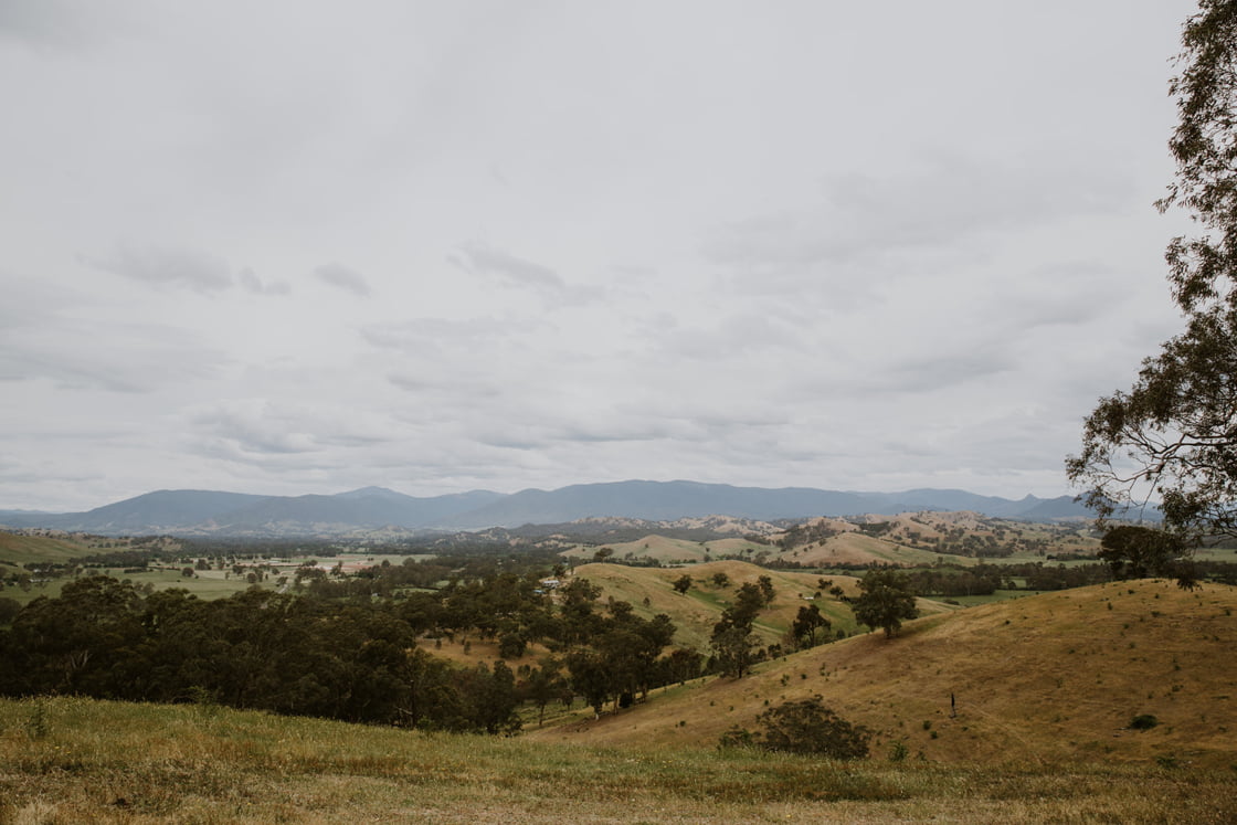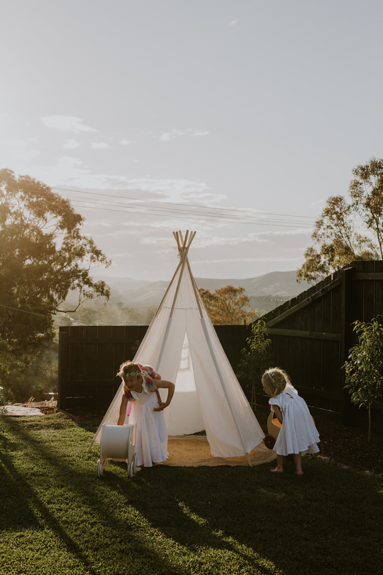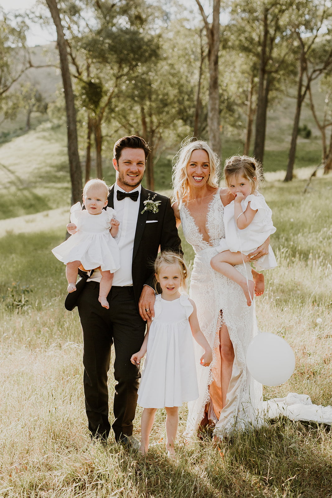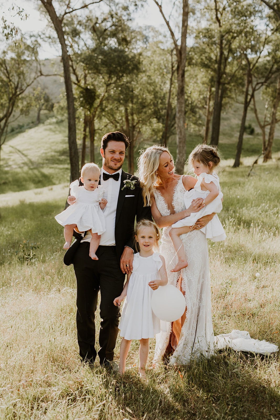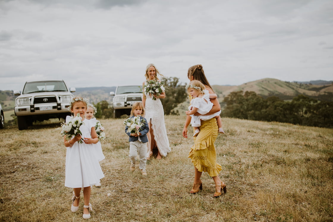 THE VENUE “After looking over tonnes of options from wineries to holiday homes, Hawaii to Broome, one day I said to Jay, “why don’t we just have the wedding here, at home?”. We had just finished building our house and rather than spending money on a venue we decided to put that money into our landscaping. Jay’s parents have a beautiful property that looks over the Cathedral Ranges. We took a drive up to the top of their hill one day with the kids and thought yep, why would we do it anywhere else? From that day on there was no more questioning, it felt right. It was perfect with kids too, they kept themselves busy while mum and dad had a blast!”
