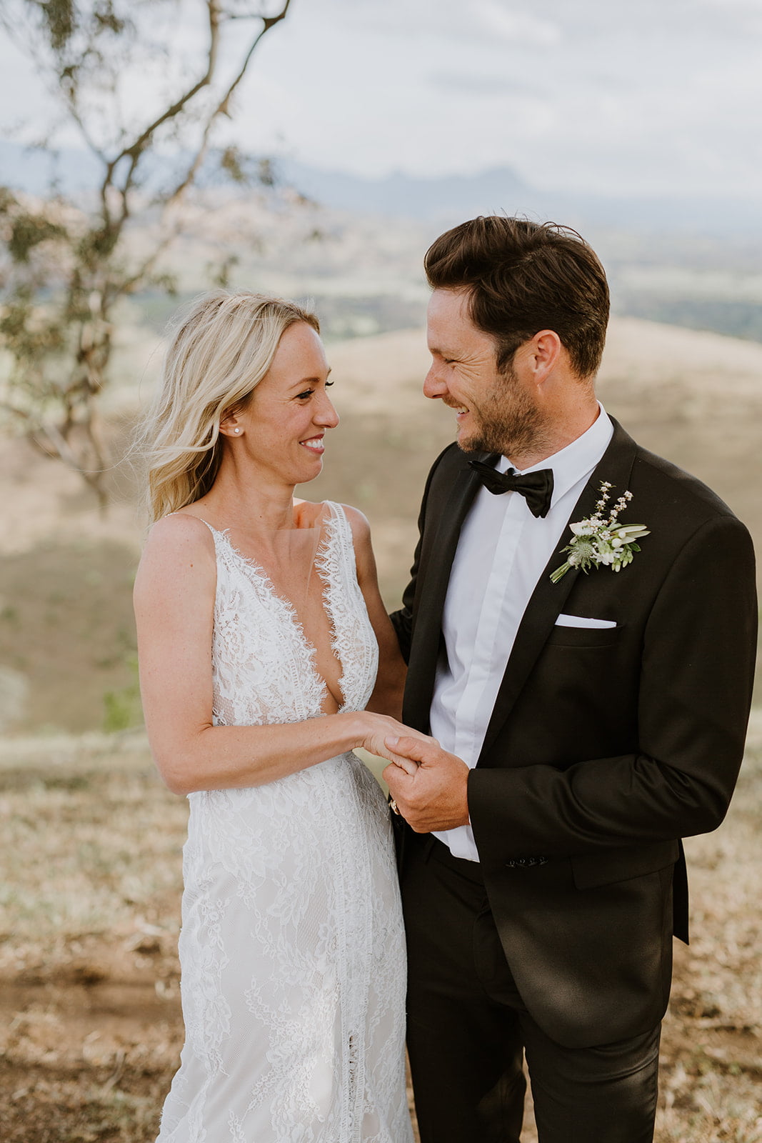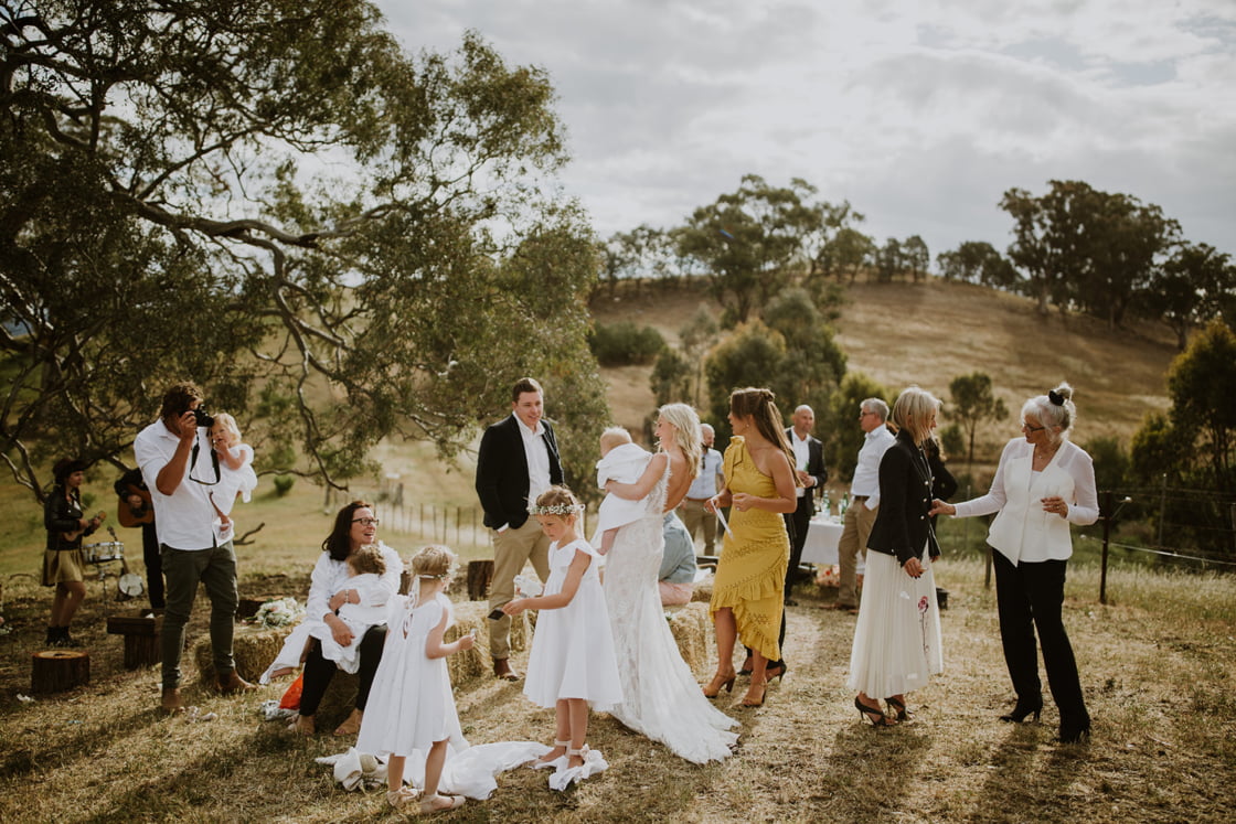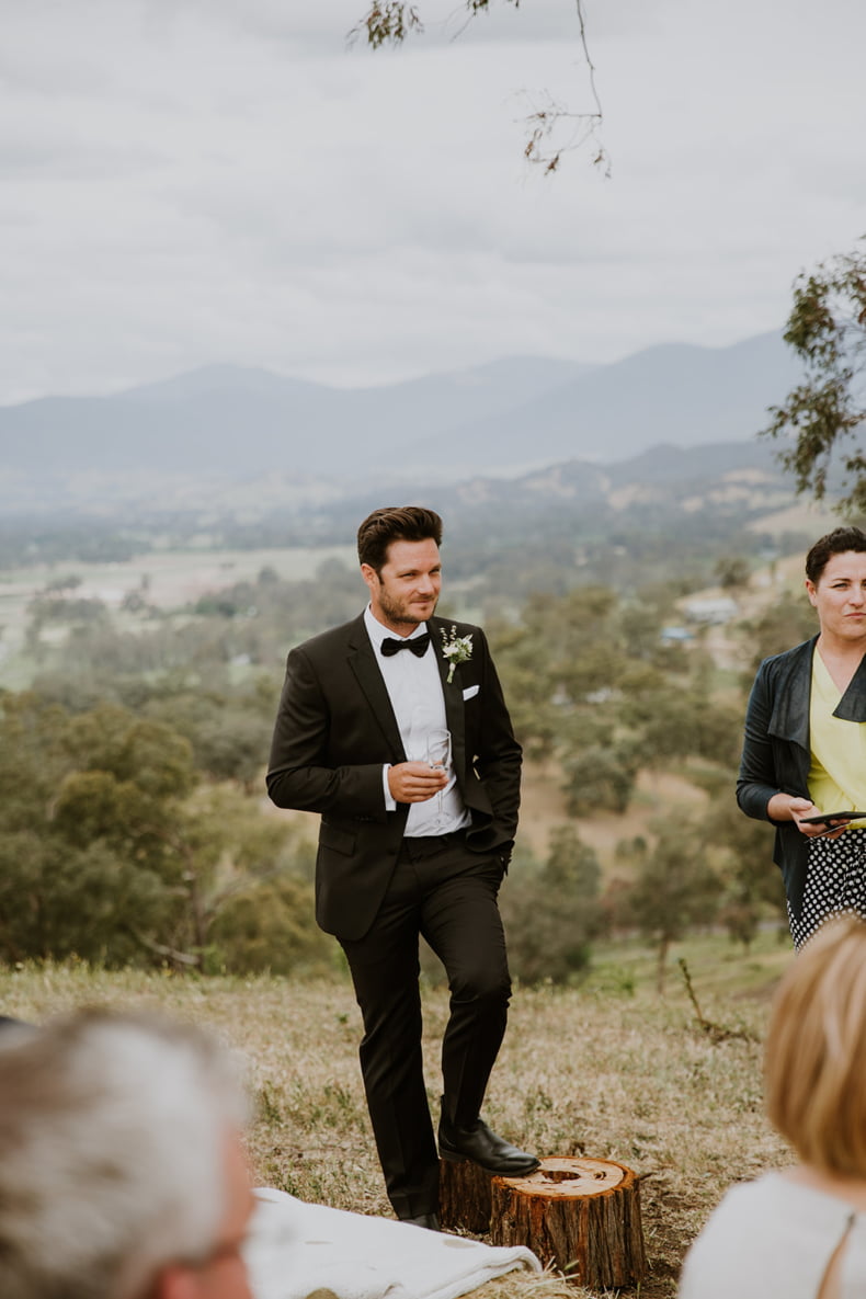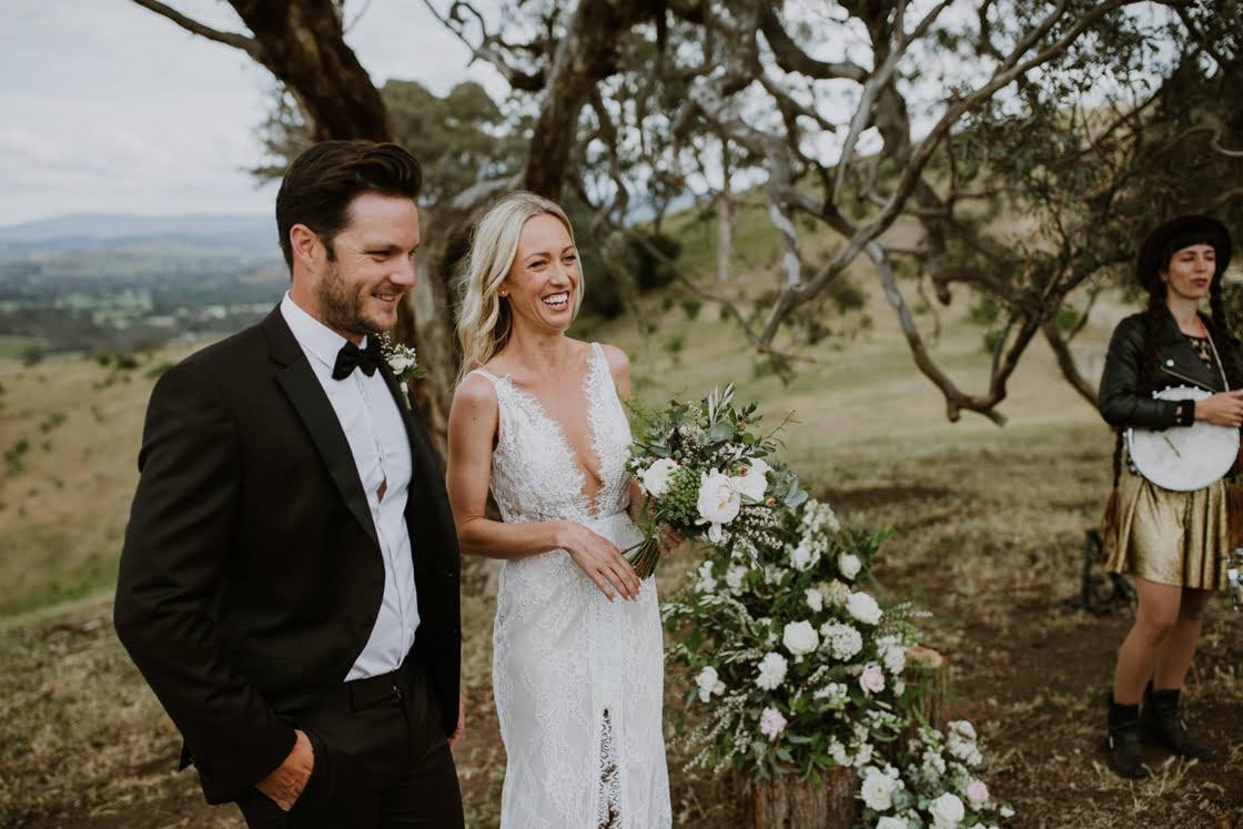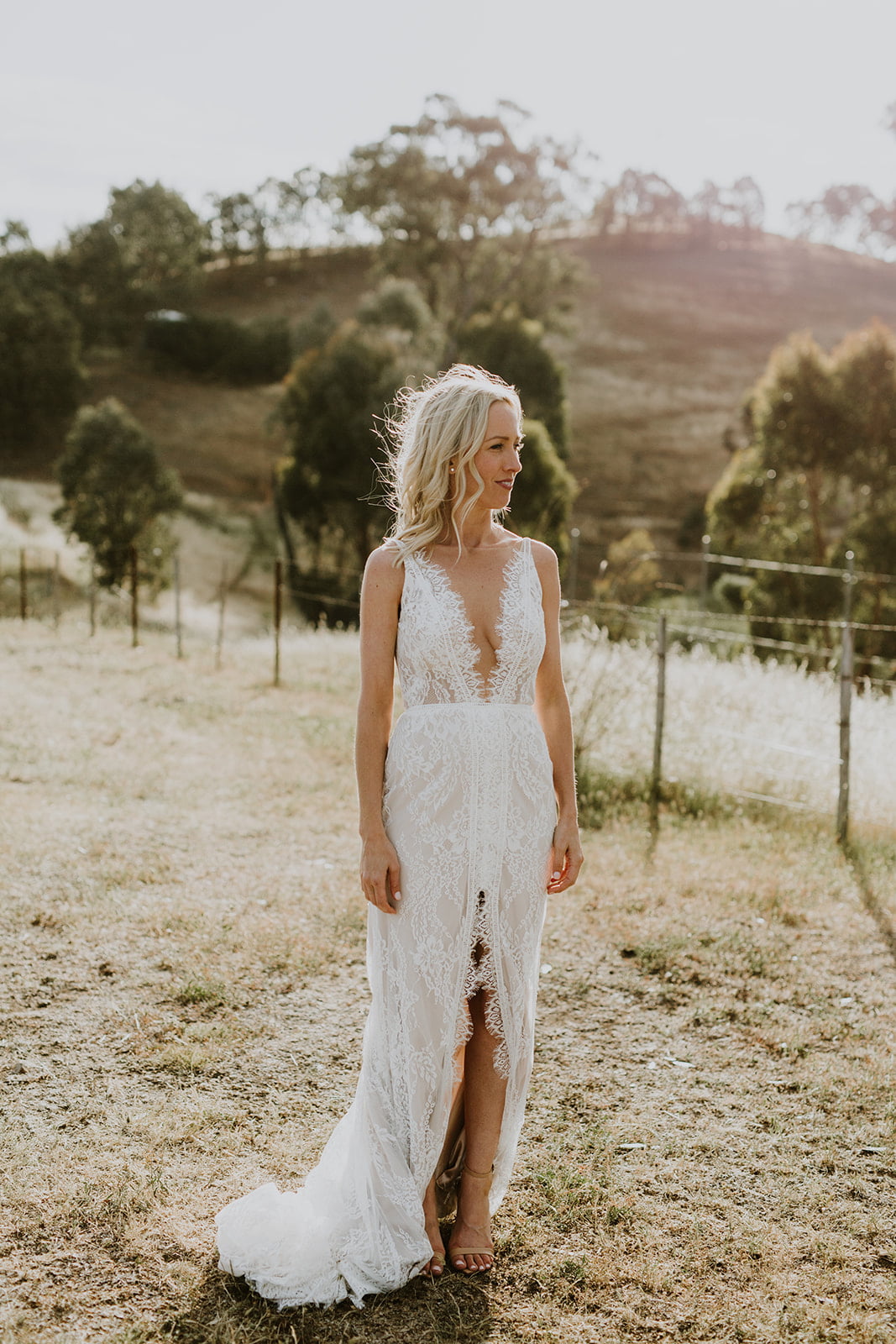 THE VENUE “After looking over tonnes of options from wineries to holiday homes, Hawaii to Broome, one day I said to Jay, “why don’t we just have the wedding here, at home?”. We had just finished building our house and rather than spending money on a venue we decided to put that money into our landscaping. Jay’s parents have a beautiful property that looks over the Cathedral Ranges. We took a drive up to the top of their hill one day with the kids and thought yep, why would we do it anywhere else? From that day on there was no more questioning, it felt right. It was perfect with kids too, they kept themselves busy while mum and dad had a blast!”