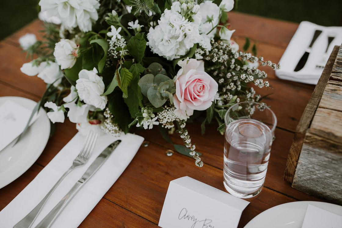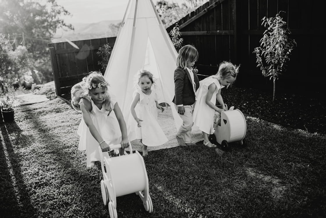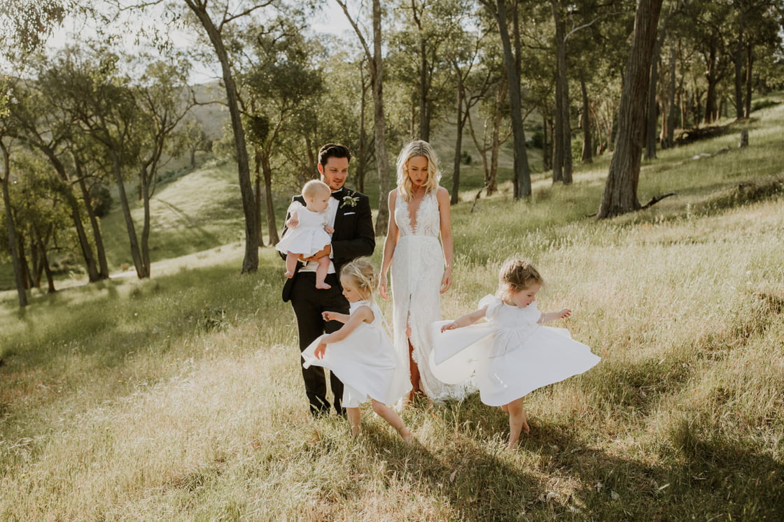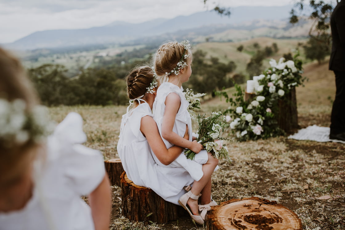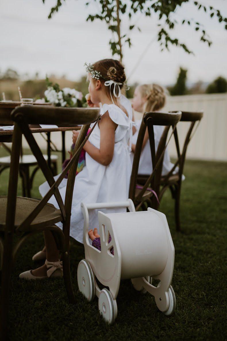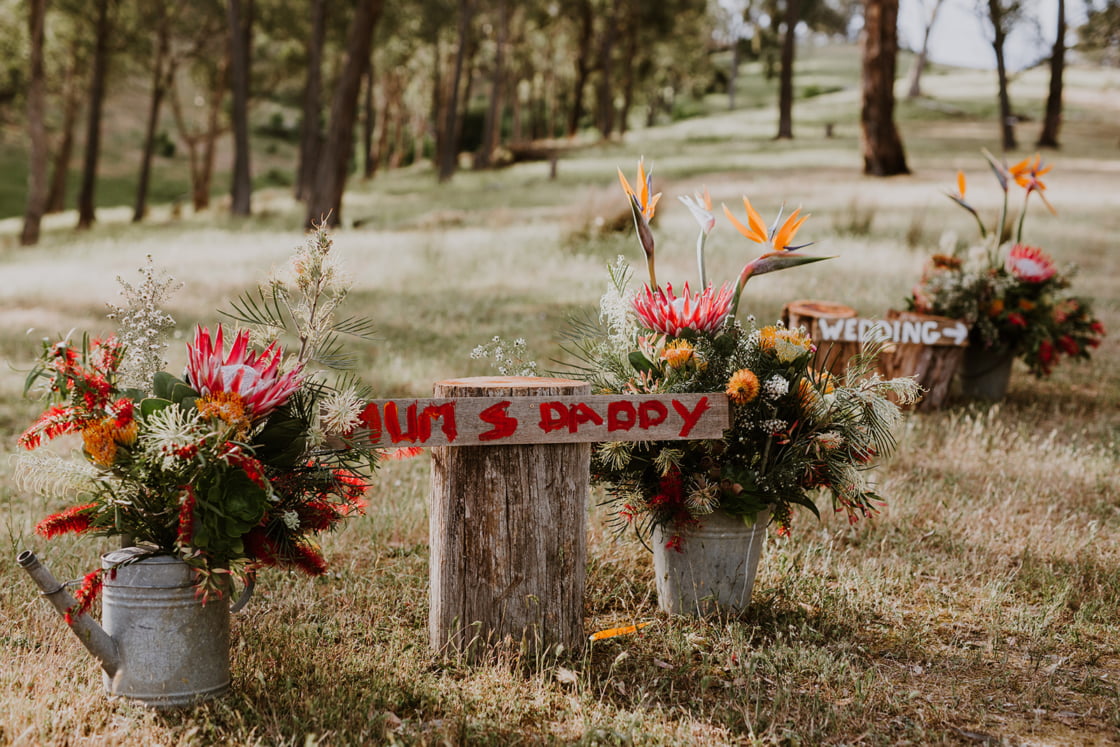 FAVOURITE DETAILS “Our little girls Oma had been taking the girls off to her house for a very special project in the weeks leading up to the wedding. They were very good at keeping this little surprise a secret and on the day Jay and I were so happy to see what they had done. On the hill leading up to the wedding ceremony, they had hand-painted signs saying ‘Mum and Daddy’s wedding’ and then on different trees leading up to the hill were their names along with their little cousins painted on signs. It was so so beautiful seeing how much work they had put in and how proud they were. Little Blossoms!”