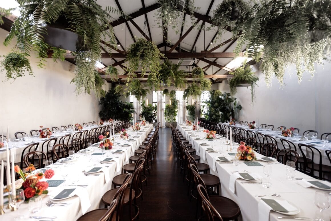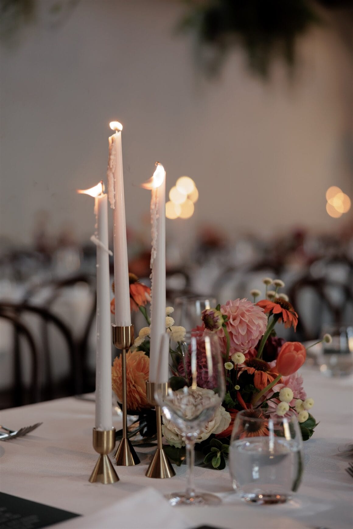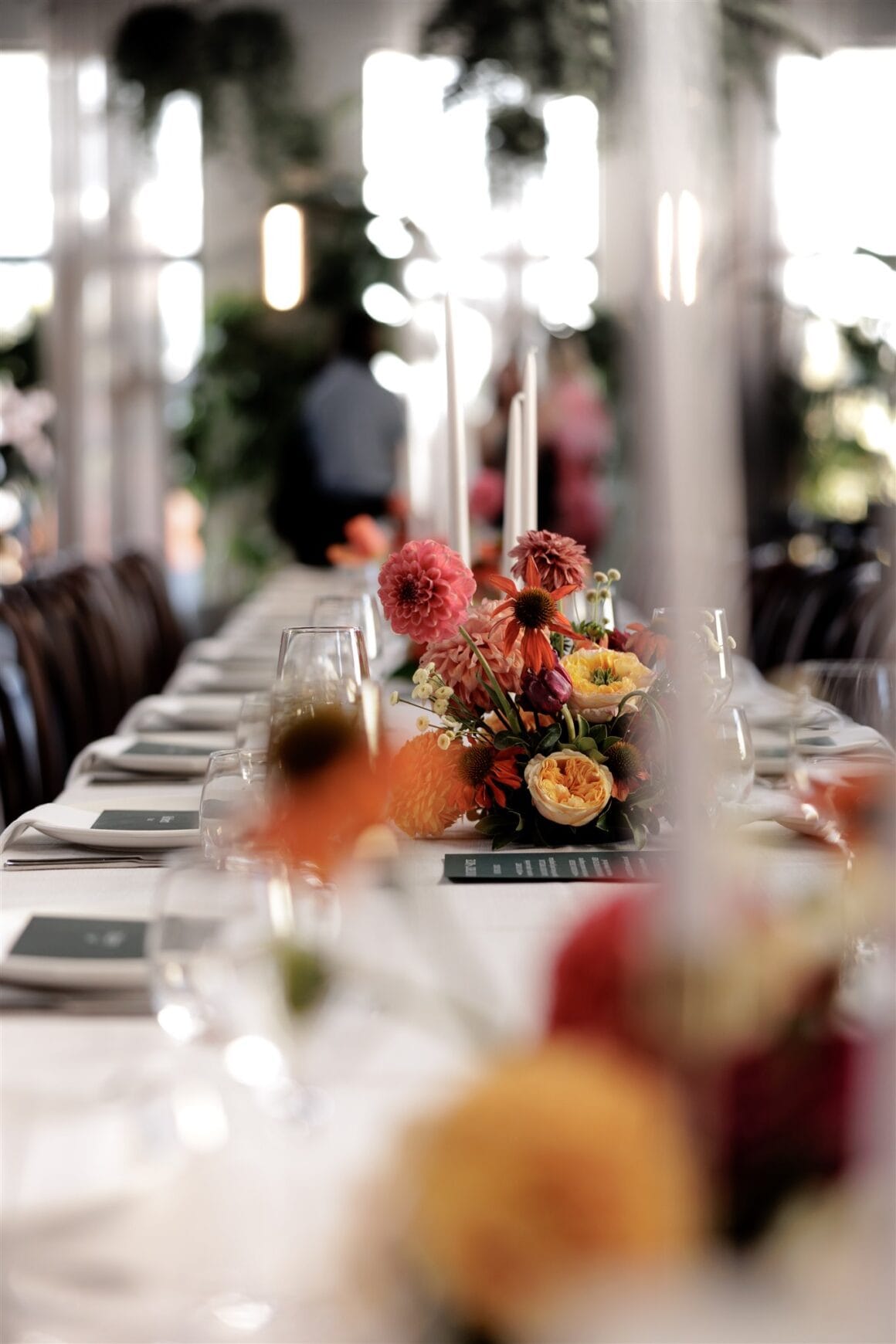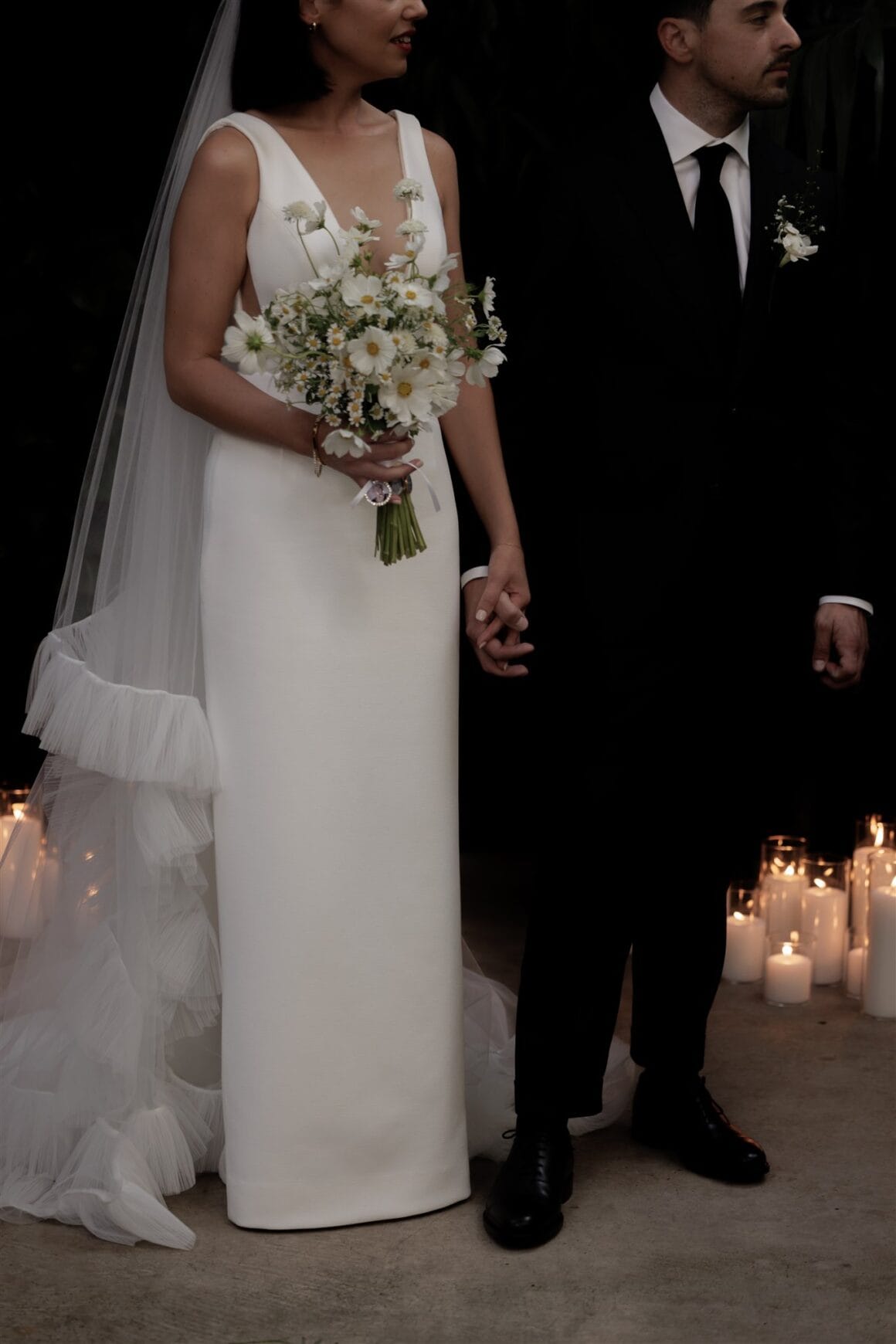 THE VENUE “A quick Google search led us to Glasshaus. It was the first and only place we visited. We held our ceremony at Glasshaus Inside, which we loved for its industrial edge and natural lighting. Just adding some pillar candles ended up softening the space. As for [our reception space] Glasshaus Brucke, we were drawn to the architecture. We added our own touches of bright flowers, tapered candles and overhanging linen to lift the space. The best part was the place evolved into a moody, romantic space as night fell.”