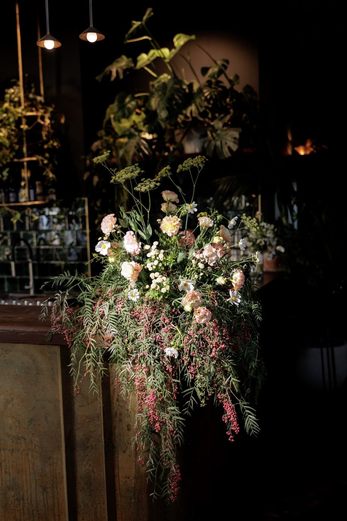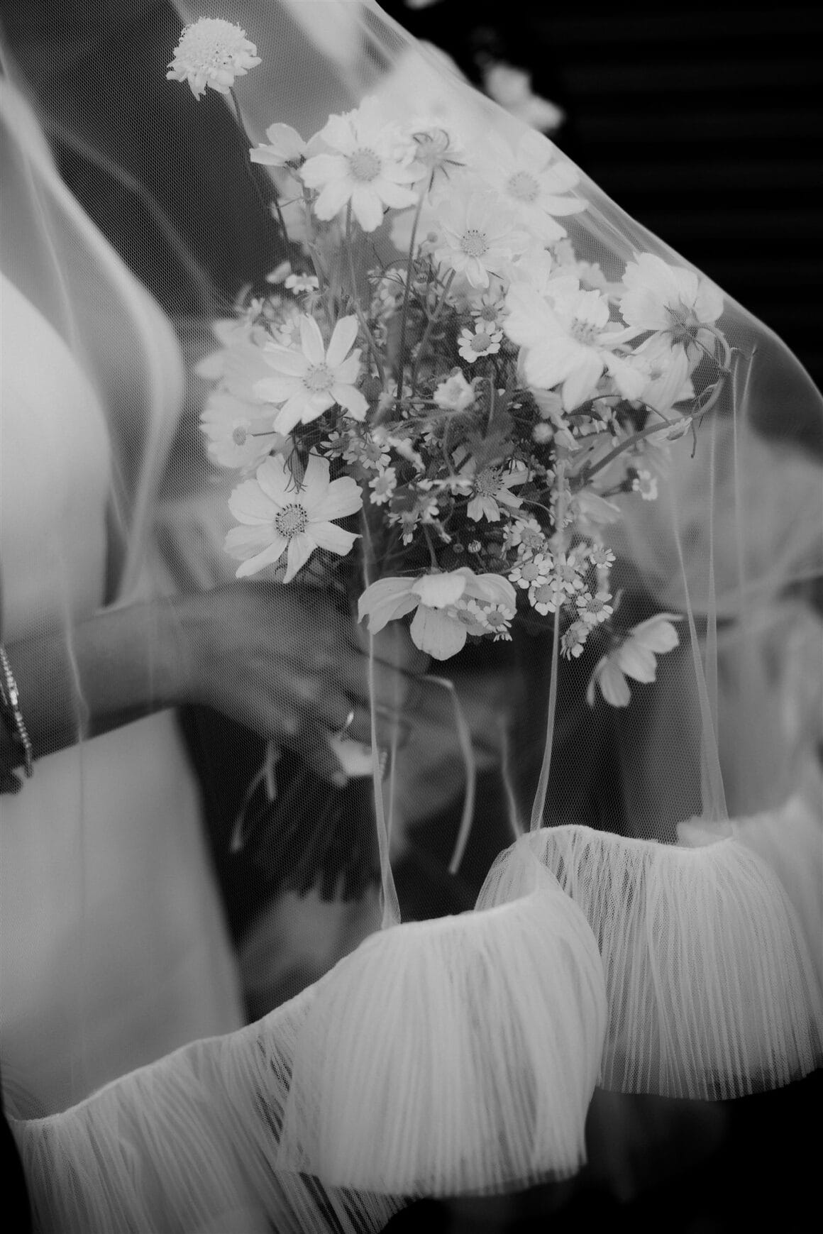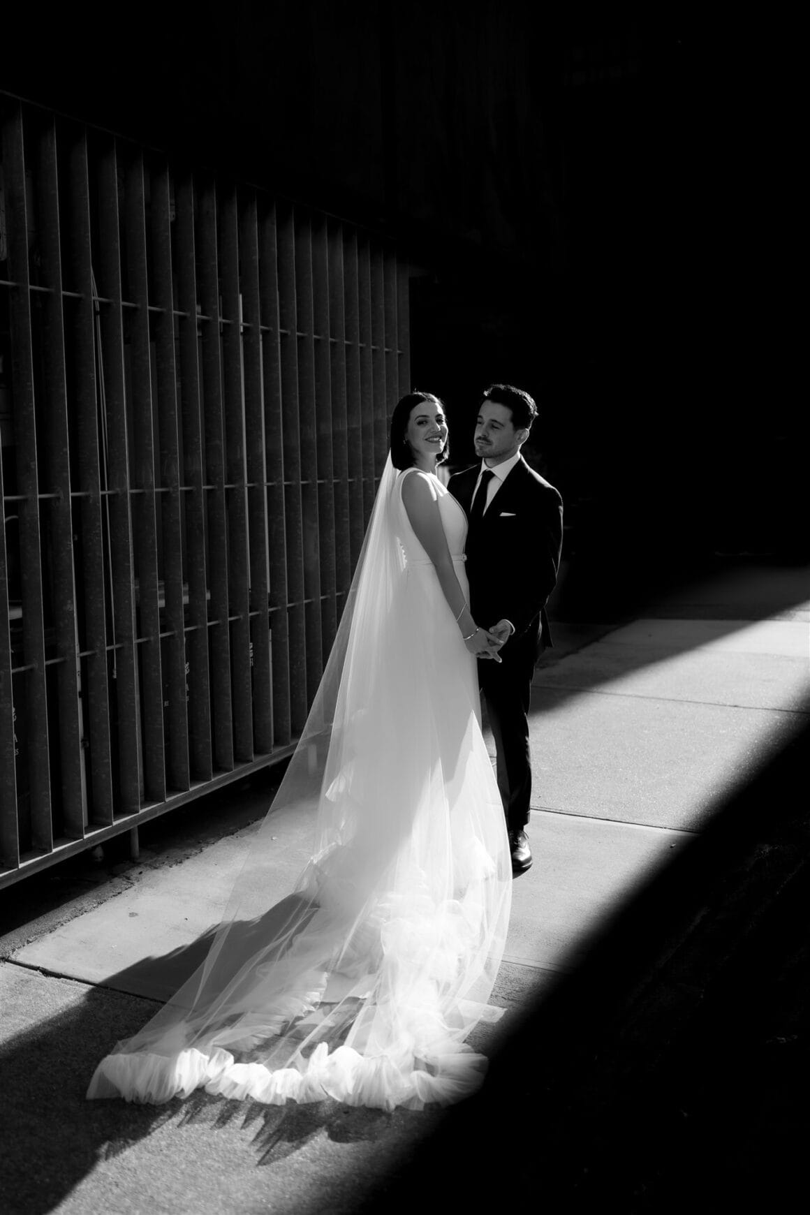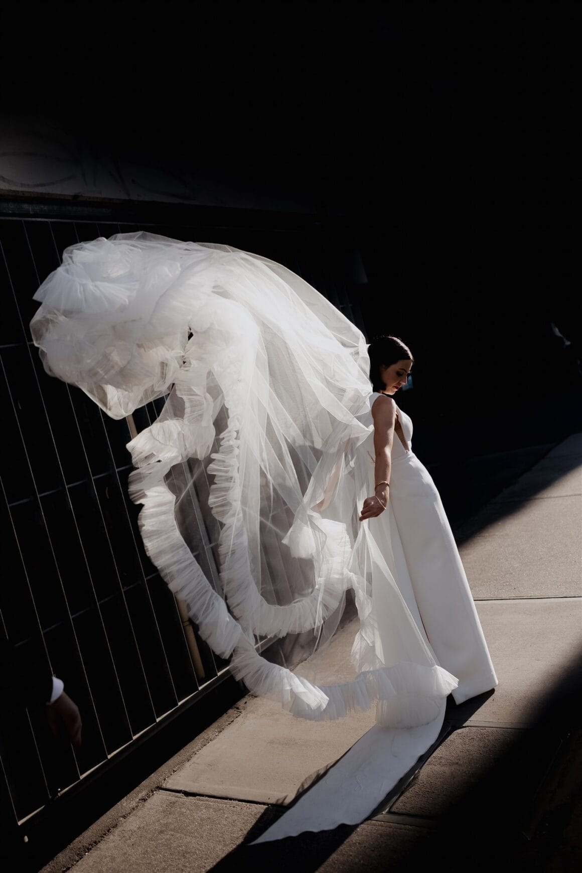 THE VENUE “A quick Google search led us to Glasshaus. It was the first and only place we visited. We held our ceremony at Glasshaus Inside, which we loved for its industrial edge and natural lighting. Just adding some pillar candles ended up softening the space. As for [our reception space] Glasshaus Brucke, we were drawn to the architecture. We added our own touches of bright flowers, tapered candles and overhanging linen to lift the space. The best part was the place evolved into a moody, romantic space as night fell.”