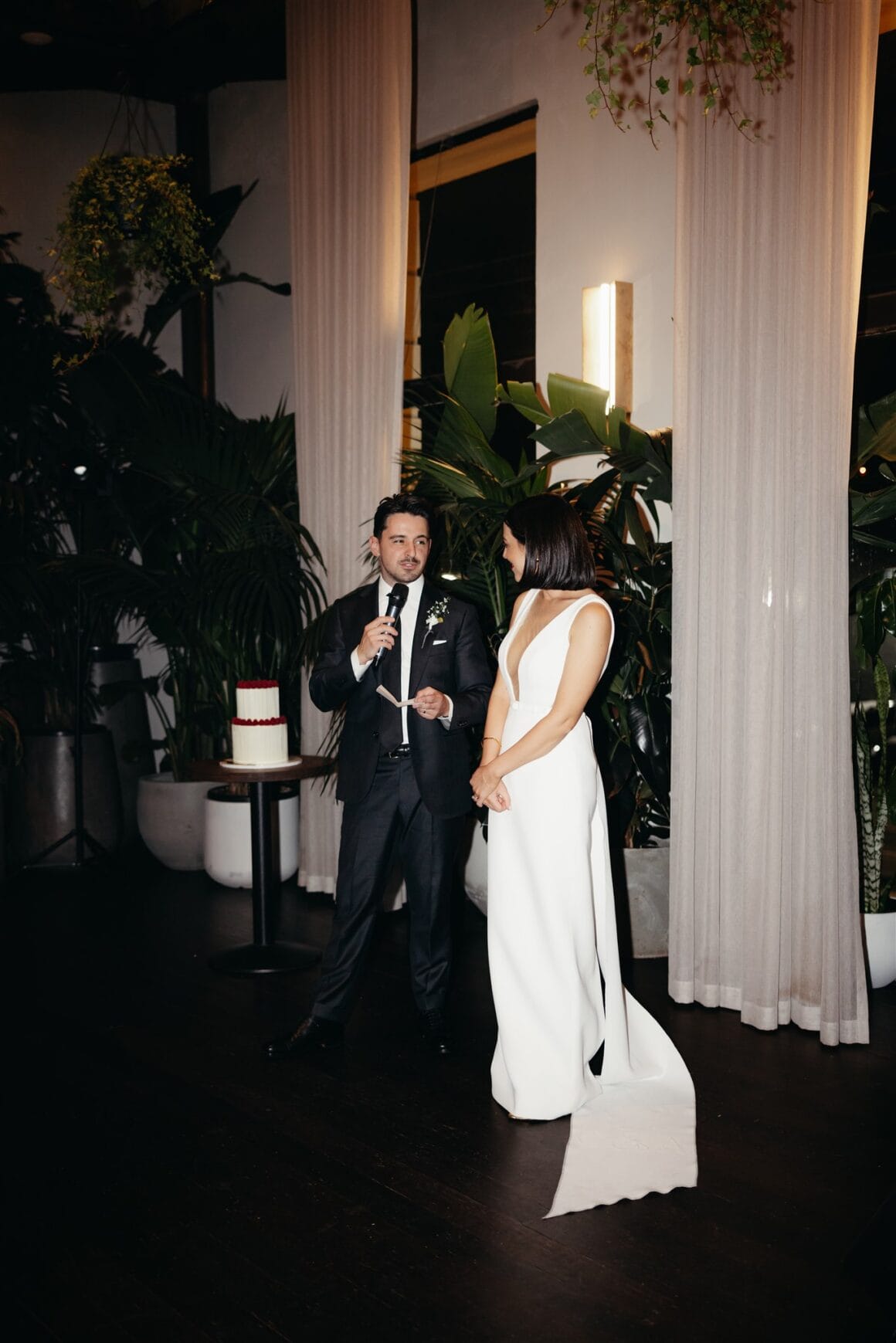 FAVE DETAILS “We had written personal letters to each of our guests. They doubled as seating cards, [thanks to Peppermint Press], and it was such a joy to secretly watch everyone discover there were letters in the envelopes with their names on them. Before we even entered the reception, our phones were buzzing with messages from our friends and family. It hit the brief in making everyone in the room feel as important as we did.”