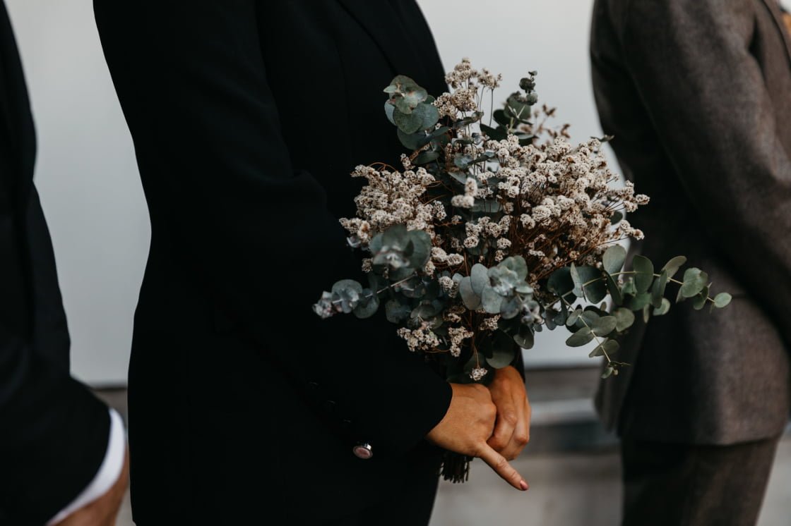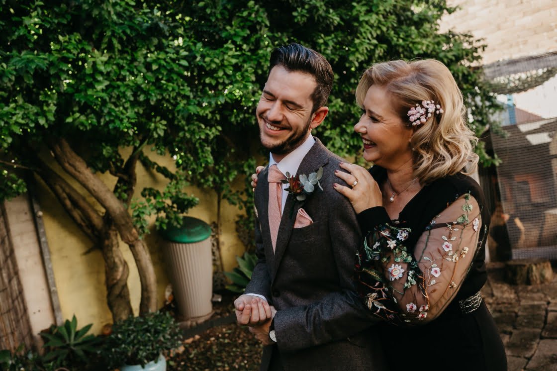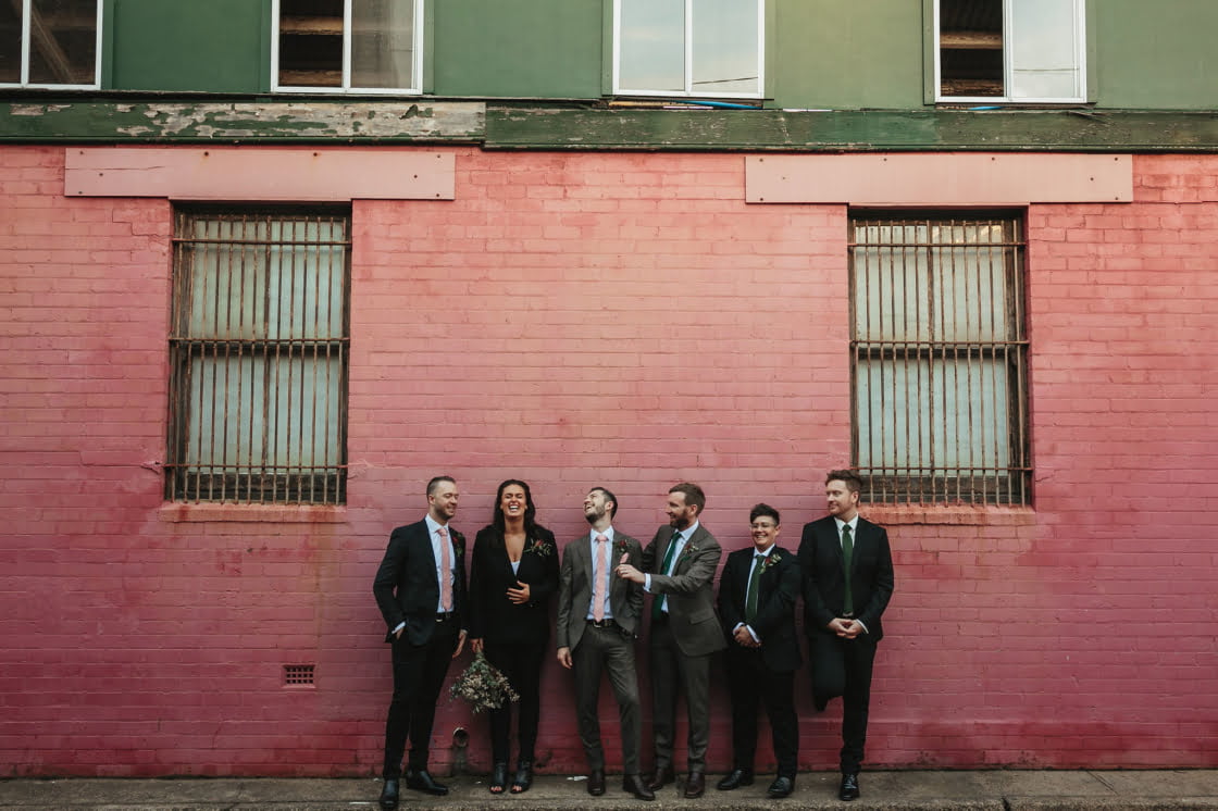 THE SUITS “Our suits were perfect! Noelle from SuitSupply in Martin Place was superb. She knew exactly what we were looking for, made the suits look immaculate and made the experience very enjoyable. We knew from day one that we wanted grey woollen suits. Not a light grey, not a dark grey, but a charcoal marle. When we showed Noelle what we were looking for, she took the lead and got everything sorted, even matched the stitching and lining to match our colour scheme of forest green and pale blush.”