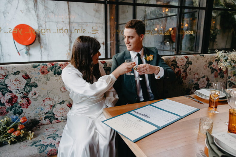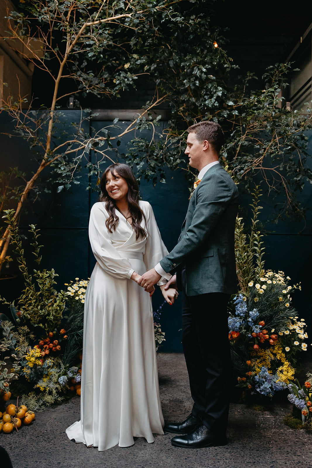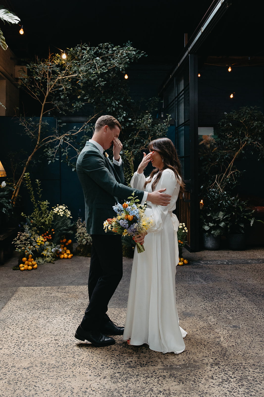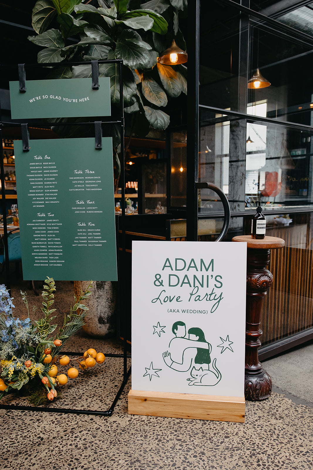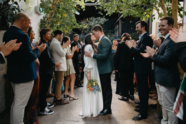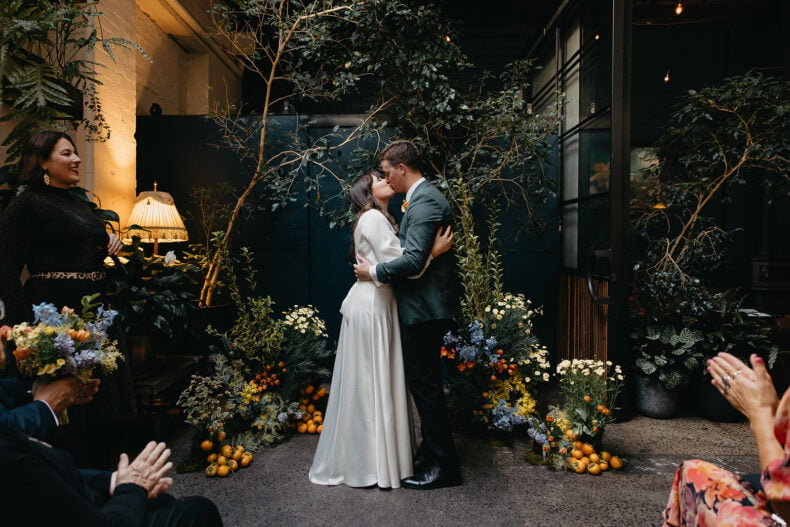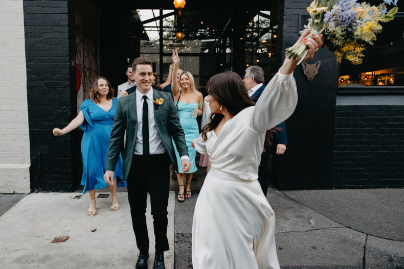 “We briefed our vendors with something like, ‘a casual, fun, indoor jungle, d-floor rager of a love party’ and ran with that vision!” says bride and groom, Dani and Adam, of their epic Melbourne wedding held at one of our favourite venues, Rupert on Rupert. These two lovely humans – together for seven years (as long as their cat Oscar has been alive “so it’s easy to keep track”) – say as a graphic designer and insurance broker, they perfectly balance each other out. “When it came to wedding planning, that meant I was off creating mood boards, designing stationery and briefing vendors with our vision, while Adam was the official master of the spreadsheet and made sure we could afford everything!” laughs Dani.