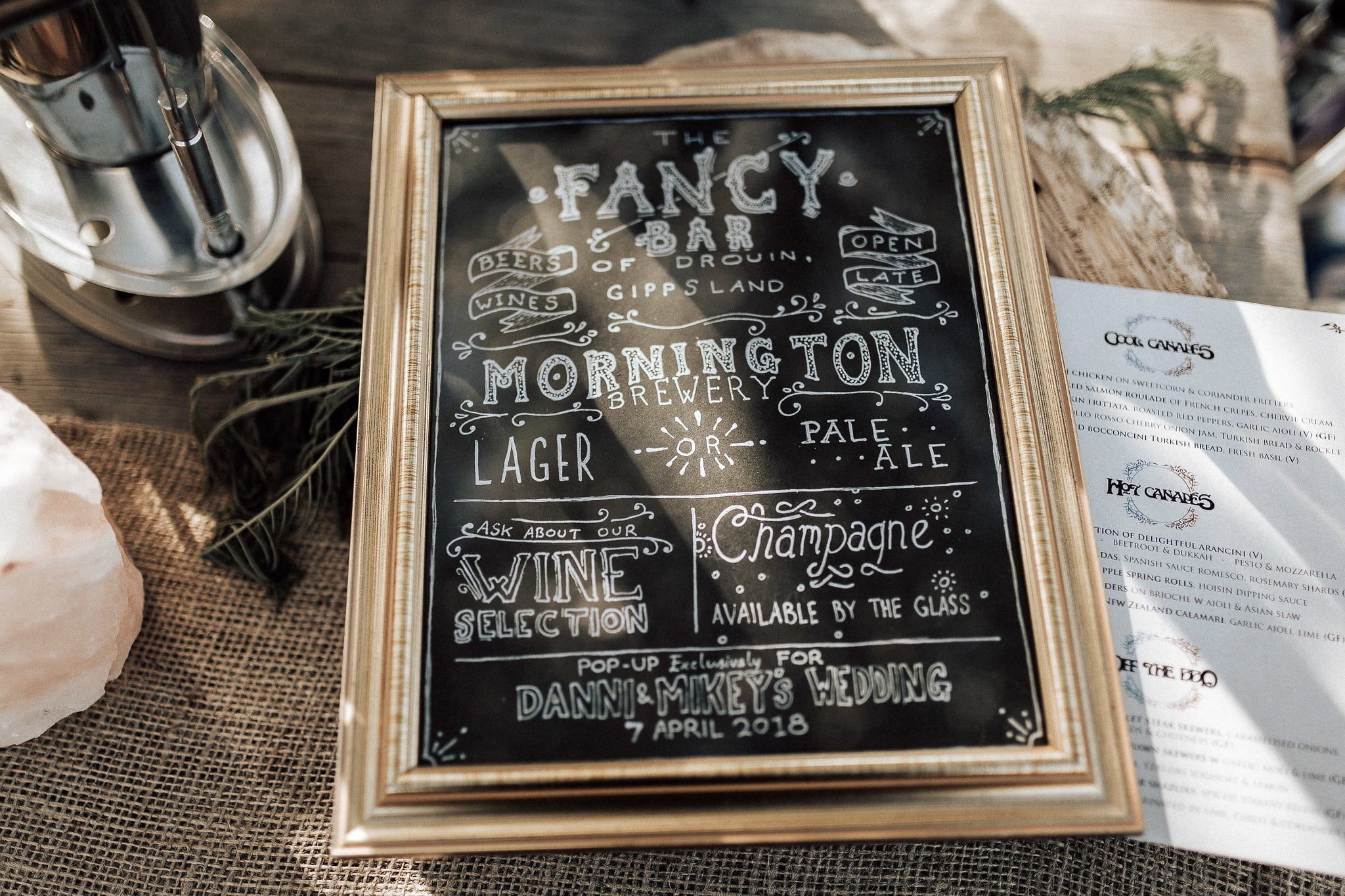 DIY “I made the invites and other printed materials, painted and wrote the signs and decorated. I wanted the invites to really tie in our themes. I took inspiration from an Eric Clapton album artwork from our aisle song, and used design elements from Danni’s ring I had commissioned in the artwork. I then used colours that were included in the table centrepieces, and in the suits and the bridesmaids’ dresses. The design elements in the invite carried over to the wedding favours and the menu cards, drawing everything together.”