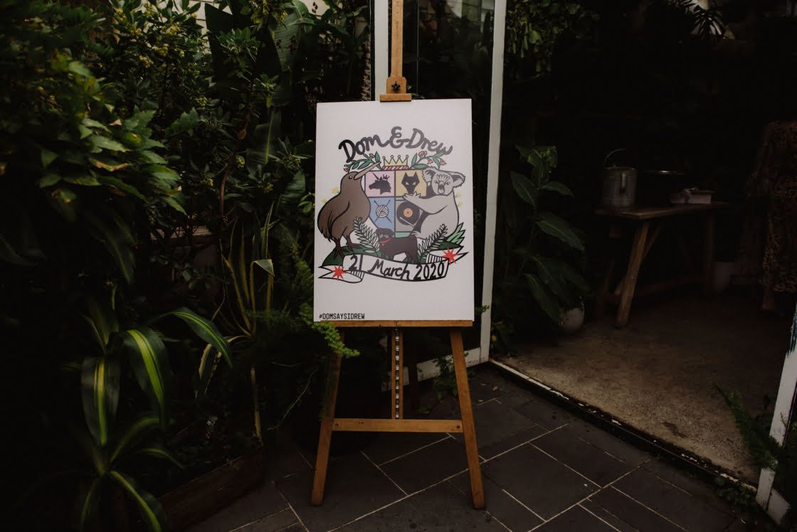 THE VIBE “The theme from the get-go was to do a New Zealand and Australia inspo. Drew is Australian and I am a Kiwi. Our crest was a Kiwi and koala that was designed by Poppy’s Papercuts. The Glasshaus Outside was perfect as I felt that it was the closest look to home as it had so much greenery. It had a lovely feel to it. Our flowers were native foliage of ferns and eucalyptus so it tied in nicely. Our cake toppers that we made was a kiwi bride and a koala groom. And not forget our pug who was on the cake too!”