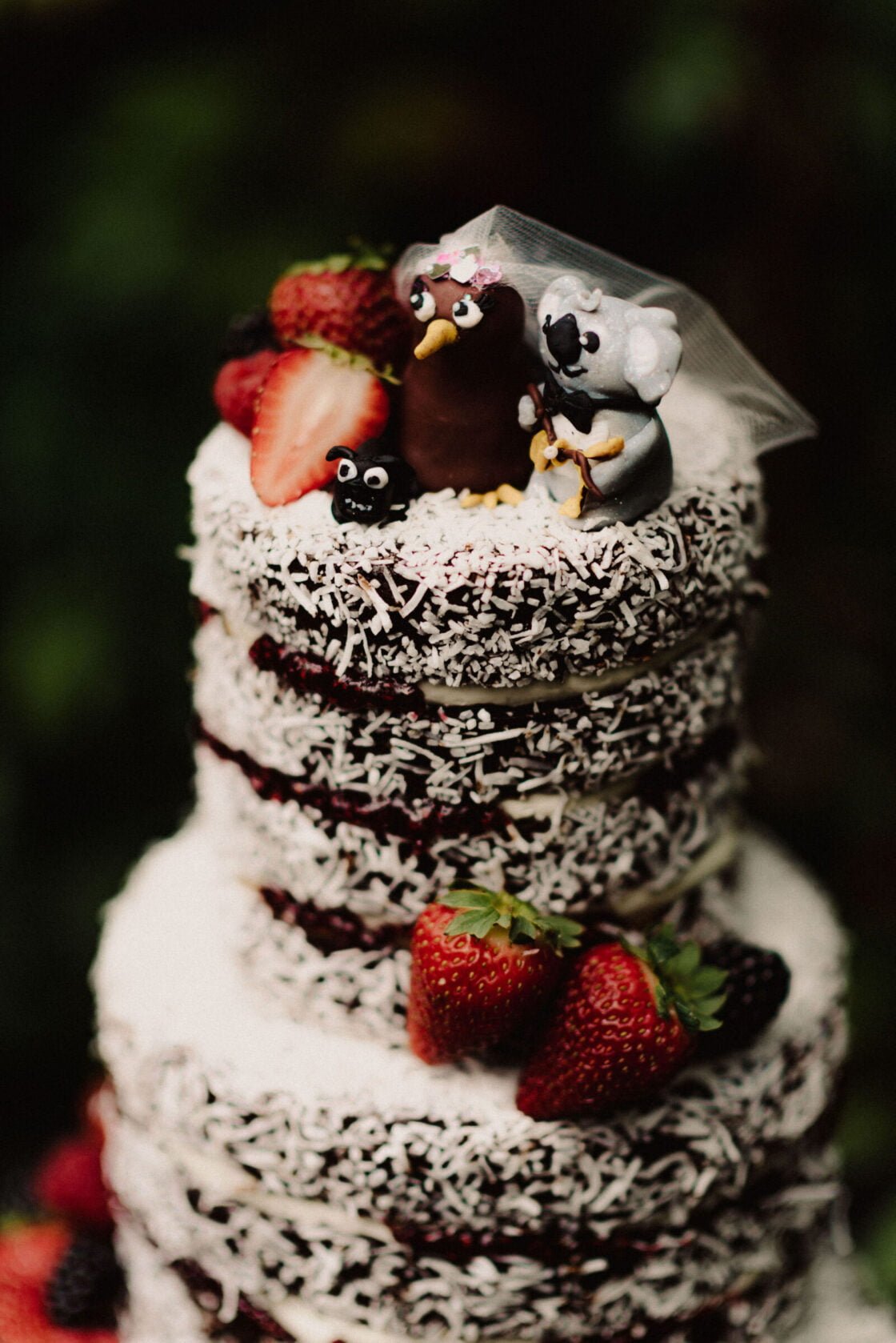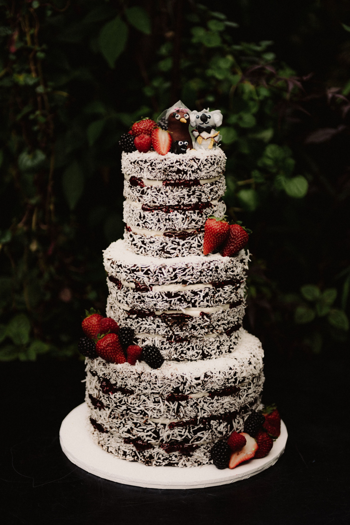THE VIBE “The theme from the get-go was to do a New Zealand and Australia inspo. Drew is Australian and I am a Kiwi. Our crest was a Kiwi and koala that was designed by Poppy’s Papercuts. The Glasshaus Outside was perfect as I felt that it was the closest look to home as it had so much greenery. It had a lovely feel to it. Our flowers were native foliage of ferns and eucalyptus so it tied in nicely. Our cake toppers that we made was a kiwi bride and a koala groom. And not forget our pug who was on the cake too!”