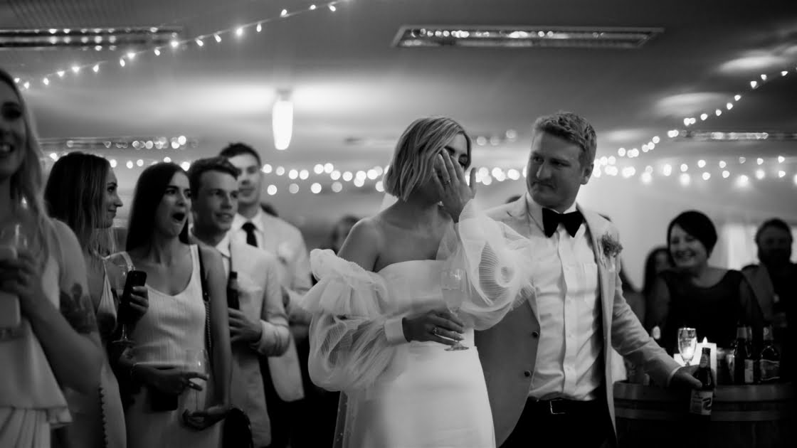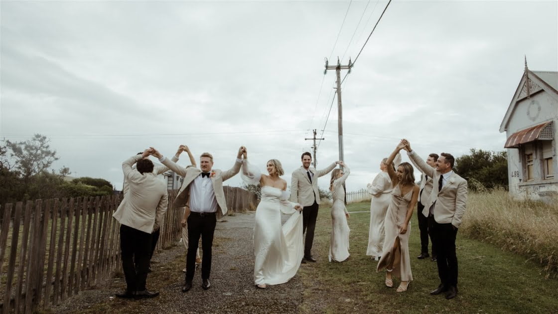 Photographer Flossy Photo Cinematographer Wild Feathers Creative Florist Everbloome (bouquets) Stationery The Printable Shop (invites, details cards) Ceremony MyPlace Accommodation Reception Albany Surf Club Catering Runes Catering Desserts Flo and Co Baked Goods Cake Topper Riverdale Farm (flowers) Wedding favours Lolly Warehouse (self-serve lolly station) Hire Items Albany Event Hire (ceremony seating & champagne glasses) Lighting Hire Ganzer Electrical Sound Hire Rob V Signage Neon Jungle, Bridge & Co Designs Entertainment Rob V Celebrant Sarah Thompson Rings Mark Blyth Fine Jewellery Transport Albany Limousines and Charters THE BRIDE Gown & Veil Christie Nicole Bridal Robes Jasmine and Will Shoes SpendLess Shoes Earrings & bracelet Molten Store Makeup The Temple Boutique Spa Bridesmaid dresses Shona Joy, ASOS, Bec & Bridge Bridesmaid shoes Alias Mae, Sabo Skirt, SpendLess Shoes Bridesmaid gifts Vorfreude Stationery, Jasmine and Will, Go-To via Mecca, Sweet Little Scent THE GROOM Jacket Joe Black via David Jones Shirt & Pants The Hub on York Shoes Mainstreet Shoes and Bags Groomsmen suits Joe Black, The Hub on York