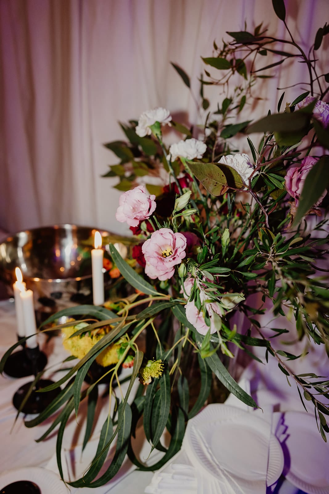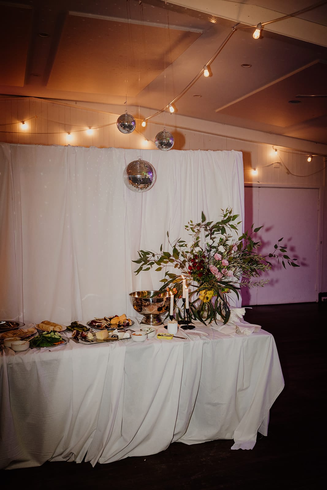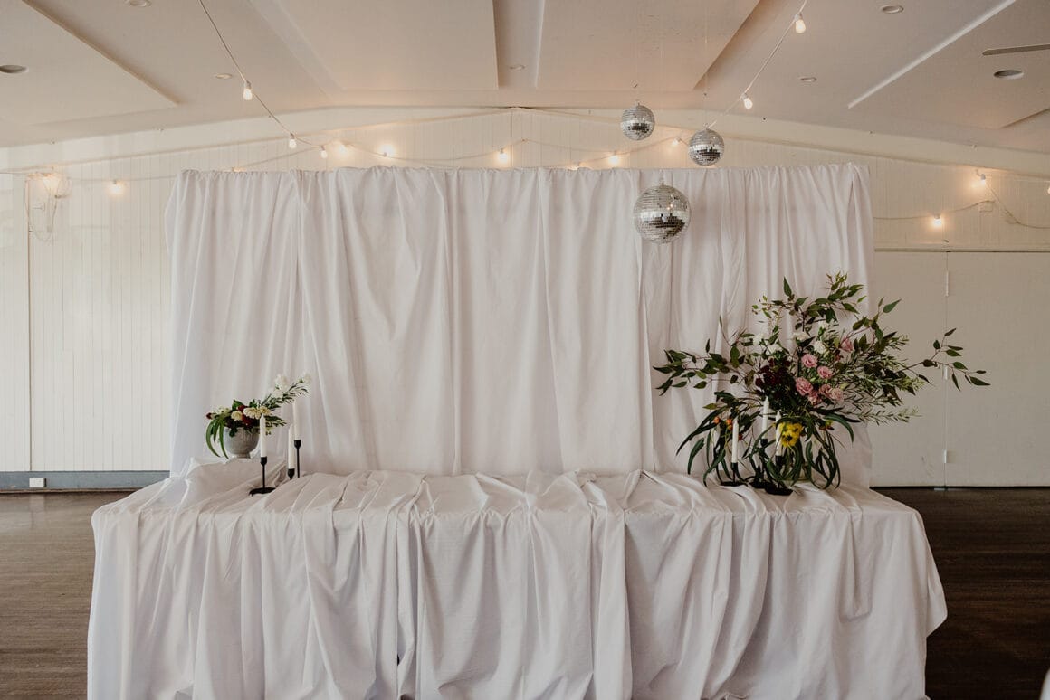 “The majority of our wedding was DIY. The biggest task by far was creating the backdrops. Since we had a smaller guest list, we wanted to make the large hall feel more intimate. With a lot of help from my parents, we used temporary fencing and around 100 metres of fabric to create draped walls, a backdrop for the cheese table, and tablecloths. Over the course of six months, we also collected all the vases and silver platters from op shops and friends. Brad did an amazing job with the signage, too.”