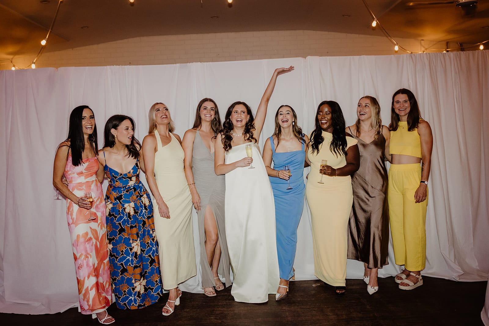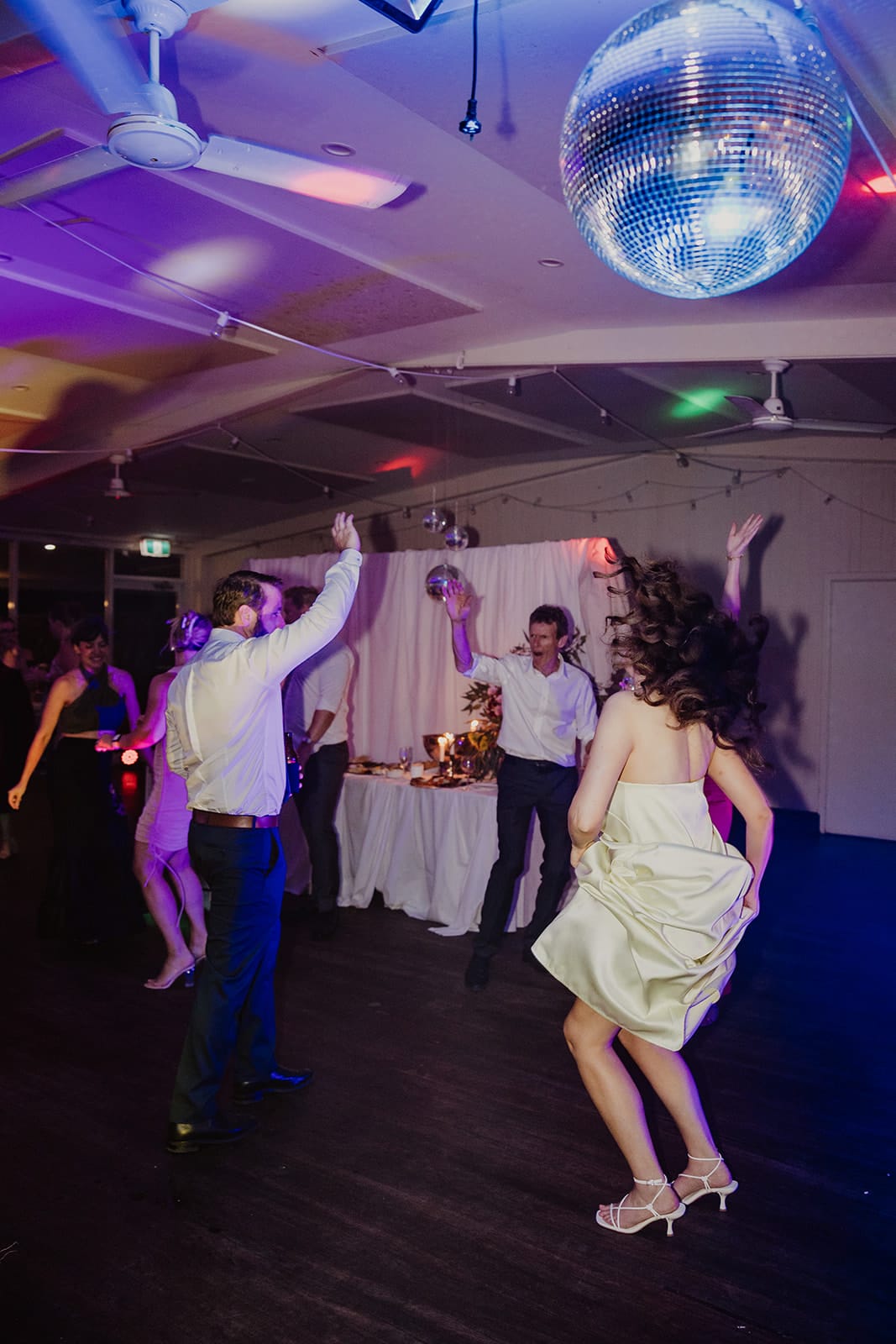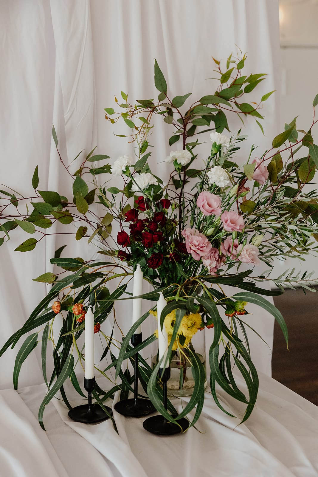 “The majority of our wedding was DIY. The biggest task by far was creating the backdrops. Since we had a smaller guest list, we wanted to make the large hall feel more intimate. With a lot of help from my parents, we used temporary fencing and around 100 metres of fabric to create draped walls, a backdrop for the cheese table, and tablecloths. Over the course of six months, we also collected all the vases and silver platters from op shops and friends. Brad did an amazing job with the signage, too.”