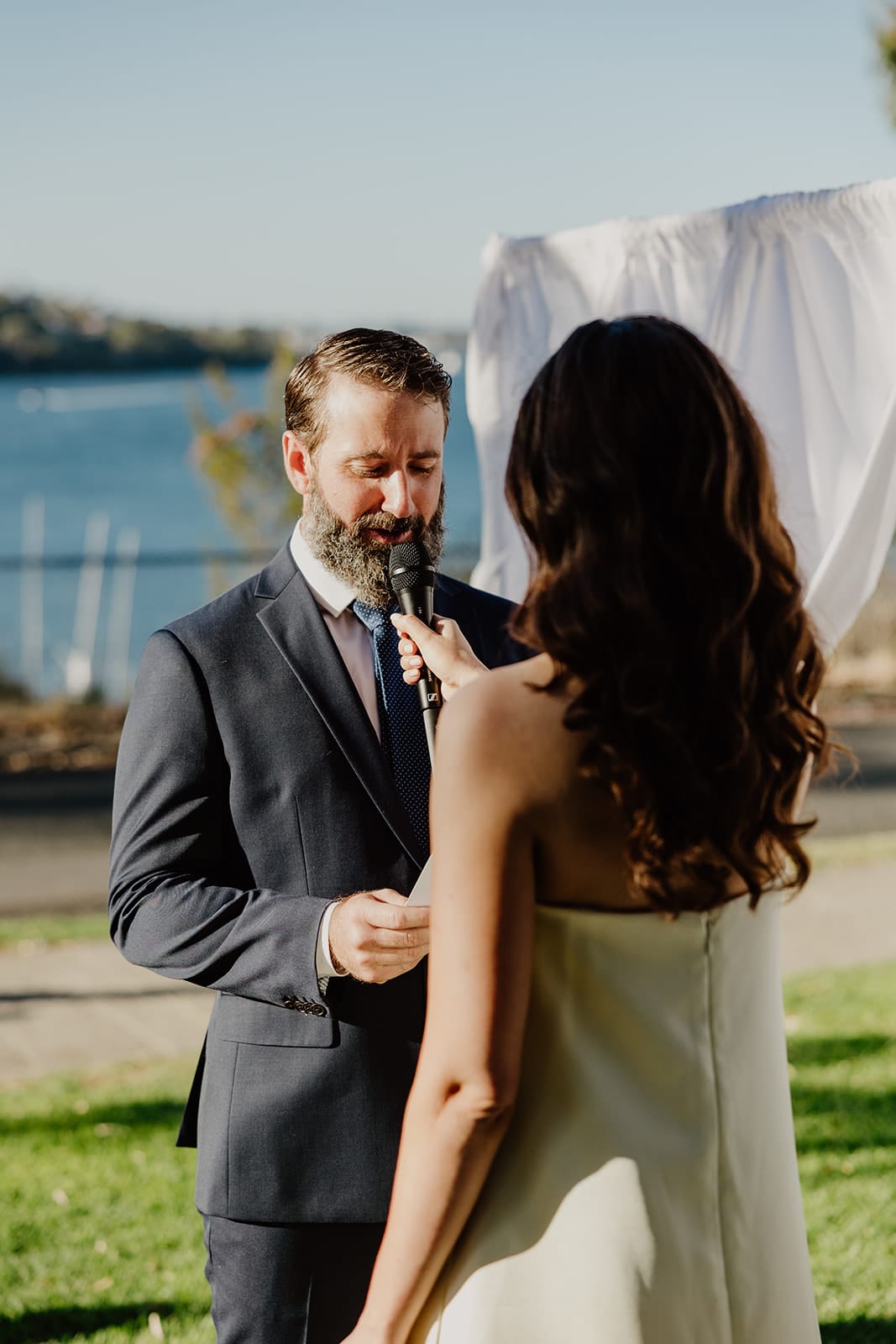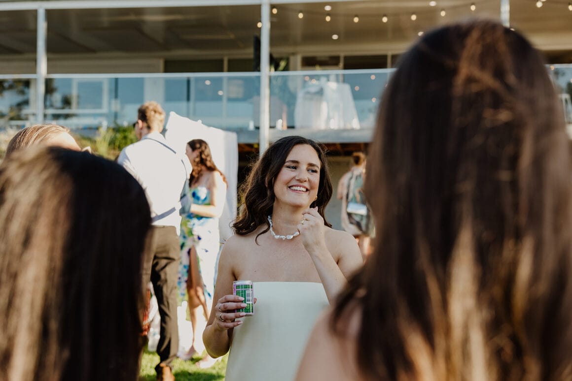 “Guests had started arriving while my family was still trying to set up our ceremony backdrop, which kept blowing over in the wind! My poor brother was running around in shorts, trying to help fix it in time. In the end, they had to cut the fabric down the middle and wrap it around the frame to make it stay put. It wasn’t the original plan, and it ended up uneven, but it was there and it gave us all a good laugh.”